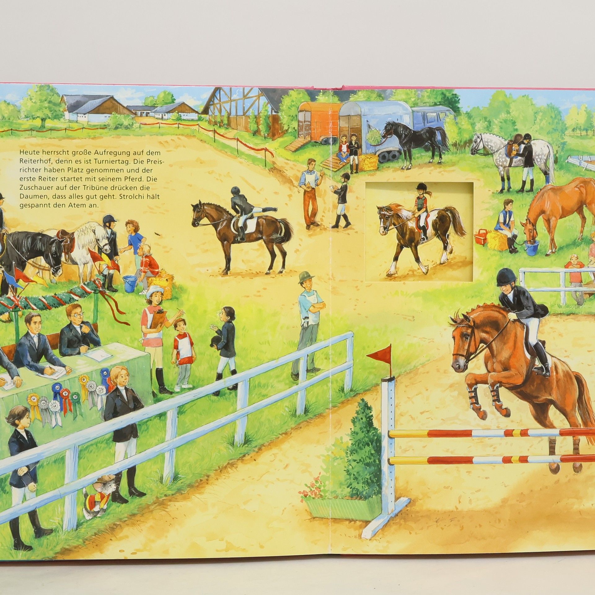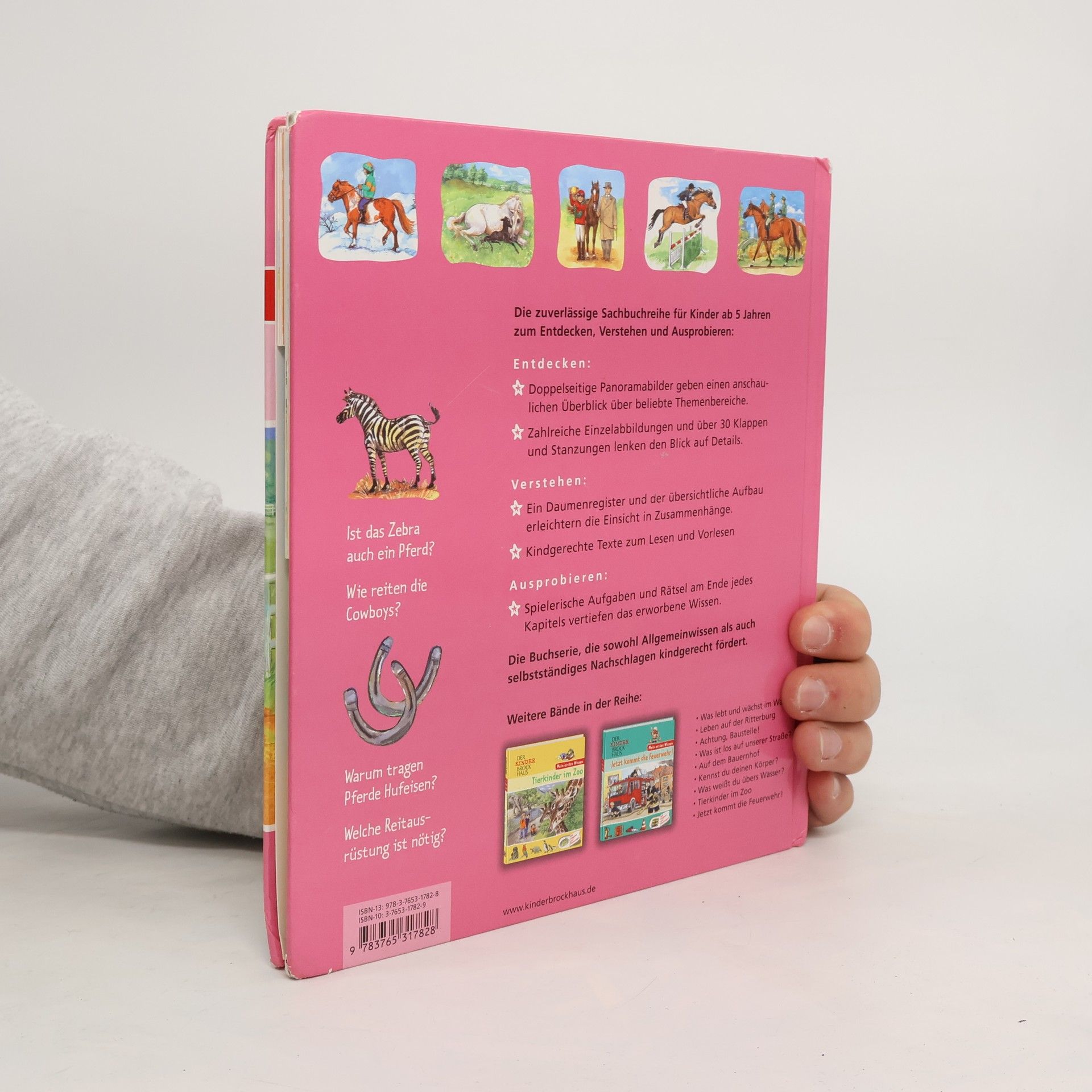 Die Sachbuchserie „Mein erstes Wissen“ arbeitet nach dem dreigliedrigen Konzept: entdecken - verstehen - ausprobieren. Doppelseitige Panoramabilder zu Beginn jedes Kapitels geben einen ersten Überblick über den Themenbereich. Im zweiten Schritt lenken leicht verständliche Texte, zahlreiche Abbildungen und über 30 Klappen und Stanzungen den Blick auf Details. Im Anschluss helfen spielerischen Aufgaben und Rätsel dabei, das neu erworbene Wissen zu vertiefen und selbstständig anzuwenden. Der Band Pferde und Ponys erklärt auf kindgerechte Weise, warum Pferde Hufeisen tragen, was eigentlich „nachgurten“ bedeutet, was Ponys gerne fressen oder wie Cowboys reiten. Hier erfahren Pferdenarren in den vier Kapiteln „Rund ums Pferd“, „Stall und Wiese“, „Reiten und Turniere“ und „Pferde bei der Arbeit“ alles über ihre Lieblingstiere und über das Reiten.