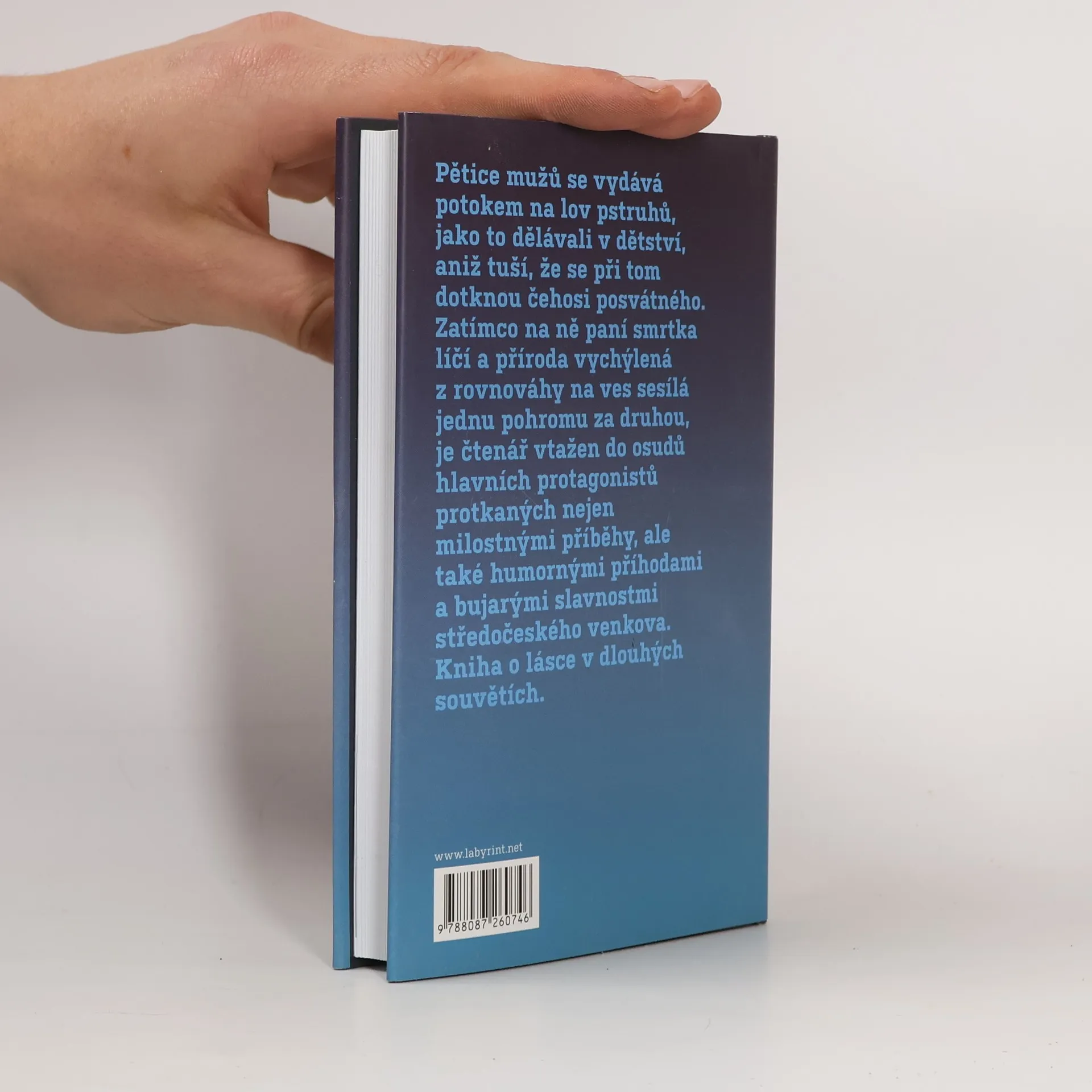 Pětice mužů se vydává potokem na lov pstruhů, jako to dělávali v dětství, aniž tuší, že se při tom dotknou čehosi posvátného. Zatímco na ně paní smrtka líčí a příroda vychýlená z rovnováhy na ves sesílá jednu pohromu za druhou, je čtenář vtažen do osudů hlavních protagonistů protkaných nejen milostnými příběhy, ale také humornými příhodami a bujarými slavnostmi středočeského venkova. Kniha o lásce v dlouhých souvětích. Po románovém debutu Doživotí, který na české literární scéně vzbudil značný rozruch, přichází Martin Jun s knihou tematicky i stylisticky odlišnou. S vypravěčskou suverenitou čtenáři předkládá bohatou mozaiku ze života v zapomenuté vísce, kde je pomíjivosti jednotlivce nadřazená sounáležitost k obci a kde mají své nezastupitelné místo pověry, mýty a předsudky. Realitou pro vesničany není to, co se doopravdy odehrálo, ale co si o tom mezi sebou povídají.