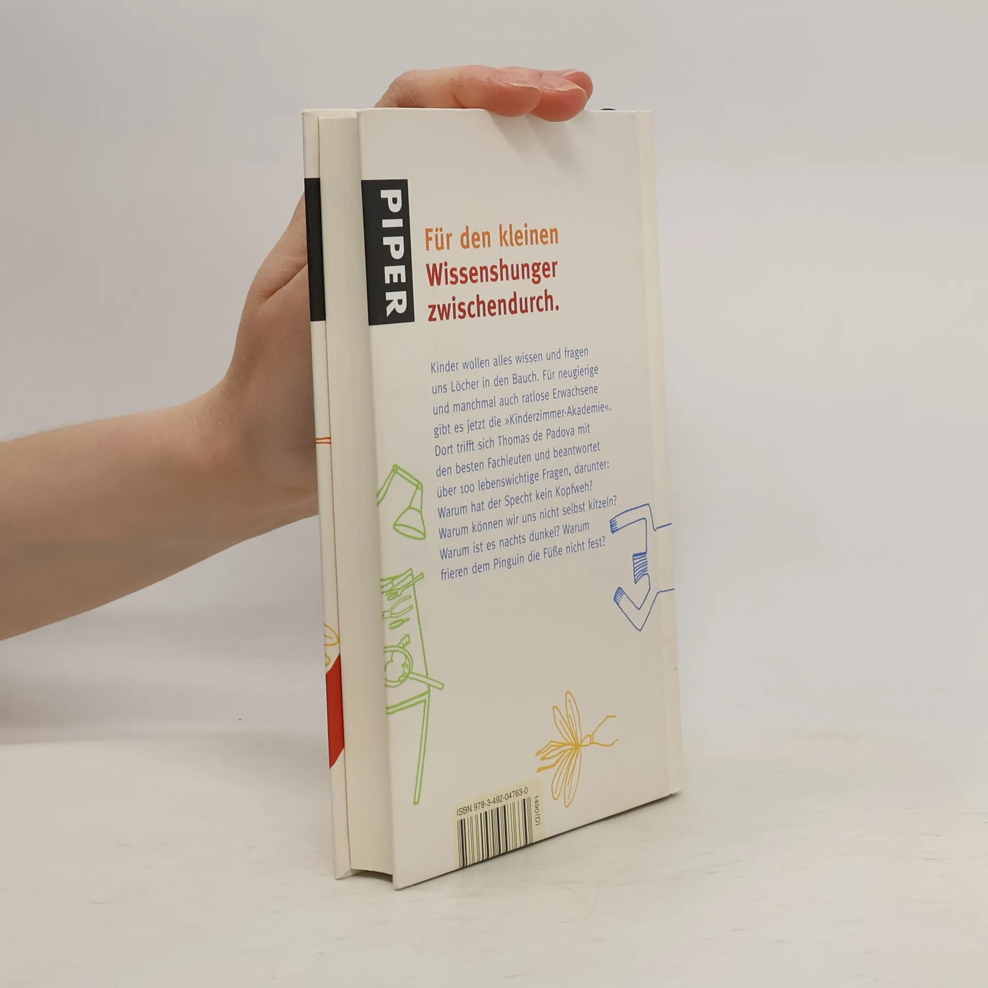Warum bekommt der Specht kein Kopfweh? Warum können wir uns nicht selbst kitzeln? Warum ist es nachts dunkel? Und warum frieren dem Pinguin die Füße nicht fest? Wenn Kinder dies fragen, geraten Eltern oft ins Schwitzen. Thomas den Padovas »Kinderzimmer-Akademie« schafft Abhilfe. Gemeinsam mit den besten Fachleuten beantwortet er 100 lebenswichtige Fragen und erklärt warum sich Uhrzeiger rechtsherum drehen und Glühwürmchen nicht heiß wird.