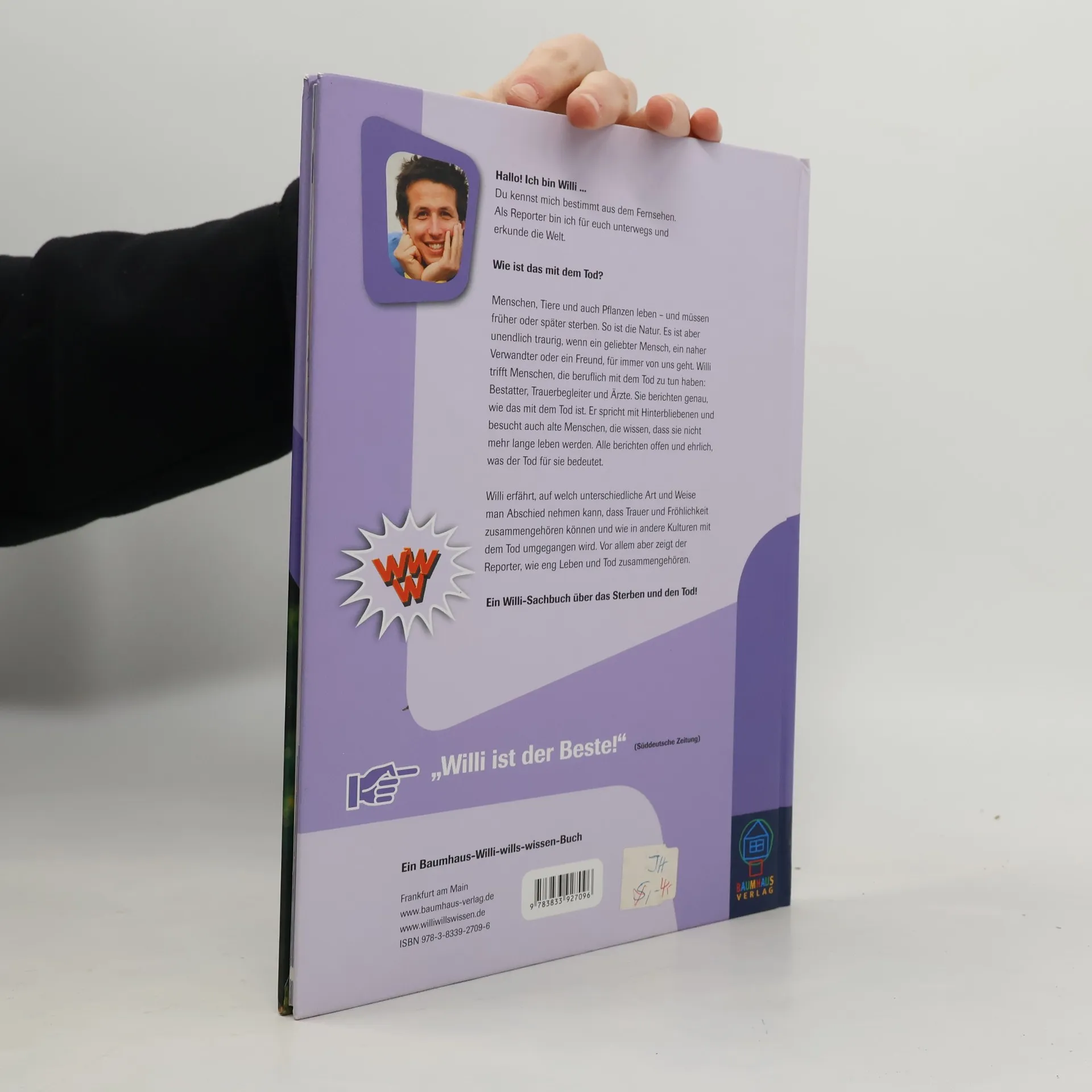 Willi will etwas über ein sehr schwieriges Thema erfahren: den Tod. Alles, was lebt, muss irgendwann sterben; Pflanzen, Tiere - und auch Menschen. Dennoch ist es unendlich schwierig, wenn ein geliebter Mensch stirbt. Willi trifft Bestatter, Pfarrer oder Ärzte, die viel zum Thema zu erzählen haben. Er spricht mit Trauernden, die jemanden verloren haben, den sie geliebt haben. Und er trifft Kranke, die wissen, dass sie nicht mehr lange leben. Jeder Befragte erzählt offen, was der Tod für ihn bedeutet. Willi stellt fest: Angst und Unsicherheit bestimmen die Gefühle. Zwei Hilfsmittel: Reden und Zuhören. Nur wenn der Tod nicht tot geschwiegen wird, geht das Leben weiter. Willi - Best- und Longseller im Buch und im TV Willi wills wissen ist eine der bekanntesten und erfolgreichsten Kindersendungen im deutschen Fernsehen! Willi wills wissen bietet allerbeste Informationen für Kinder! Willi wills wissen hat zahlreiche Auszeichnungen erhalten, u. a. den Erich-Kästner- Fernsehpreis, den Bayerischen Fernsehpreis und das Comenius-Siegel