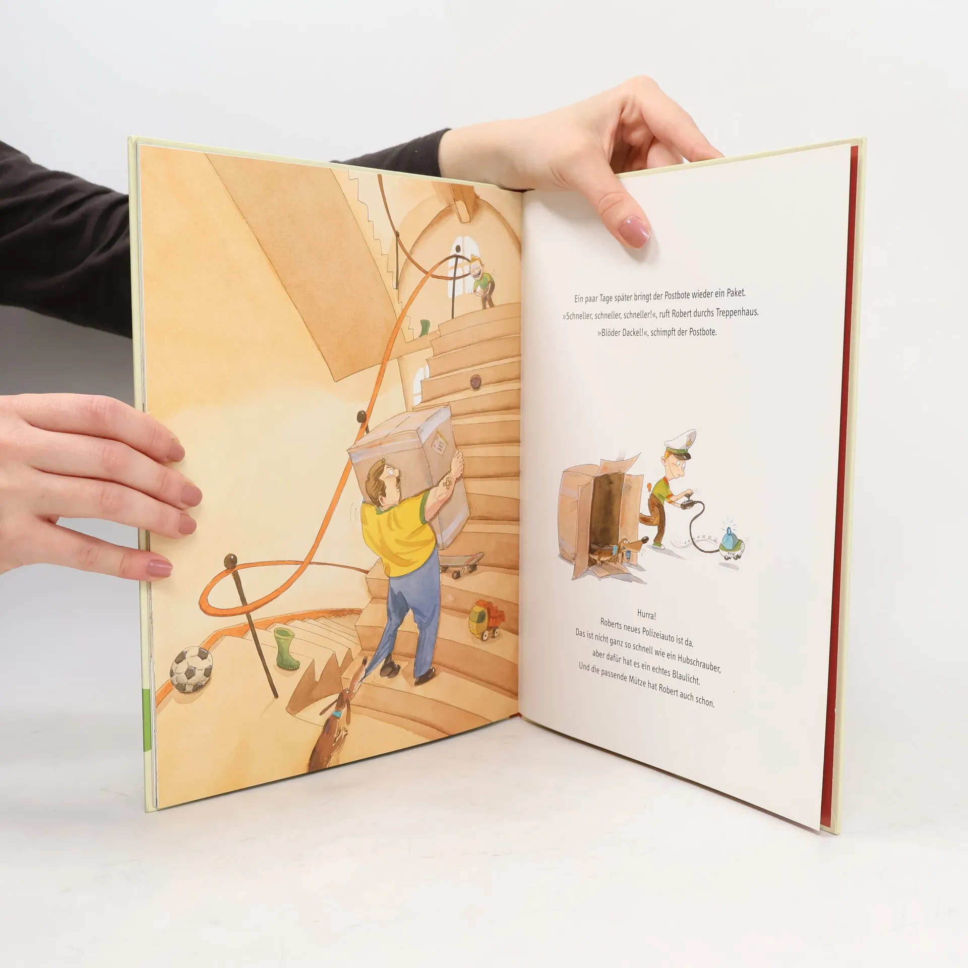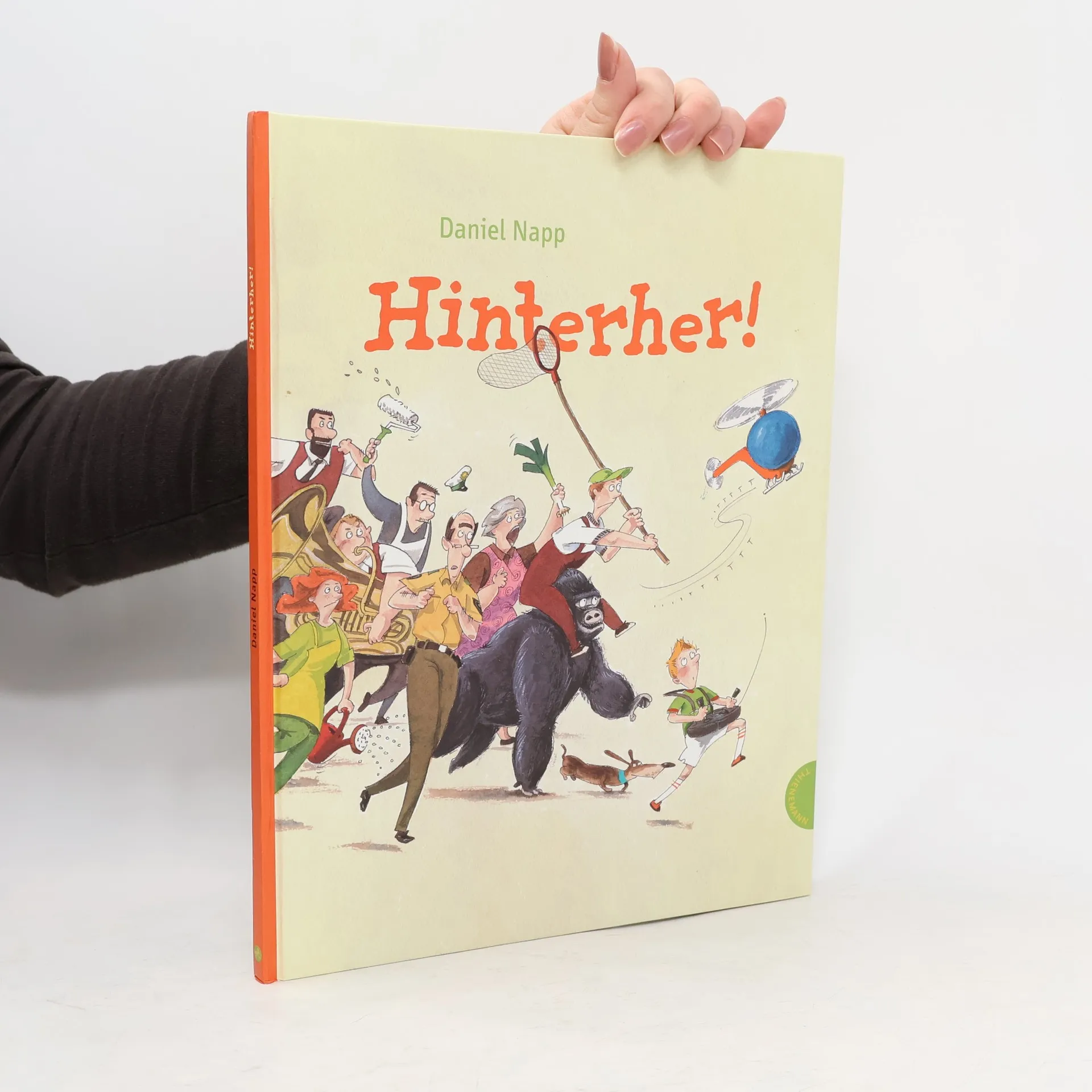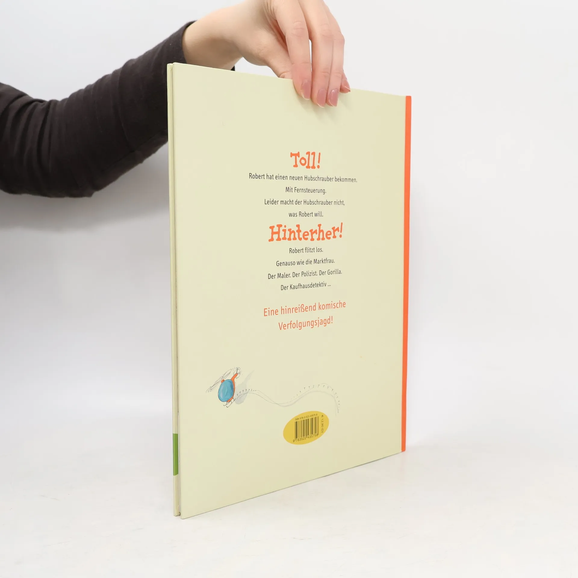Toll! Robert hat einen neuen Hubschrauber bekommen. Mit Fernsteuerung. Leider macht der Hubschrauber nicht, was Robert will. Hinterher! Robert flitzt los. Genauso wie die Marktfrau. Der Maler. Der Polizist. Der Gorilla. Der Kaufhausdetektiv. Eine hinreißend komische Verfolgungsjagd für Kinder ab 4 Jahren