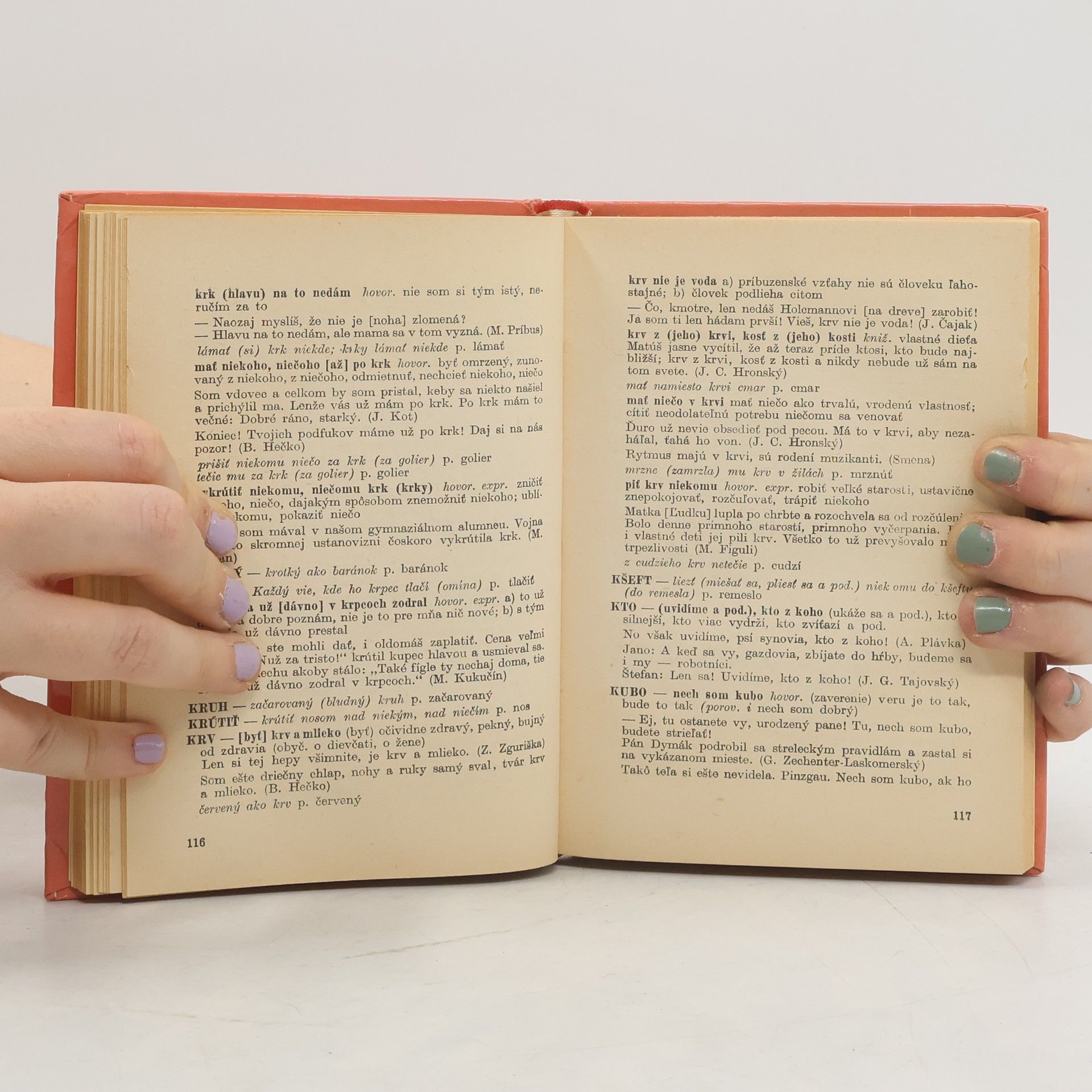 Slovník obsahuje výber slovenských frazeologických jednotiek usporiadaných podľa istých slovníkových zásad. Odlišuje sa tým, že heslami nie sú jednotlivé slová usporiadané podľa abecedy ale celé slovné spojenia-takzvané frazeologické jednotky. Do frazeológie zaraďujeme aj ustálené prirovnania alebo príslovia a porekadlá a im blízke útvary. Druhé vydanie. Cena knihy v čase vydania: 22.- Kčs.