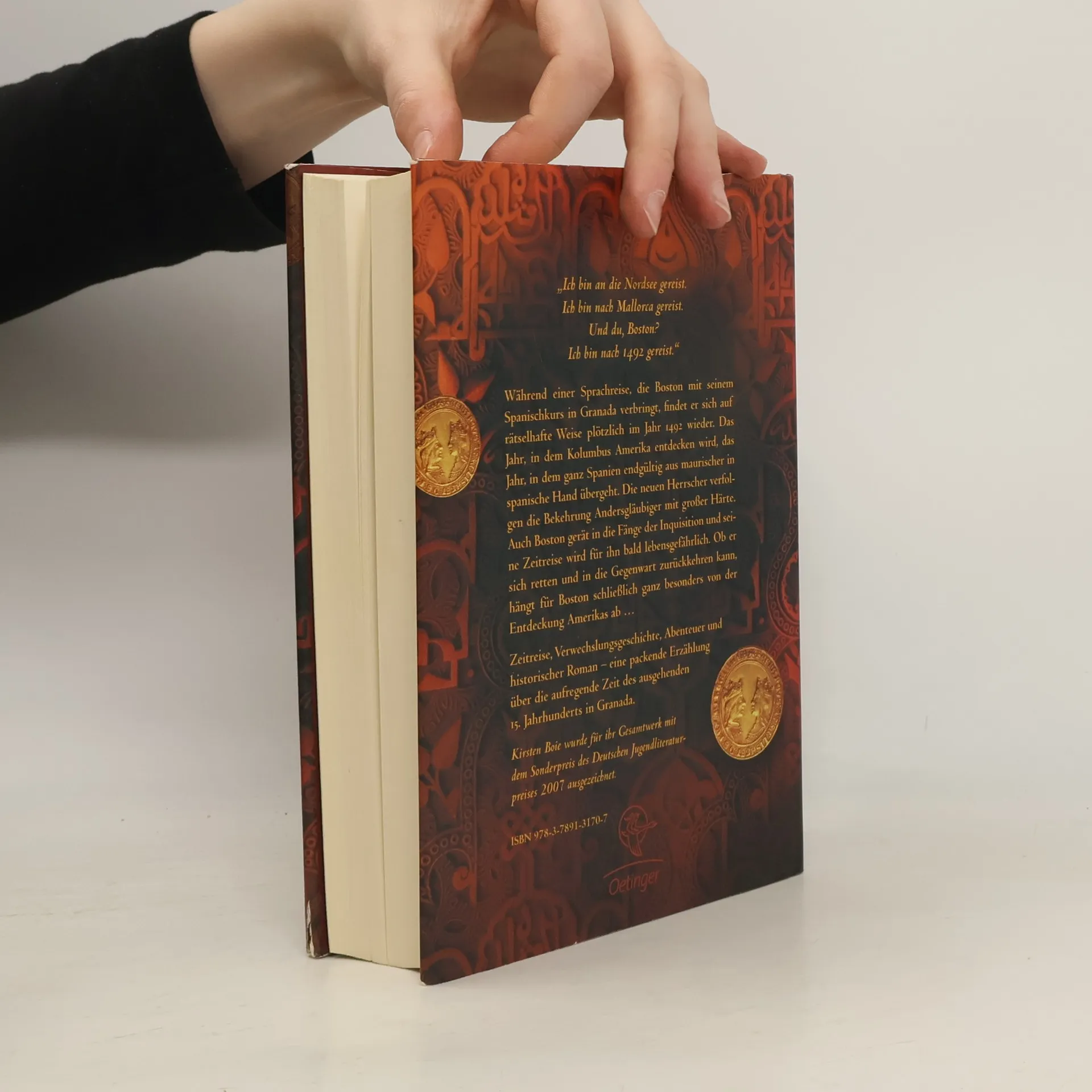 Granada, 1492. Ein Tor in der Zeit und plötzlich verändert sich die Welt …Gerade war Boston noch mit seinen Mitschülern auf dem arabischen Seidenmarkt in Granada. Plötzlich ist alles anders: Durch ein Tor in der Zeit ist Boston im Jahr 1492 gelandet. Dort wird es für ihn lebensgefährlich. Er erweckt Misstrauen am spanischen Königshof und auf der Alhambra gerät er in die grausamen Fänge der Inquisition. Doch zwei neue Freunde, Tariq und Salomon, als Muslim und Jude selbst bedroht, stehen ihm in dieser fast ausweglosen Situation bei. Aber die Rückkehr Bostons hängt nicht nur davon ab, ob er den Schlüssel zur Gegenwart findet, sondern auch von der Entdeckung Amerikas …
