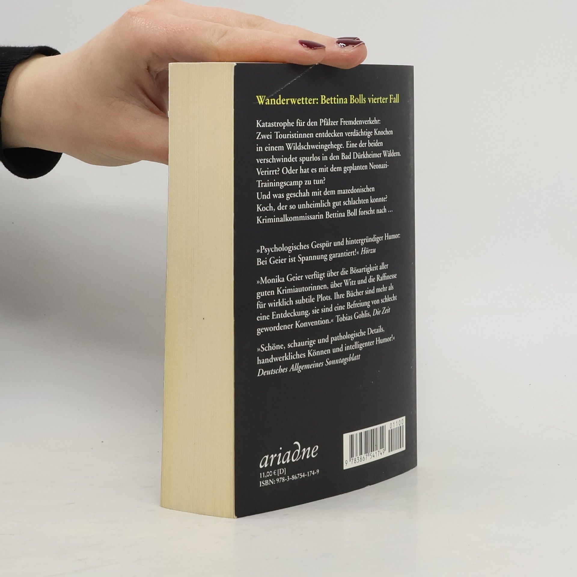 Katastrophe für den Pfälzer Fremdenverkehr: Zwei Touristinnen entdecken verdächtige Knochen in einem Wildschweingehege. Eine der beiden verschwindet spurlos in den Bad Dürkheimer Wäldern. Verirrt? Oder hat es mit dem geplanten Neonazi-Trainingscamp zu tun? Und was geschah mit dem mazedonischen Koch, der so unheimlich gut schlachten konnte? Kriminalkommissarin Bettina Boll forscht nach ...