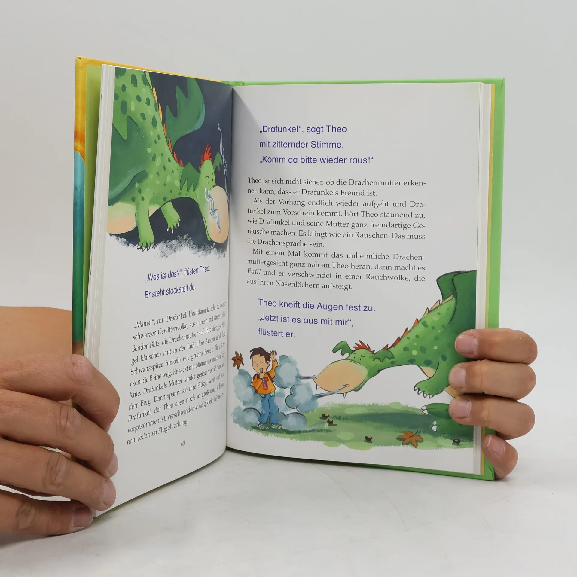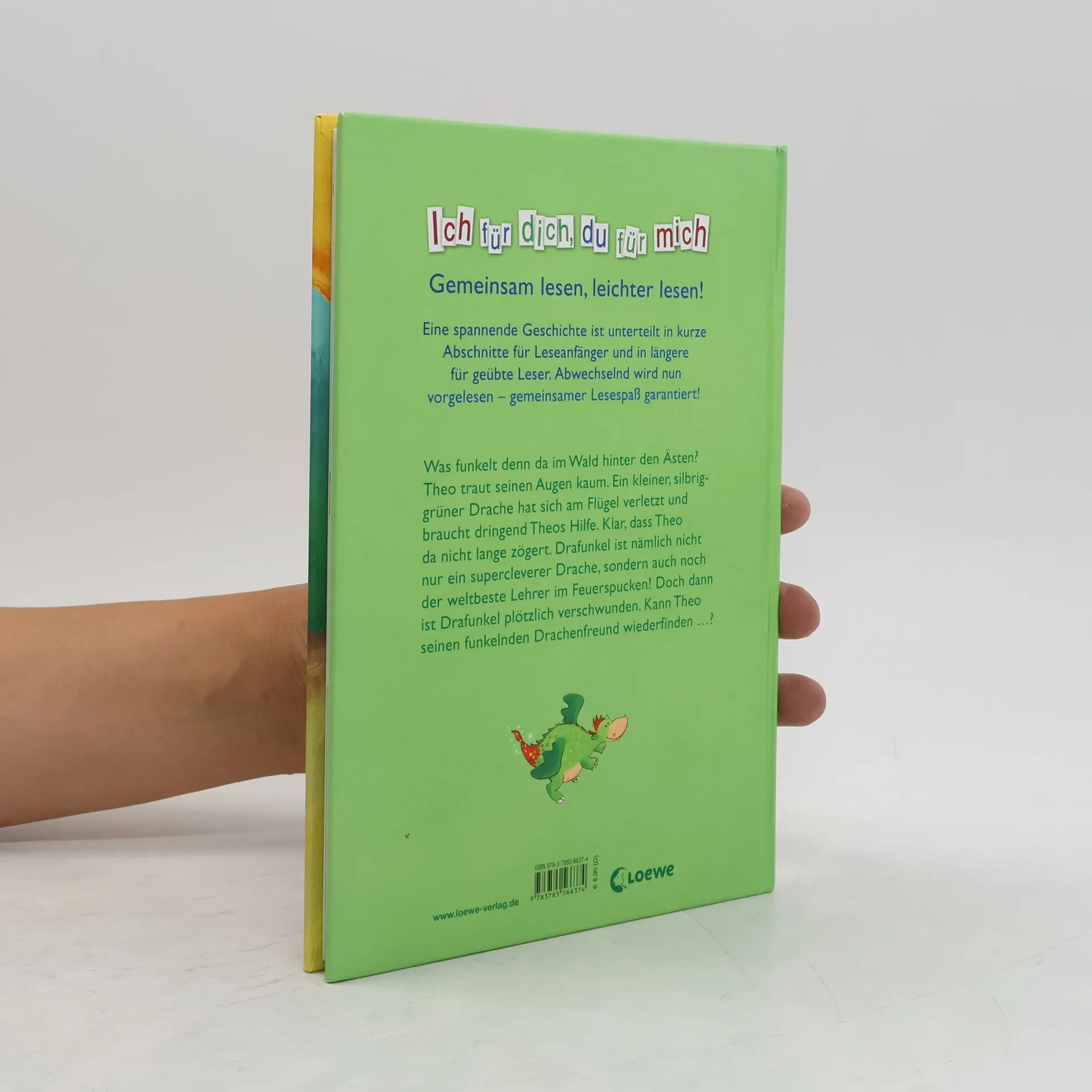 Was funkelt denn da im Wald hinter den Ästen? Theo traut seinen Augen kaum. Ein kleiner, silbrig-grüner Drache hat sich am Flügel verletzt und braucht dringend Theos Hilfe. Klar, dass Theo sofort zur Stelle ist. Vor allem, weil Drafunkel nicht nur ein supercleverer Drache ist, sondern auch noch der weltbeste Lehrer im Feuerspucken! Doch dann ist Drafunkel plötzlich verschwunden. Kann Theo seinen Drachenfreund wiederfinden.? Wie in einem Rollenspiel wird diese abgeschlossene Geschichte in mehreren Kapiteln gelesen. Während Erwachsene den Part des Erzählers und anderer Figuren vorlesen, übernimmt der Leseanfänger die Rolle des Protagonisten und liest dessen Part vor. Durch das gemeinsame Lesen und Betrachten der liebenswerten Illustrationen wird so der Spaß am Lesen geweckt.