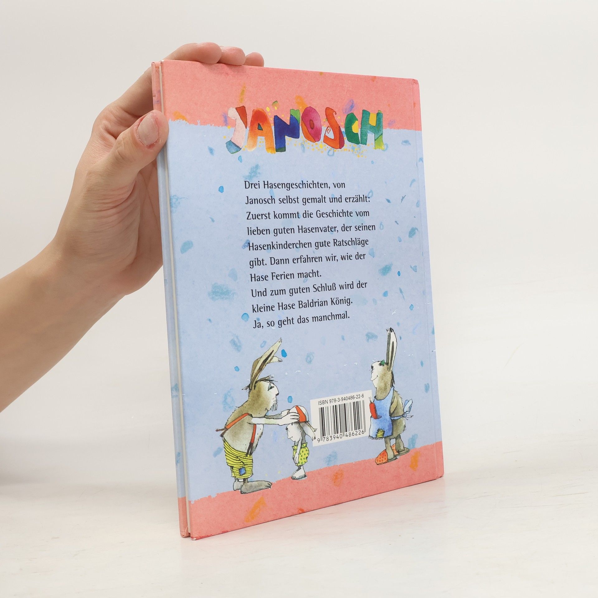 Drei Hasengeschichten, von Janosch selbst gemalt und erzählt: Zuerst kommt die Geschichte vom lieben guten Hasenvater, der seinen Hansenkinderchen gute Ratschläge gibt. Dann erfahren wir, wie der Hase Ferien macht. Und zum guten Schluß wird der kleine Hase Baldrian König. Ja, so geht das manchmal.