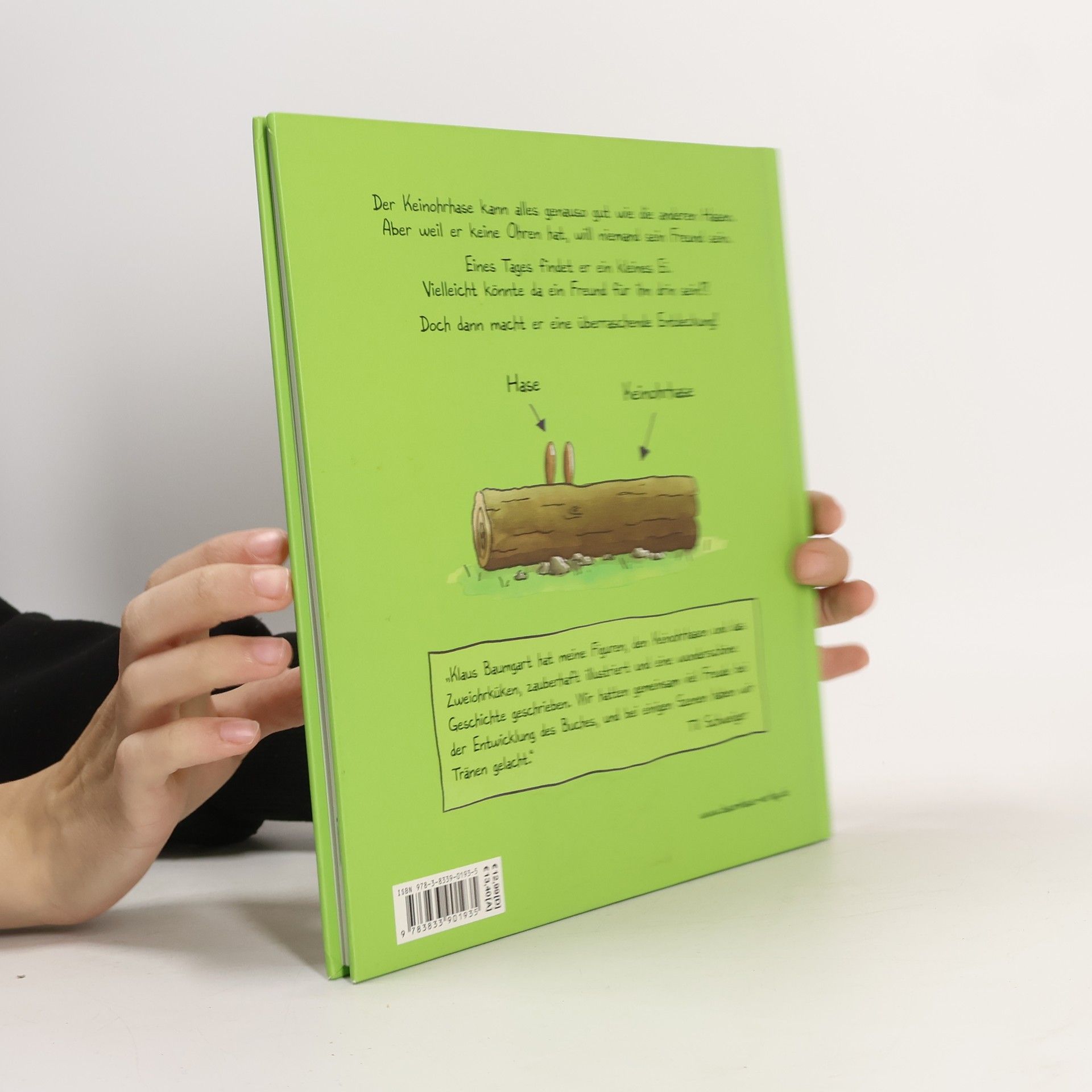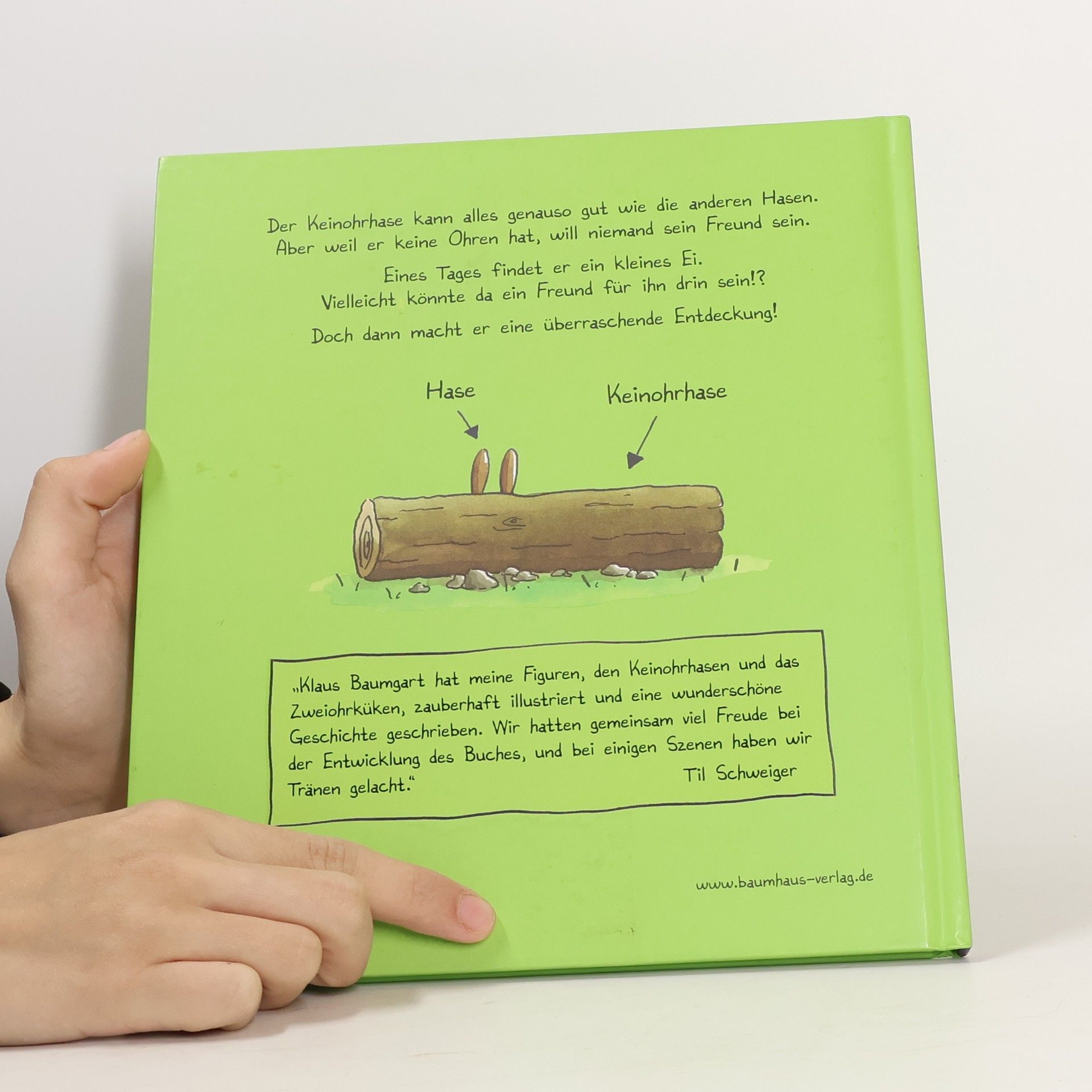 Der Keinohrhase kann alles genauso gut wie die anderen Hasen. Aber weil er keine Ohren hat, will niemand sein Freund sein und er ist daher sehr traurig. Eines Tages findet er ein kleines Ei. Wem mag es gehören? Vielleicht könnte da ein Freund für ihn drin sein? Dann macht er eine überraschende Entdeckung... Erfolgsautor Klaus Baumgart (Erfinder von Lauras Stern) hat in Zusammenarbeit mit Til Schweiger (Vater des Keinohrhasen) ein wunderbares Bilderbuch geschaffen, in dem er die herzergreifende Geschichte der zwei liebevollen Figuren erzählt.