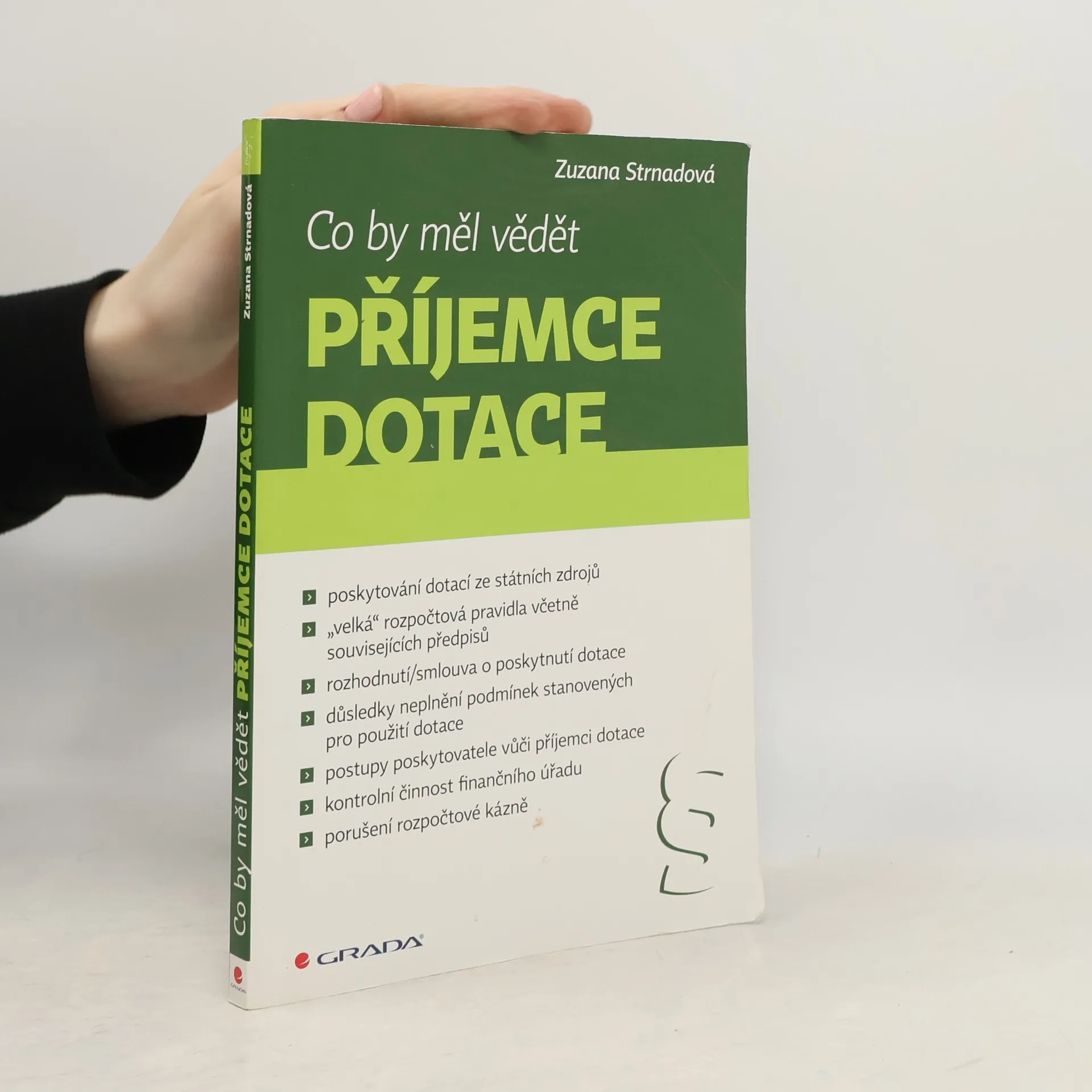 Být příjemcem dotace není snadné - s čerpáním dotace je totiž spojeno velké množství úkolů, které je příjemce dotace povinen splnit. Kniha jako jediná na trhu podává ucelenou informaci o tom, co by příjemce dotace měl vědět, na co by si měl dát pozor a jak by měl postupovat či co může očekávat v případě, že se dostane do problémů s plněním povinností spojených s čerpáním dotace. Kniha poskytne informace o postupech poskytovatele ve vztahu k příjemci dotace v případě, že je zjištěno neplnění povinností ze strany příjemce dotace a o postupech finančního úřadu ve vztahu k příjemci dotace při prověřování případného porušení rozpočtové kázně a stanovení následných „sankcí“. Kniha je určena pro příjemce dotací ze státních zdrojů, tj. státního rozpočtu včetně evropského spolufinancování, státních finančních aktiv, Národního fondu a státních fondů (v režimu zákona č. 218/2000 Sb., o rozpočtových pravidlech a o změně některých souvisejících zákonů (rozpočtová pravidla).