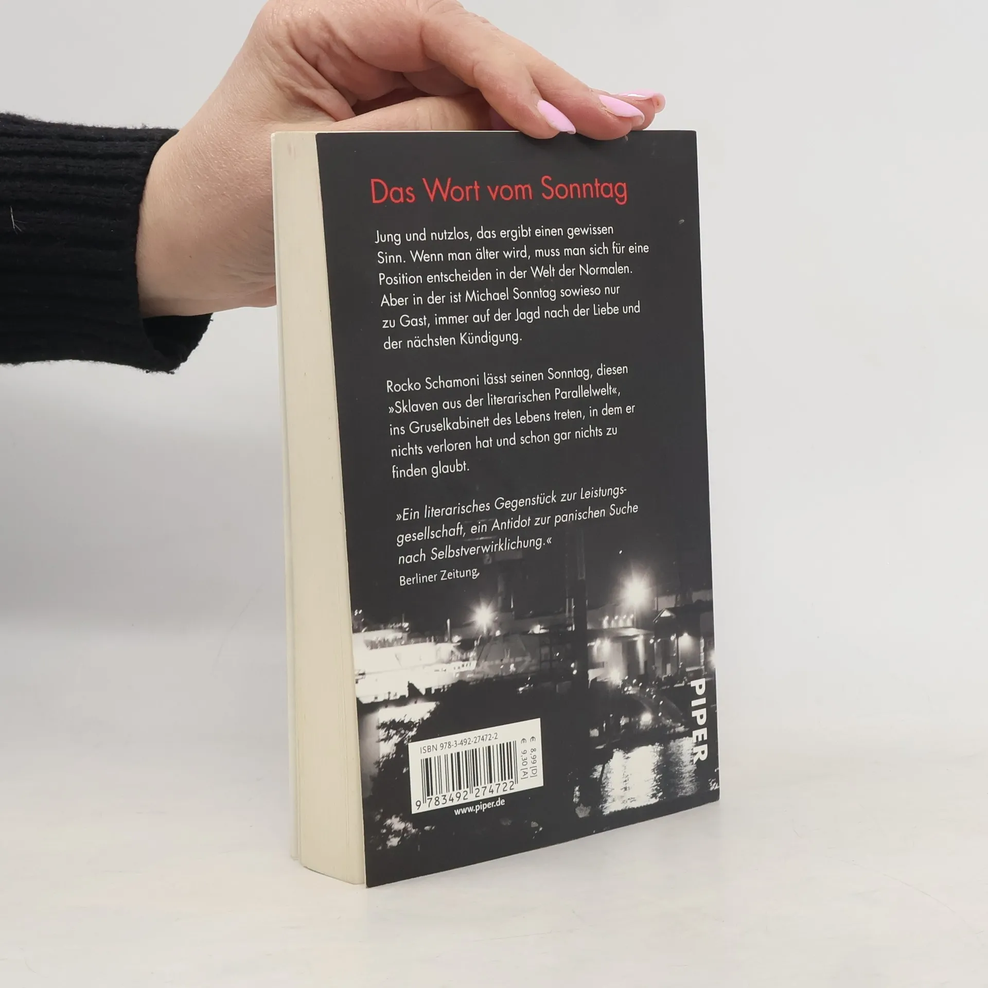 Unbeirrt treibt Michael Sonntag durch seine Tage, sein Körper zeigt erste Gebrauchsspuren, und die großen Gedanken machen gewöhnlich einen Bogen um ihn. Entgegen den Erwartungen, die seine Umwelt an ihn stellt, verweigert Sonntag gern jede daseinserhaltende Tätigkeit. Nur seinem Freund Novak gelingt es hin und wieder, ihn mit hirnrissigen Geschäftsideen aus der Reserve zu locken. Und natürlich Marion Vossreuther, der Servicekraft aus dem Handyladen, die einen ganz eigenen Reiz auf ihn ausübt. Entschlossen geht Rocko Schamonis Held Sonntag den Erfordernissen des Lebens aus dem Weg. Und dabei fordert der Irrsinn unserer Existenz seine Unerschrockenheit und seinen Witz öfter heraus, als ihm lieb sein kann.