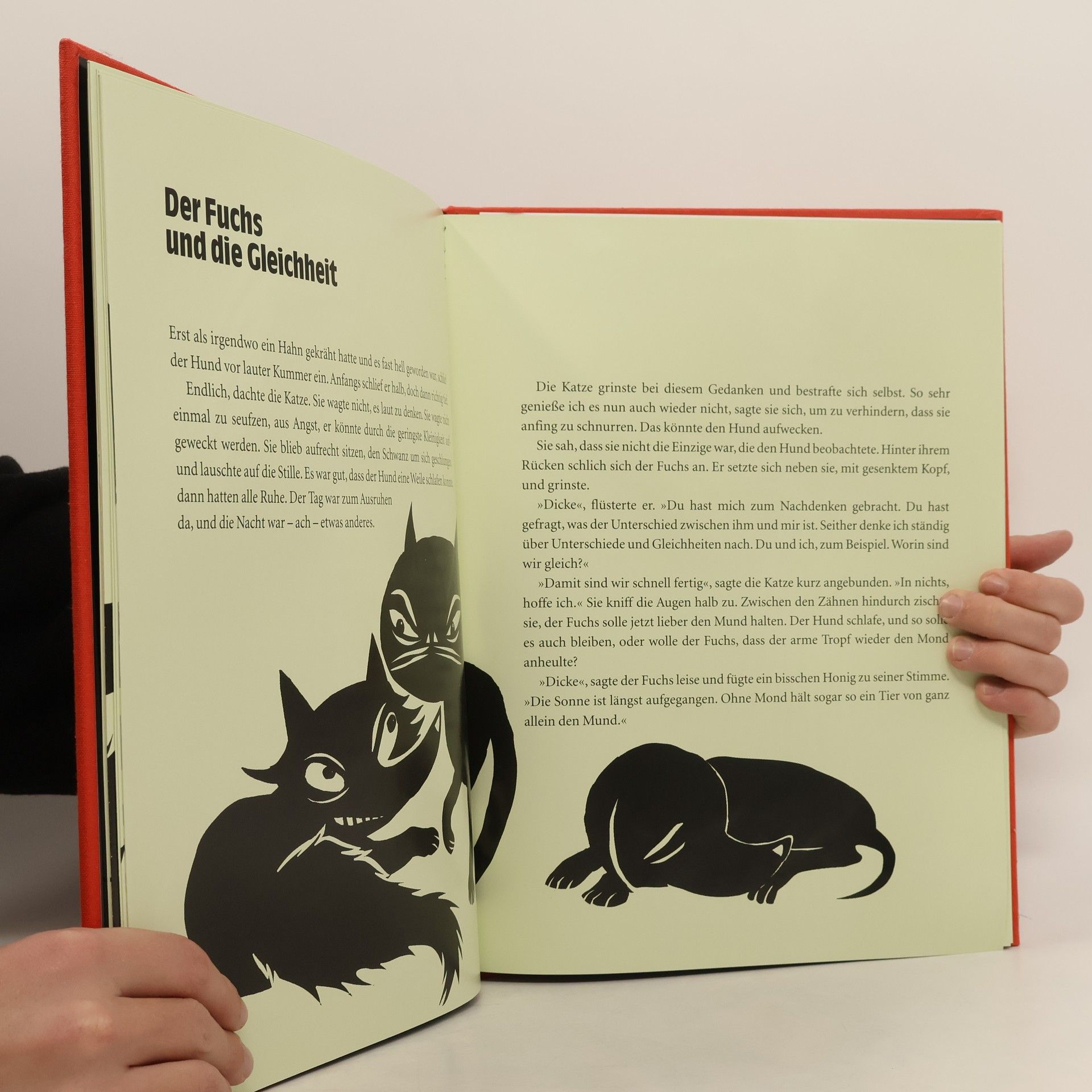 Dieses Bilderbuch leuchtet im Dunkeln - und es erzählt eine poetische Fabel über Freiheit und Phantasie: Die Katze liegt auf einem Ast und genießt die Aussicht. Sie fühlt sich unabhängig und frei. Wen sie nicht versteht, ist der Hund. Er sitzt angeleint am Baum und wartet auf seinen Herrn. Warum ist er nur so geduldig? Warum reißt er sich nicht los? Wozu braucht er überhaupt einen Herrn? Wie sehen das die anderen Tiere? Leben sie nicht alle in Freiheit? Die kluge Eule? Der schlaue Fuchs? Die Mäuse und die Motten? Nach den Menschen fragt die Katze nicht, das überlässt sie den Lesern. Die können sich das bei Licht überlegen oder im Dunkeln.