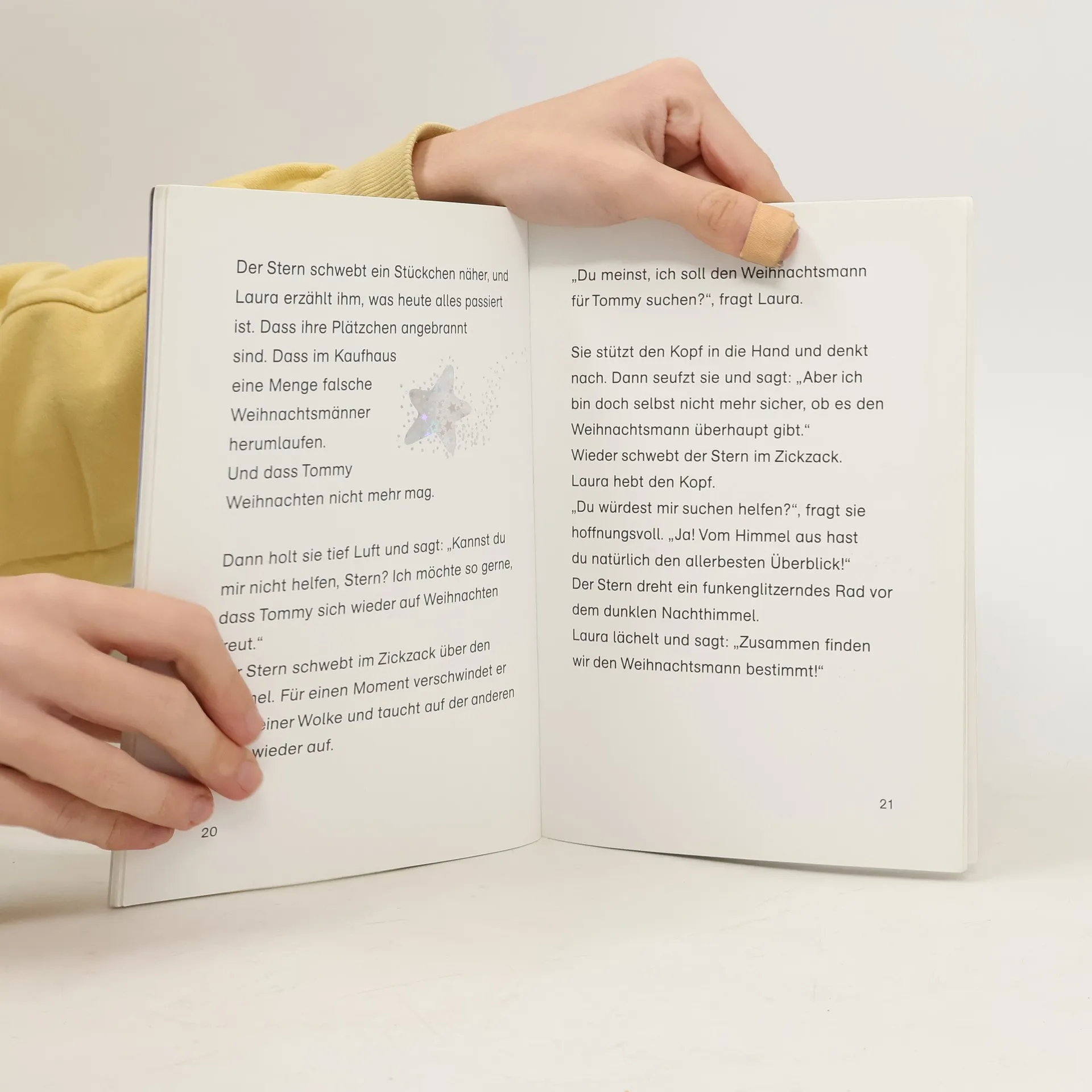 Lauras kleinem Bruder Tommy ist der ganze Weihnachtstrubel zu viel: Mama und Papa haben keine Zeit, und die Nikoläuse in den Kaufhäusern sind gar keine richtigen Weihnachtsmänner! Tommy ist überzeugt: »Den Weihnachtsmann gibt’s gar nicht in echt!« Laura will Tommy helfen. Aber wie? Zum Glück hat sie ihren Stern. Der begleitet sie auf ihrer Suche nach dem richtigen Weihnachtsmann ...