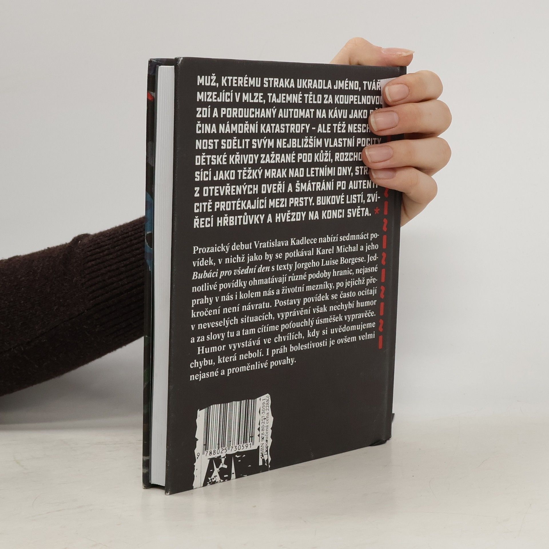 Muž, kterému straka ukradla jméno, tváře mizející v mlze, tajemné tělo za koupelnovou zdí a porouchaný automat na kávu jako příčina námořní katastrofy – ale též neschopnost sdělit svým nejbližším vlastní pocity, dětské křivdy zažrané pod kůží, rozchody visící jako těžký mrak nad letními dny, strach z otevřených dveří a šmátrání po autenticitě protékající mezi prsty. Bukové listí, zvířecí hřbitůvky a hvězdy na konci světa. Prozaický debut Vratislava Kadlece nabízí sedmnáct povídek různé délky a rozmanité formy, v nichž jako by se potkával Karel Michal a jeho Bubáci pro všední den s texty Jorge Luise Borgese. Jednotlivé povídky ohmatávají různé podoby hranic, nejasné prahy v nás i kolem nás a životní mezníky, po jejichž překročení není návratu. Postavy povídek se často ocitají v neveselých situacích, vyprávění však nechybí místy potemnělý, jindy zas jasnější humor. Humor vyvstává ve chvílích, kdy si uvědomujeme chybu, která – řečeno s Aristotelem – nebolí. I práh bolestivosti je ovšem velmi nejasné a proměnlivé povahy.