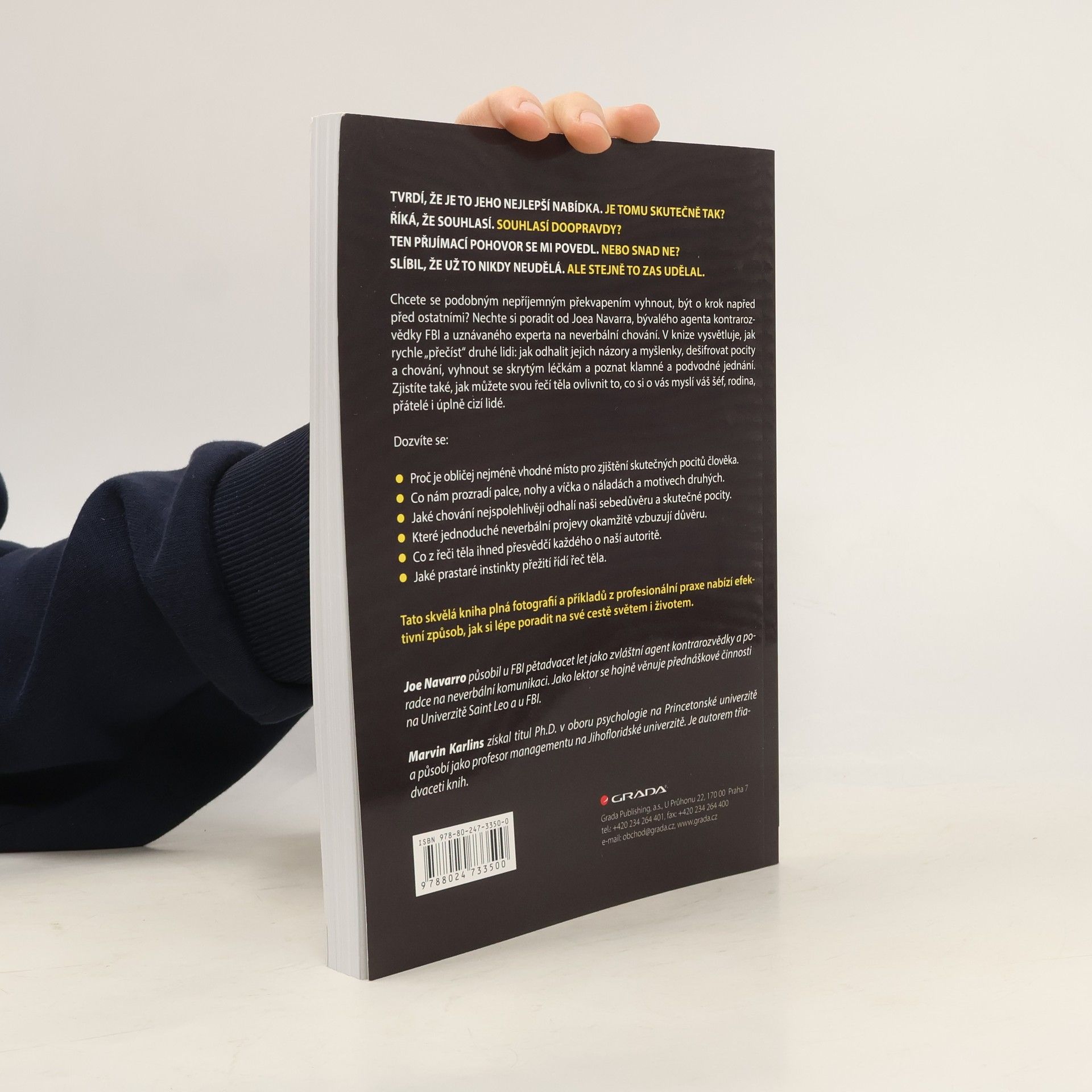 Tvrdí, že je to jeho nejlepší nabídka. Je tomu ale skutečně tak? Říká, že souhlasí. Opravdu? Slibuje, že už to nikdy neudělá. Ale stejně to zase udělal... Chcete se podobným nepříjemným překvapením vyhnout, být o krok napřed před ostatními? Nechte si poradit od Joea Navarra, bývalého agenta kontrarozvědky FBI a uznávaného experta na neverbální chování. V knize vysvětluje, jak rychle "přečíst" druhé lidi: jak odhalit jejich názory a myšlenky, dešifrovat pocity a chování, vyhnout se skrytým léčkám a poznat klamné a podvodné jednání. Dozvíte se například, proč je tvář nejméně spolehlivá oblast pro odhalení skutečných pocitů druhého člověka, co o našich náladách a motivech vyzradí palce, nohy nebo oční víčka, jaké chování prozrazuje naši sebedůvěru a pocity nebo s jakou neverbální komunikací podpoříte vzájemnou důvěru a svou autoritu. Zjistíte také, jak můžete svou řečí těla ovlivnit to, co si o vás myslí váš šéf, rodina, přátelé i úplně cizí lidé.