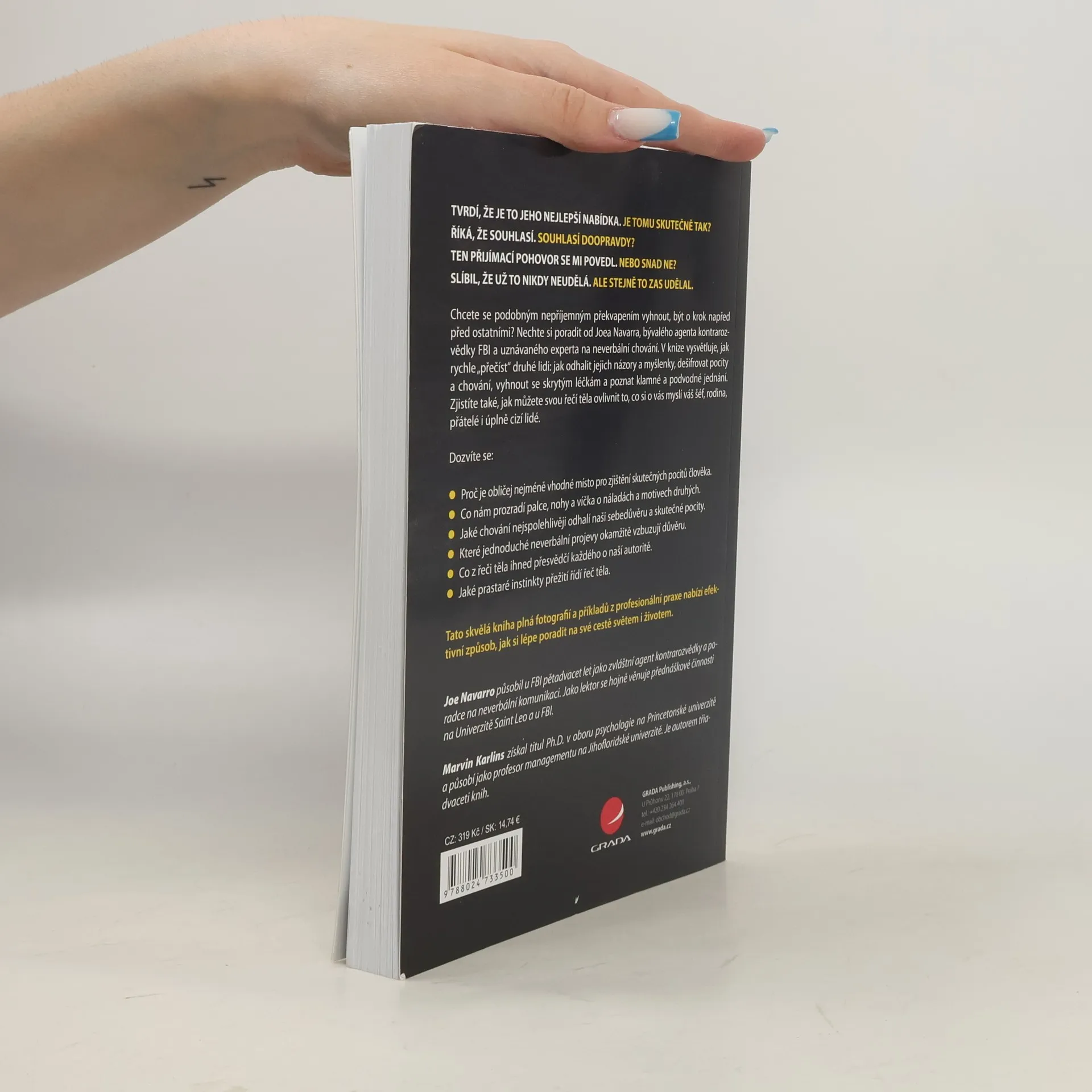 Tvrdí, že je to jeho nejlepší nabídka. Je tomu ale skutečně tak? Říká, že souhlasí. Opravdu? Slibuje, že už to nikdy neudělá. Ale stejně to zase udělal... Chcete se podobným nepříjemným překvapením vyhnout, být o krok napřed před ostatními? Nechte si poradit od Joea Navarra, bývalého agenta kontrarozvědky FBI a uznávaného experta na neverbální chování. V knize vysvětluje, jak rychle "přečíst" druhé lidi: jak odhalit jejich názory a myšlenky, dešifrovat pocity a chování, vyhnout se skrytým léčkám a poznat klamné a podvodné jednání. Dozvíte se například, proč je tvář nejméně spolehlivá oblast pro odhalení skutečných pocitů druhého člověka, co o našich náladách a motivech vyzradí palce, nohy nebo oční víčka, jaké chování prozrazuje naši sebedůvěru a pocity nebo s jakou neverbální komunikací podpoříte vzájemnou důvěru a svou autoritu. Zjistíte také, jak můžete svou řečí těla ovlivnit to, co si o vás myslí váš šéf, rodina, přátelé i úplně cizí lidé.