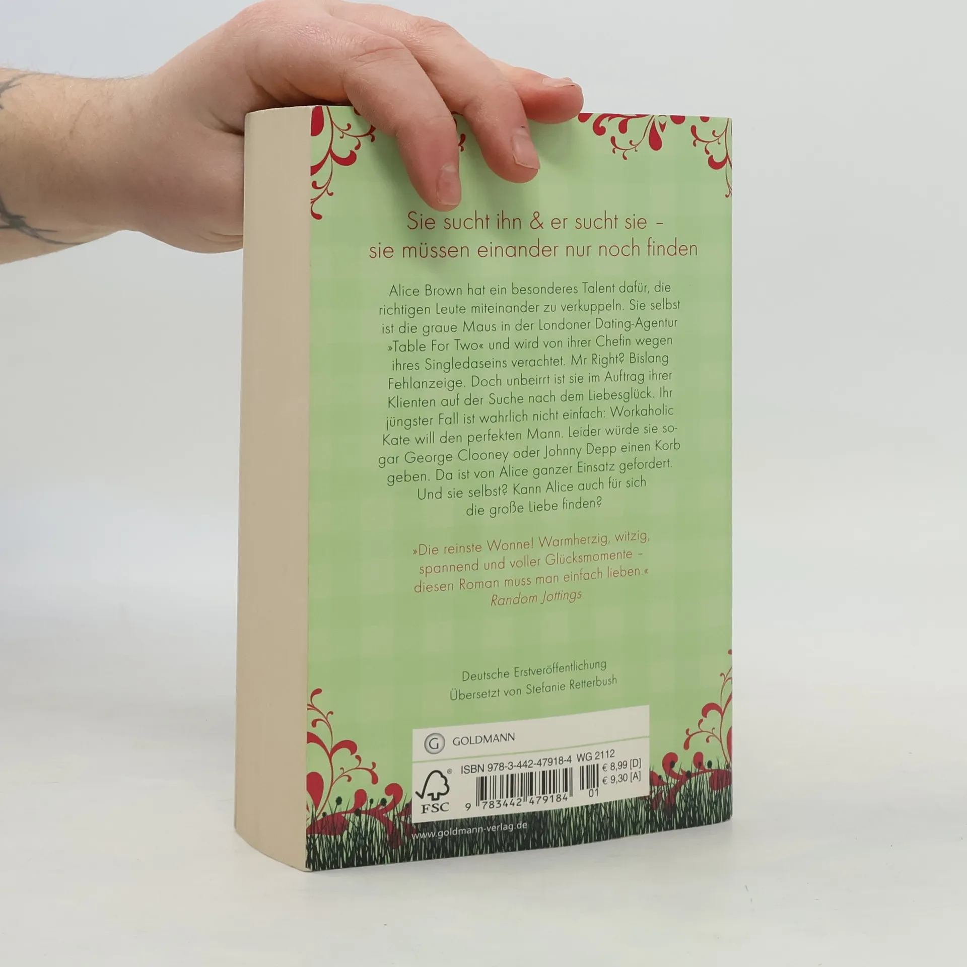 Sie sucht ihn & er sucht sie – sie müssen einander nur noch finden. Alice Brown hat ein besonderes Talent dafür, die richtigen Leute miteinander zu verkuppeln. Sie selbst ist die graue Maus in der Londoner Dating-Agentur „Table for Two“, von ihrer herrischen Chefin verachtet, von ihren Kolleginnen weitgehend ignoriert. Doch unbeirrt ist sie im Auftrag ihrer Klienten auf der Suche nach dem Liebesglück. Ihr jüngster Fall ist wahrlich nicht einfach: Workaholic Kate will den perfekten Mann und hat dabei sehr klare Vorstellungen. Leider fände sie sogar an George Clooney etwas auszusetzen und würde Johnny Depp einen Korb geben. Da ist von Alice ganzer Einsatz gefordert. Doch was ist eigentlich mit ihr selbst? Kann Alice vielleicht auch für sich die große Liebe finden?