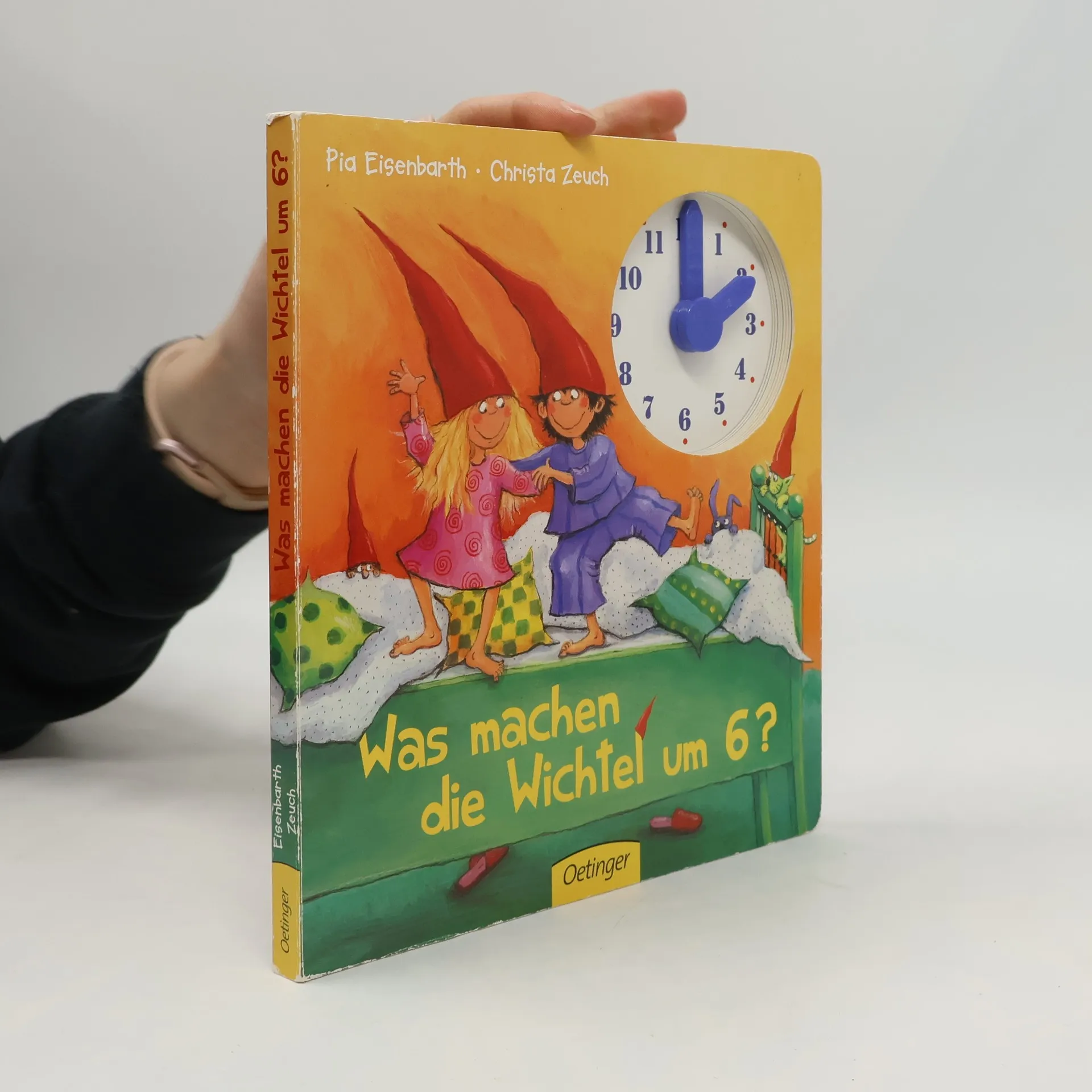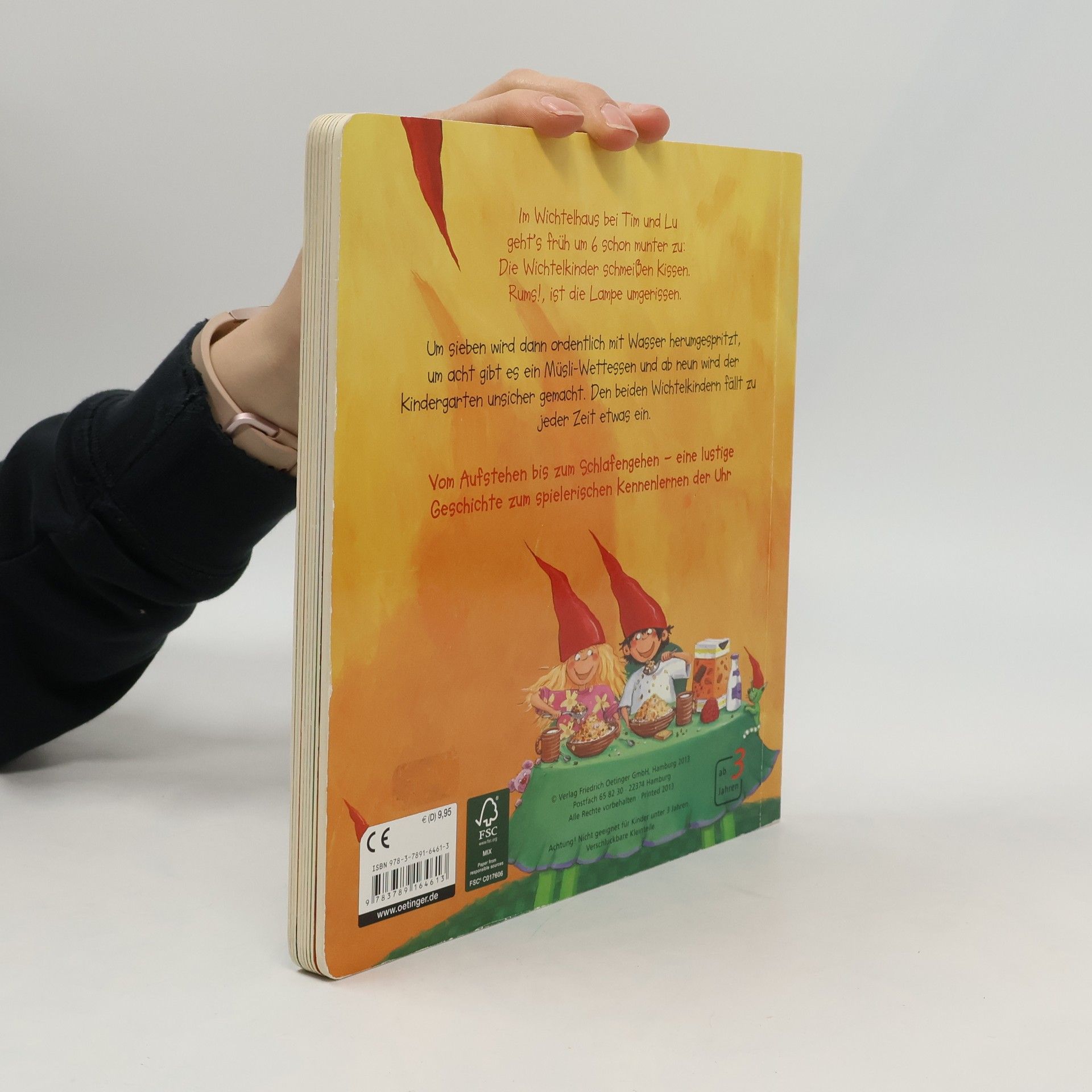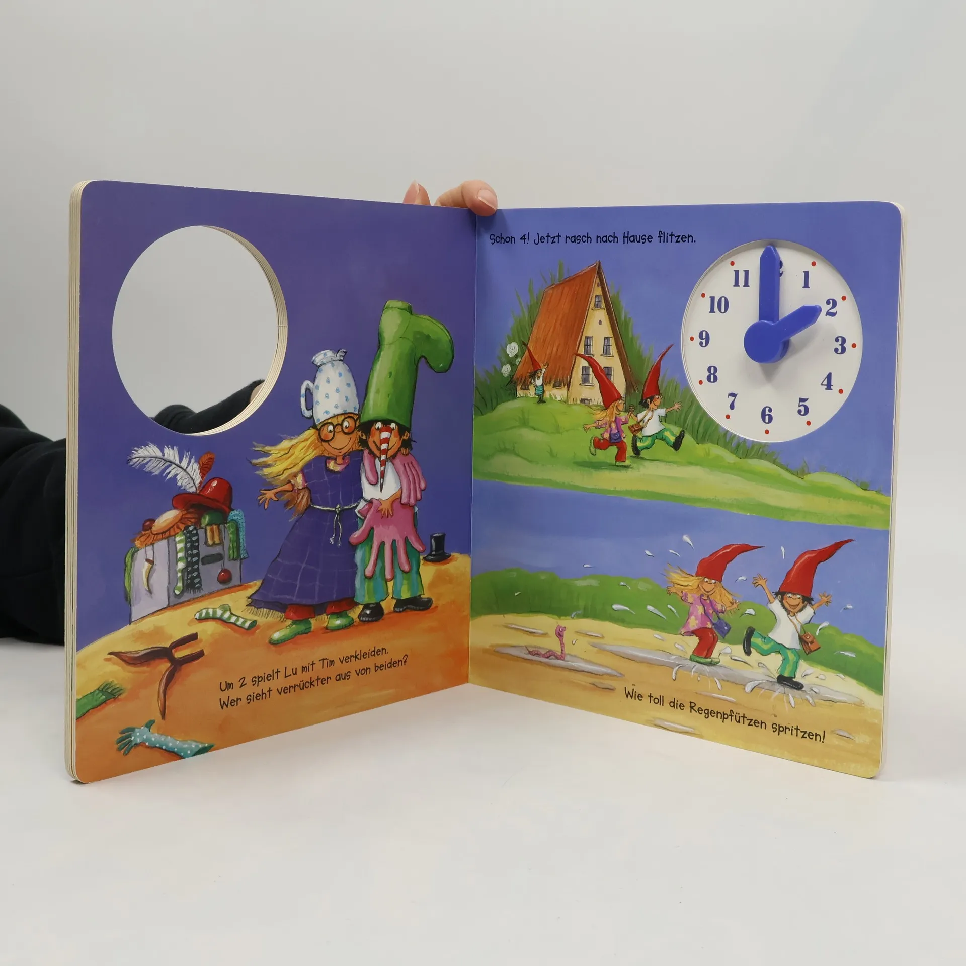 Lustig und vergnügt von sechs bis sechs: Spielspaß mit echter Uhr! Morgens um sechs gibt’s eine Kissenschlacht, um sieben werden die Zähne geputzt und die Hühner nass gespritzt, und um neun Uhr geht es in den Kindergarten. Die Kinder begleiten die kleinen Wichtel Tim und Lu den ganzen Tag und können dabei die Uhrzeiten an der Uhr einstellen. Vom Aufstehen bis zum Zubettgehen, wenn der Wichtelpapa Tim und Lu die Gutenachtgeschichte vorliest. Farbenfrohe Bilder zeigen einen kunterbunten Kinderalltag und als Extra gibt es eine Uhr mit beweglichen Zeigern dabei, die beim Drehen „ticken“.