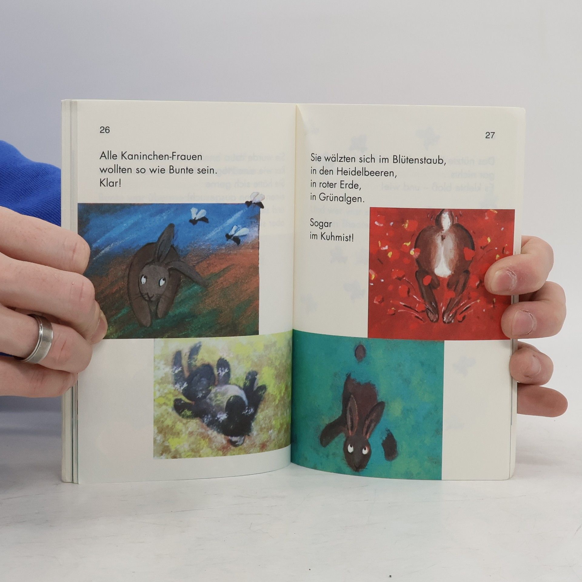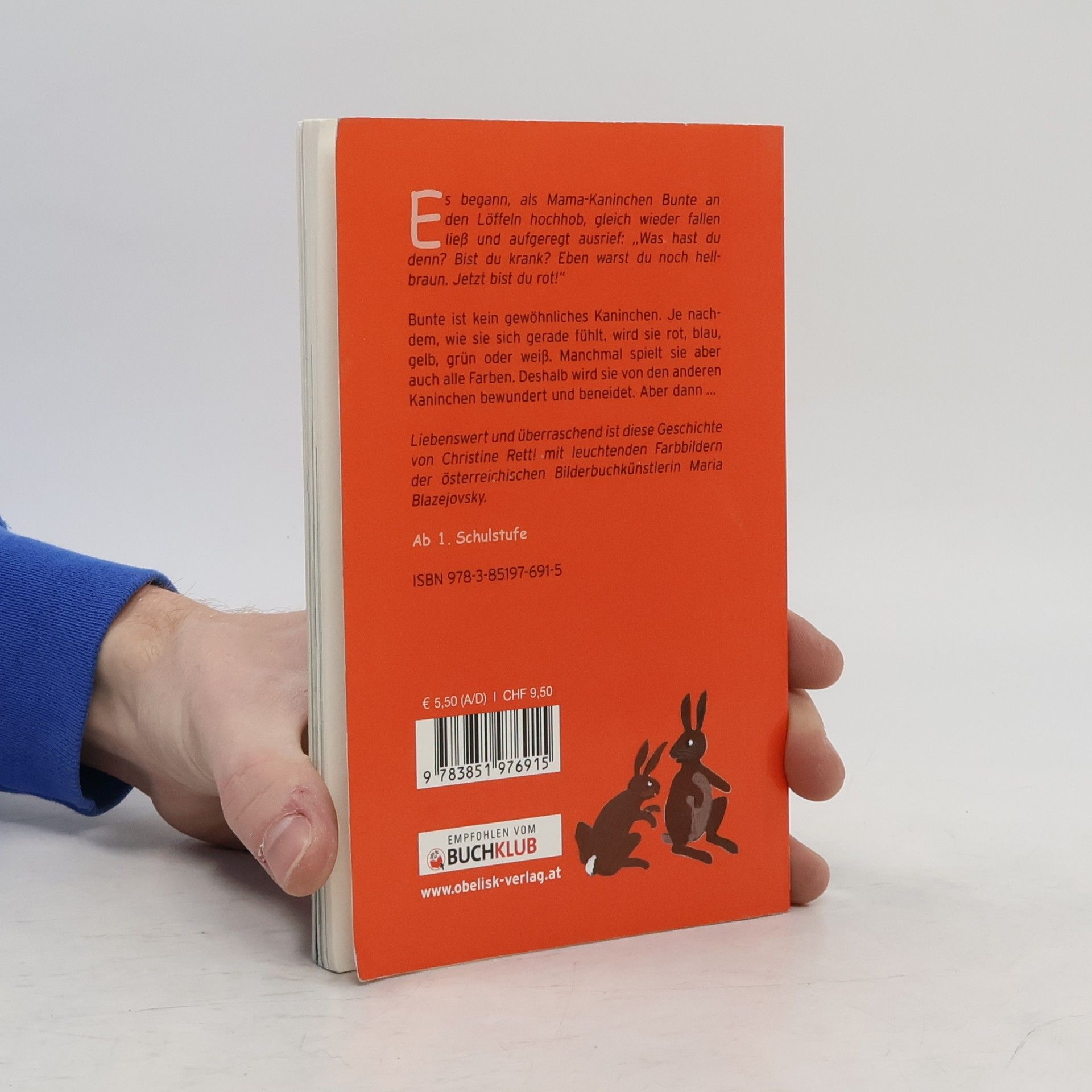 Es begann, als Mama-Kaninchen Bunte an den Löffeln hochhob, gleich wieder fallen ließ und aufgeregt ausrief: „Was hast du denn? Bist du krank? Eben warst du noch hellbraun. Jetzt bist du rot!“ Bunte ist kein gewöhnliches Kaninchen. Je nachdem, wie sie sich gerade fühlt, wird sie rot, blau, gelb, grün oder weiß. Manchmal spielt sie aber auch alle Farben. Deshalb wird sie von den anderen Kaninchen bewundert und beneidet. Aber dann...