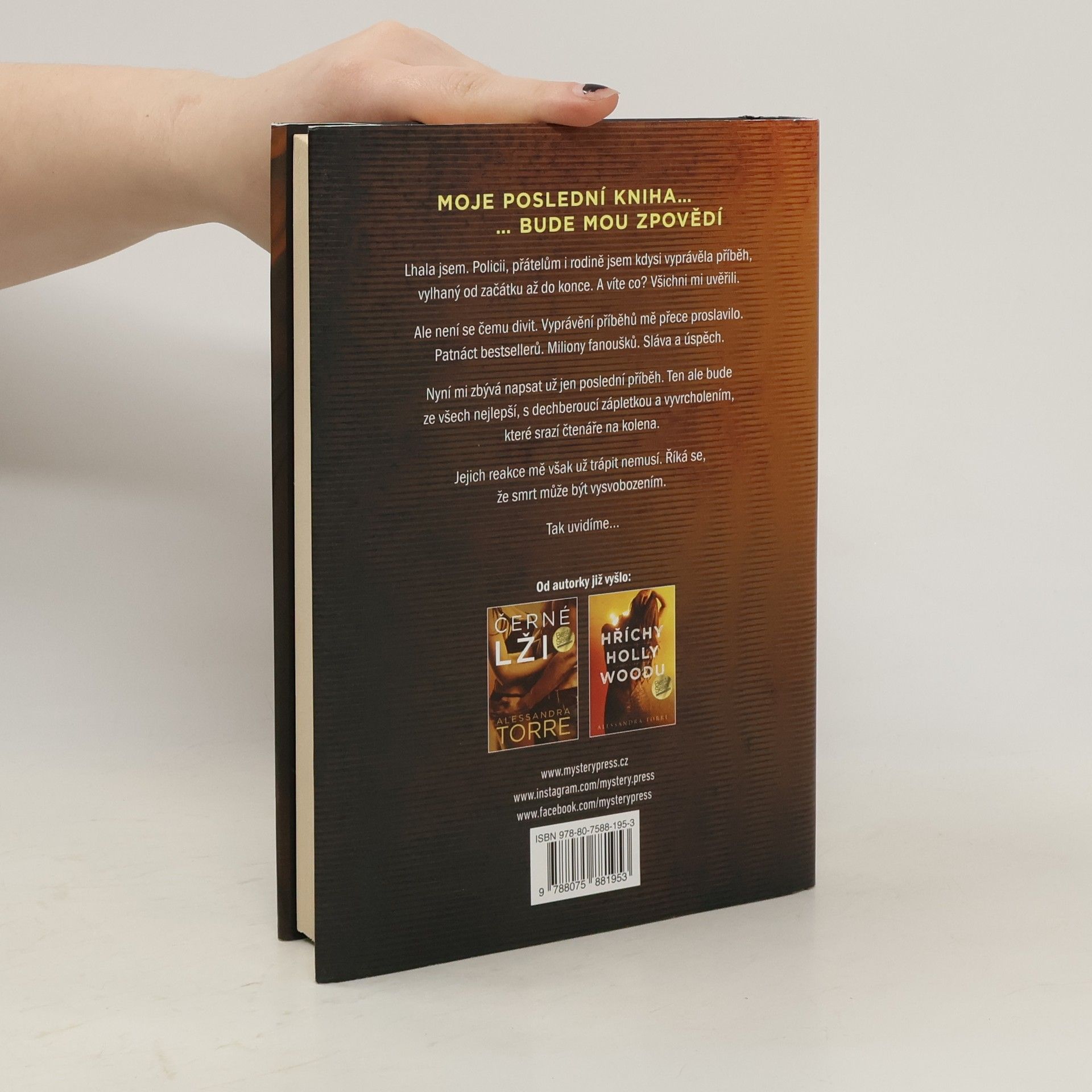 MOJE POSLEDNÍ KNIHA BUDE MOU ZPOVĚDÍ… Lhala jsem. Policii, přátelům i rodině jsem kdysi vyprávěla příběh, vylhaný od začátku až do konce. A víte co? Všichni mi uvěřili. Ale není se čemu divit. Vyprávění příběhů mě přece proslavilo. Patnáct bestsellerů. Miliony fanoušků. Sláva a úspěch. Nyní mi zbývá napsat už jen poslední příběh. Ten ale bude ze všech nejlepší, s dechberoucí zápletkou a vyvrcholením, které srazí čtenáře na kolena. Jejich reakce mě však už trápit nemusí. Říká se, že smrt může být vysvobozením. Tak uvidíme…