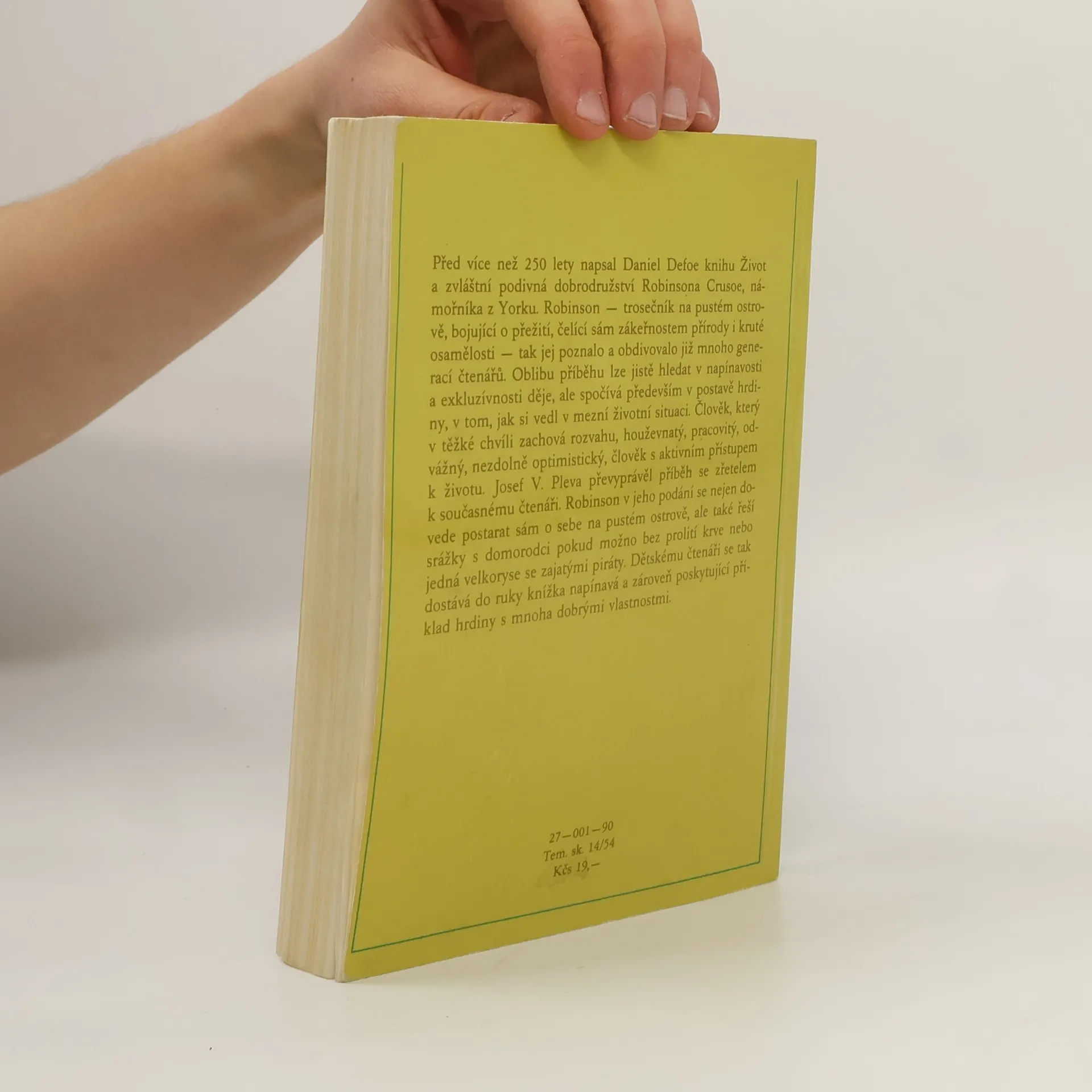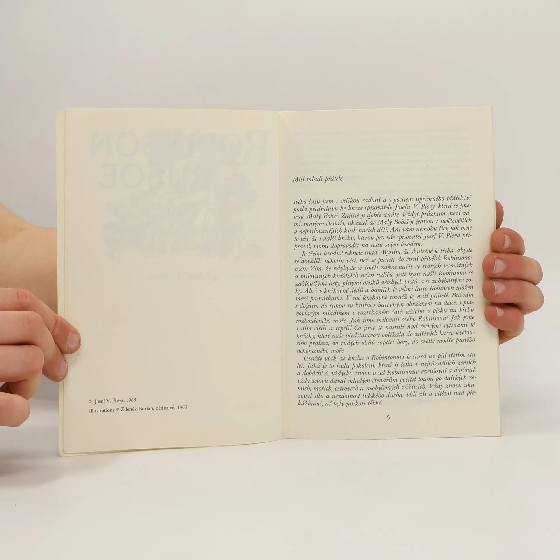 Před více než 250 lety napsal Daniel Defoe knihu Život a zvláštní podivná dobrodružství Robinsona Crusoe, námořníka z Yorku. Robinson - trosečník na pustém ostrově, bojující o přežití, čelící sám zákeřnostem přírody i kruté osamělosti - tak jej poznalo a obdivovalo již mnoho generací čtenářů. Oblibu příběhu lze jistě hledat v napínavosti a exkluzívnosti děje, ale spočívá především v postavě hrdiny, v tom, jak si vedl v mezní životní situaci. Člověk, který v těžké chvíli zachová rozvahu, houževnatý, pracovitý, odvážný, nezdolně optimistický, člověk s aktivním přístupem k životu. Josef V. Pleva převyprávěl příběh se zřetelem k současnému čtenáři. Robinson v jeho podání se nejen dovede postarat sám o sebe na pustém ostrově, ale také řeší srážky s domorodci pokud možno bez prolití krve nebo jedná velkoryse se zajatými piráty. Dětskému čtenáři se tak dostává do rukou knížka napínavá a zároveň poskytující příklad hrdiny s mnoha dobrými vlastnostmi.