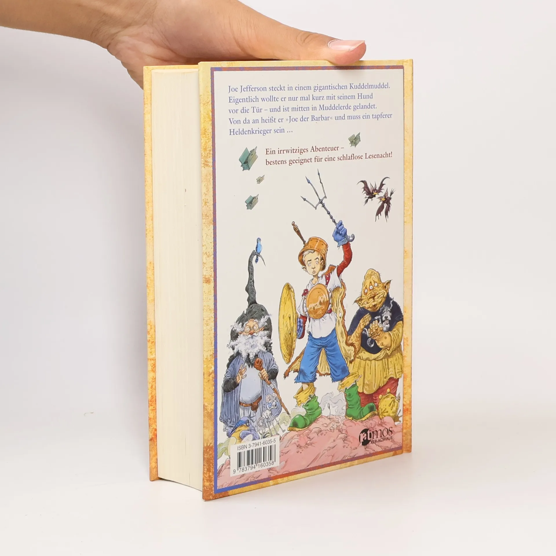 Joe Jefferson ist der normalste Schuljunge, bis er beim Gassi gehen mit seinem Hund in einen Tunnel fällt. Von da an wird er gegen seinen Willen Joe der Barbar genannt und soll als tapferer Heldenkrieger agieren. Der Zauberer Randalf hat ihn nach Muddelerde beschworen, um den Bewohnern zu helfen, da der Gehörnte Baron unter dem Einfluss seiner Frau leidet und nicht mehr regieren kann. Randalf ist überfordert, während Dr. Knuddel mit seiner Besteck-Armee, fliegenden Kleiderschränken und Kissenbomben das Land bedroht. Joe findet sich in einem Chaos wieder, während Randalf ihm eine kostengünstige Heldenausrüstung besorgt und erwartet, dass Joe Oger und Drachen besiegt und Dr. Knuddel stoppt. Um dies zu erreichen, muss Joe das Große Buch der Zaubersprüche zurückholen, denn nur mit den richtigen Sprüchen können friedliche Dinge in Waffen verwandelt werden. Joe beginnt, seine Heldenrolle zu genießen und macht Fortschritte bei seiner Mission. Doch als Dr. Knuddel die Gemahlin des Gehörnten Barons entführt, steht Joe vor einer großen Herausforderung. Eine eigenständige Abenteuergeschichte ohne Folgebände, die mit 130 Illustrationen ausgestattet ist und für Kinder ab 10 Jahren geeignet ist.