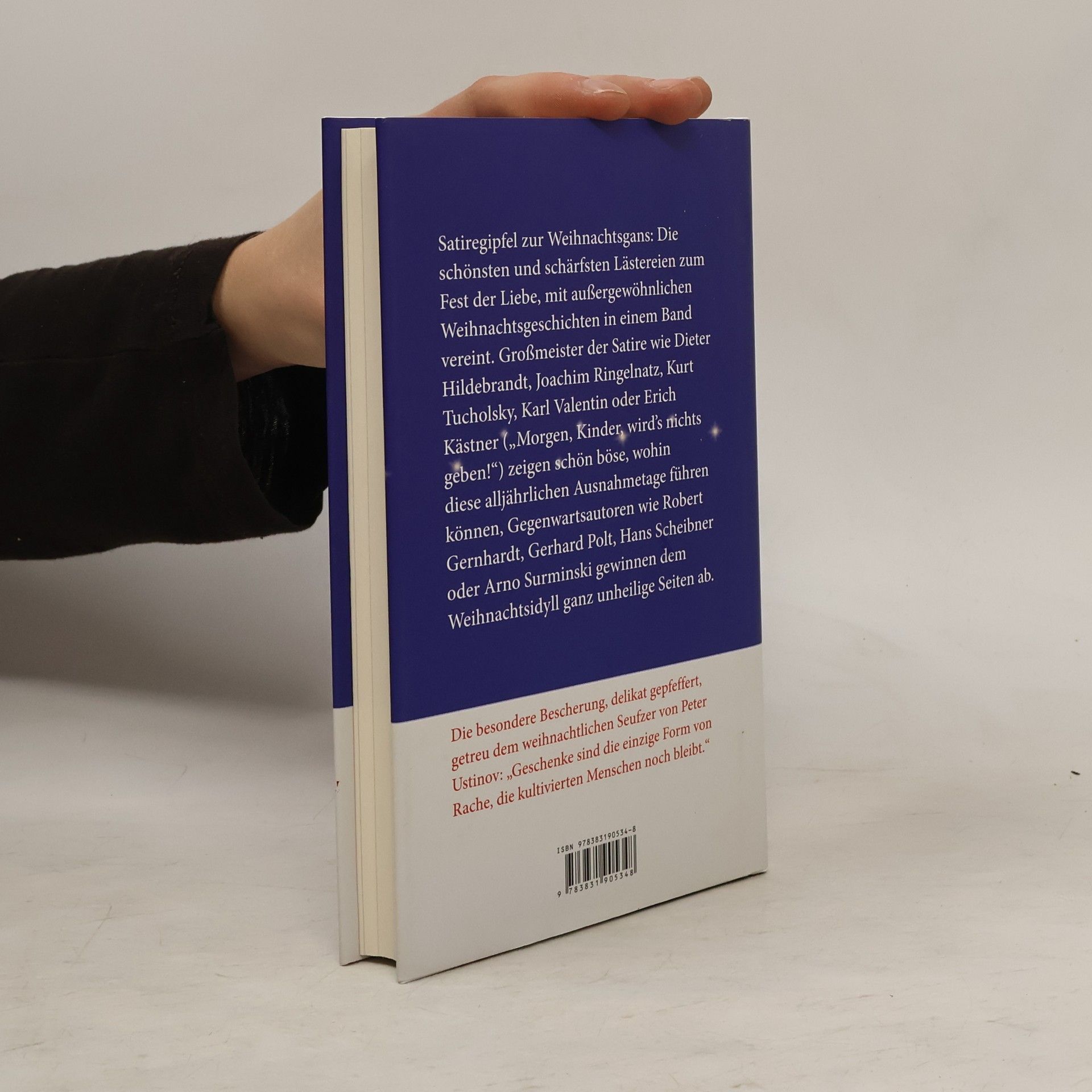 Satiregipfel zur Weihnachtsgans: die schönsten und schärfsten Lästereien zum Fest der Liebe, mit außergewöhnlichen Weihnachtsgeschichten in einem Band vereint. Großmeister wie Dieter Hildebrandt, Kurz Tucholsky, Karl Valentin oder Erich Kästner („Morgen, Kinder, wird’s nichts geben!“) zeigen schön böse, wohin diese alljährlichen Ausnahmetage führen können, Gegenwartsautoren wie Robert Gernhardt, Gerhard Polt, Hans Scheibner oder Arno Surminski gewinnen dem Weihnachtsidyll ganz unheilige Seiten ab. Die besondere Bescherung, delikat gepfeffert, getreu dem weihnachtlichen Seufzer von Peter Ustinov: „Geschenke sind die einzige Form von Rache, die kultivierten Menschen noch bleibt.“