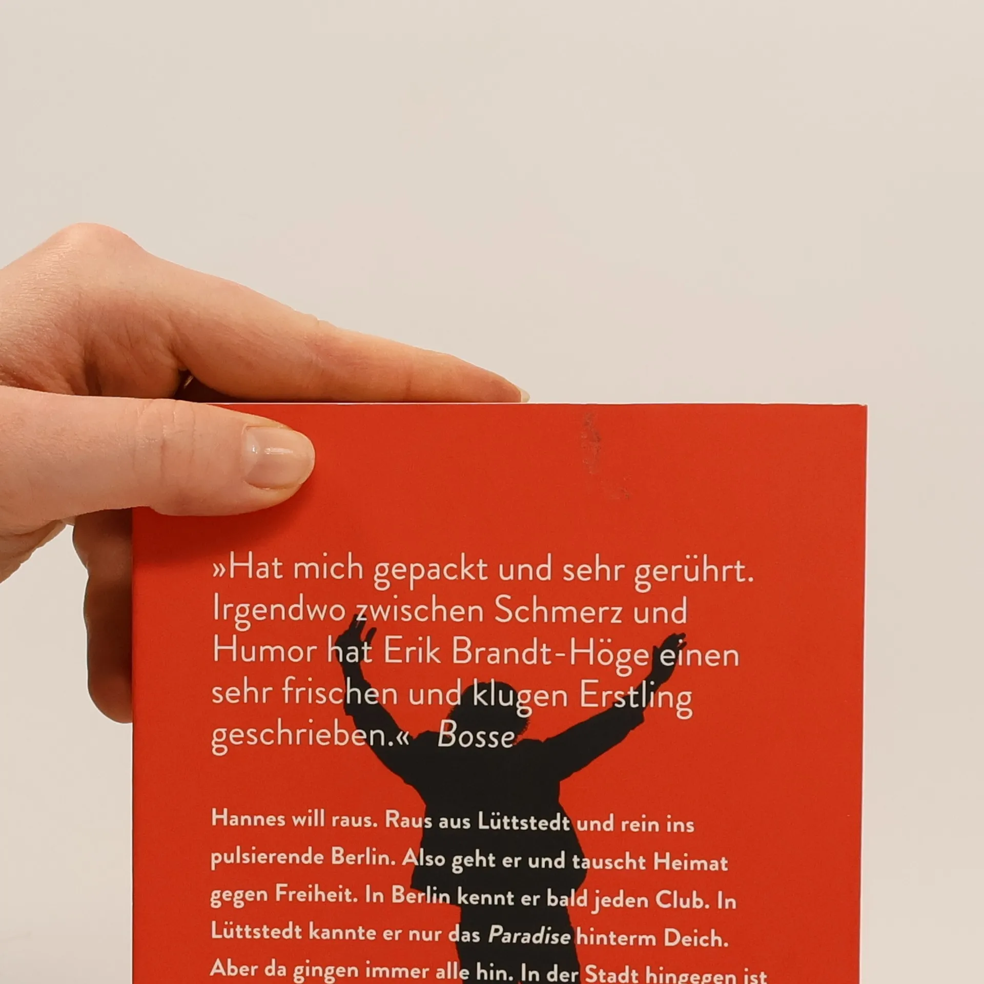 Hannes will raus. Raus aus Lüttstedt und rein ins pulsierende Berlin. Also geht er und tauscht Heimat gegen Freiheit. In Berlin kennt er bald jeden Club. In Lüttstedt kannte er nur das Paradise hinterm Deich. Aber da gingen immer alle hin. Und wenn er mit seinem Kumpel in der Schlange vor der Disko stand, dann war das Versprechen der Nacht größer als alles andere. In der Stadt hingegen ist er allein. Verzweifelt sucht er im Alltag nach Echtheit, erlebt Höhenflüge und gerät ins Schleudern. Bis zu einer besonderen Begegnung. Bis es vielleicht Liebe ist. Beifall für Erik Brandt-Höges Buchdebüt: „Hat mich gepackt und sehr gerührt. Irgendwo zwischen Schmerz und Humor hat Erik Brandt-Höge einen sehr frischen und klugen Erstling geschrieben.“ Bosse „Ein Späti im Hühnerstall? Muss unbedingt bald in dieses Lüttstedt reisen.„ Jochen Overbeck, Musikexpress „Dieses Buch ist ein Muss für alle Ex-Landeier. Beängstigend nah an der Realität! Danke für den Flashback.“ Sven Voss, ZDF „Kennt ja jeder: Erst schwitzige Jugend auf dem Land und dann hartes Rockleben in der Stadt. Erik Brandt-Höge hat es genauso aufgeschrieben, wie es ist. Mies. Aber super.“ Max Scharnigg „In der Haltestellenhierarchie stand ich auch ganz unten. Ein Buch voller Witz und Wahrheit. Danke, Erik Brandt-Höge!" Sebastian Madsen, Sänger der Band Madsen
