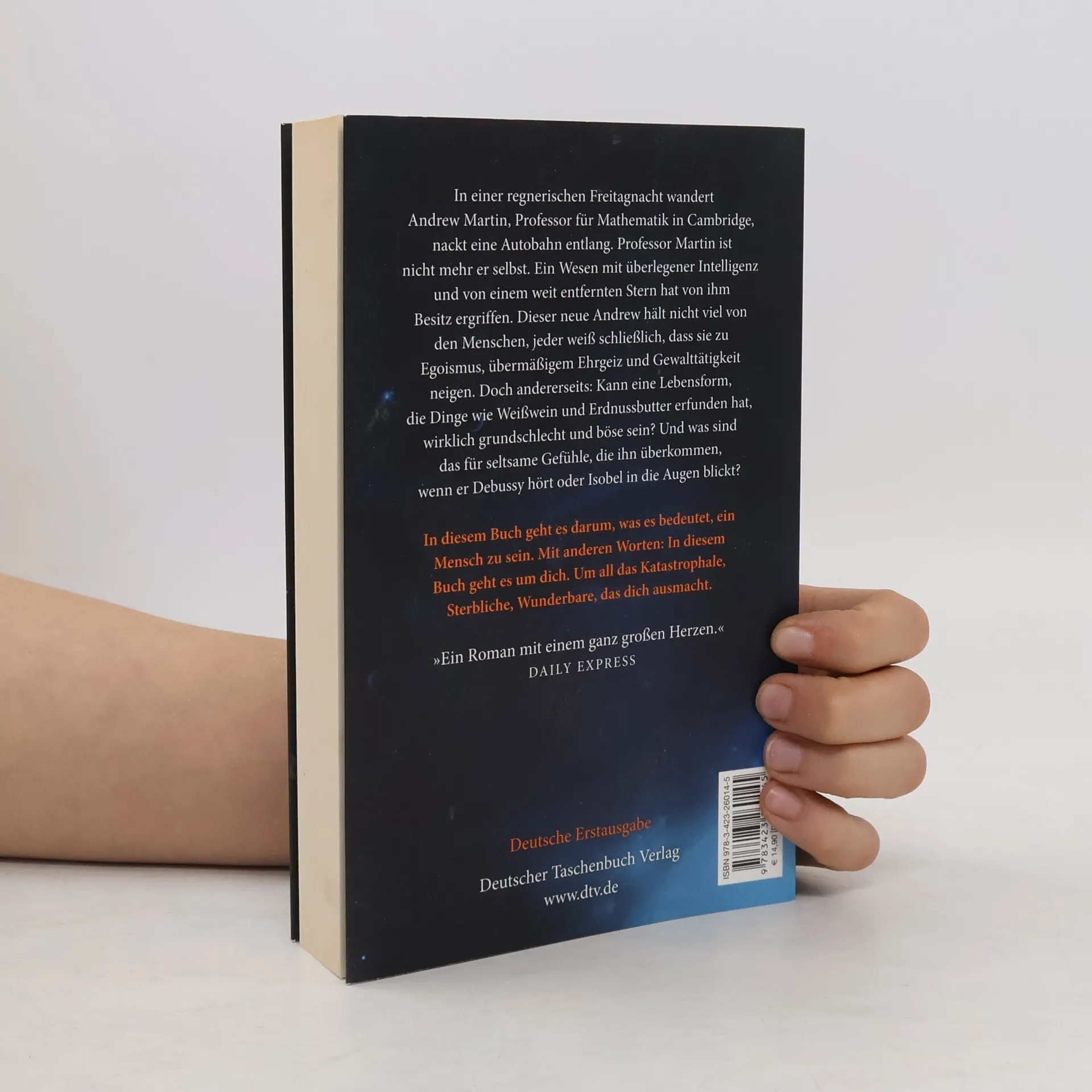 Ein Roman 'mit einem ganz großen Herzen' Daily Express In einer regnerischen Freitagnacht wird Andrew Martin, Professor für Mathematik in Cambridge, aufgegriffen, als er nackt eine Autobahn entlangwandert. Professor Martin ist nicht mehr er selbst. Ein Wesen mit überlegener Intelligenz und von einem weit entfernten Stern hat von ihm Besitz ergriffen. Dieser neue Andrew ist nicht begeistert von seiner neuen Existenz. Er hat eine denkbar negative Meinung von den Menschen. Jeder weiß schließlich, dass sie zu Egoismus, übermäßigem Ehrgeiz und Gewalttätigkeit neigen. Doch andererseits: Kann eine Lebensform, die Dinge wie Weißwein und Erdnussbutter erfunden hat, wirklich grundschlecht und böse sein? Und was sind das für seltsame Gefühle, die ihn überkommen, wenn er Debussy hört oder Isobel, der Frau des Professors, in die Augen blickt?