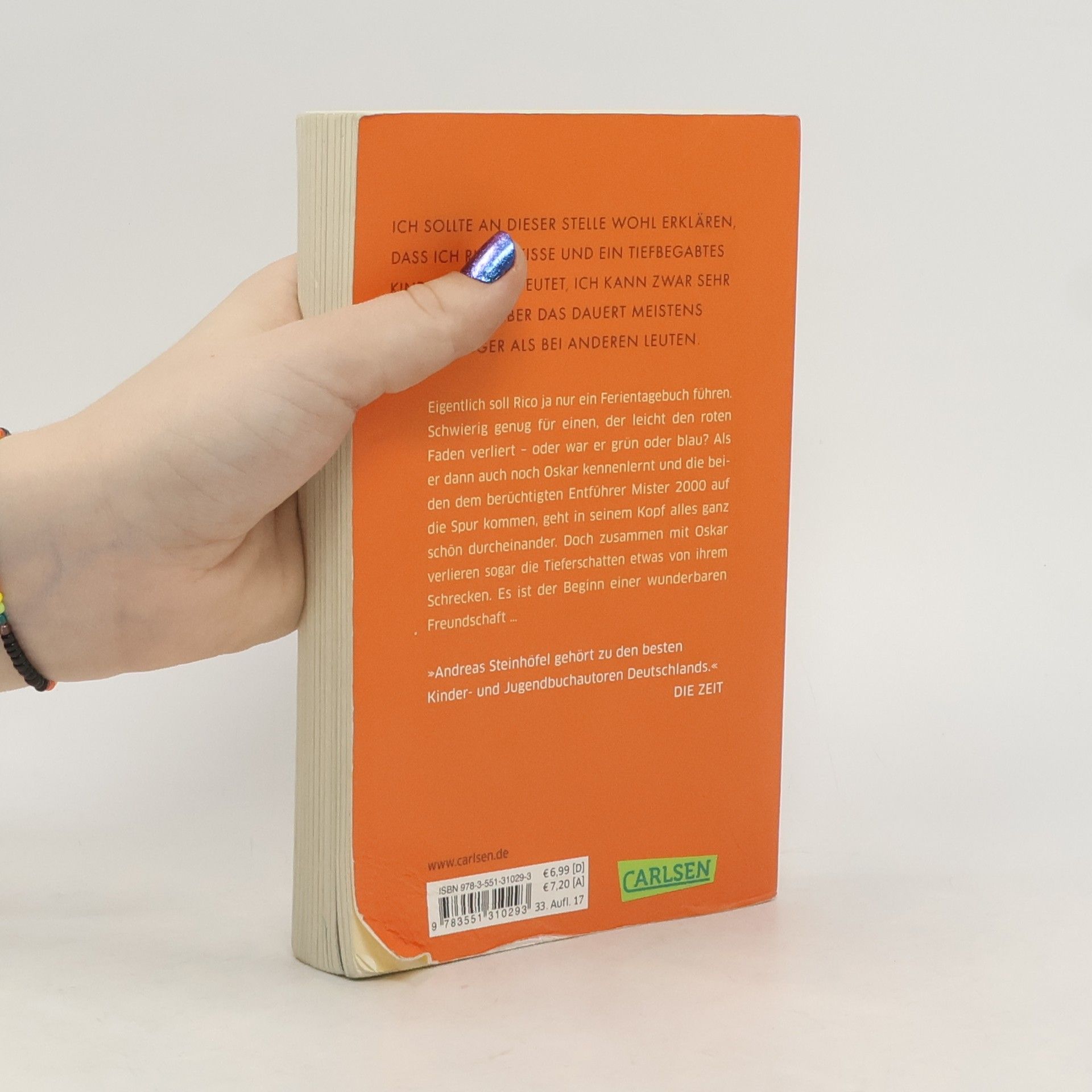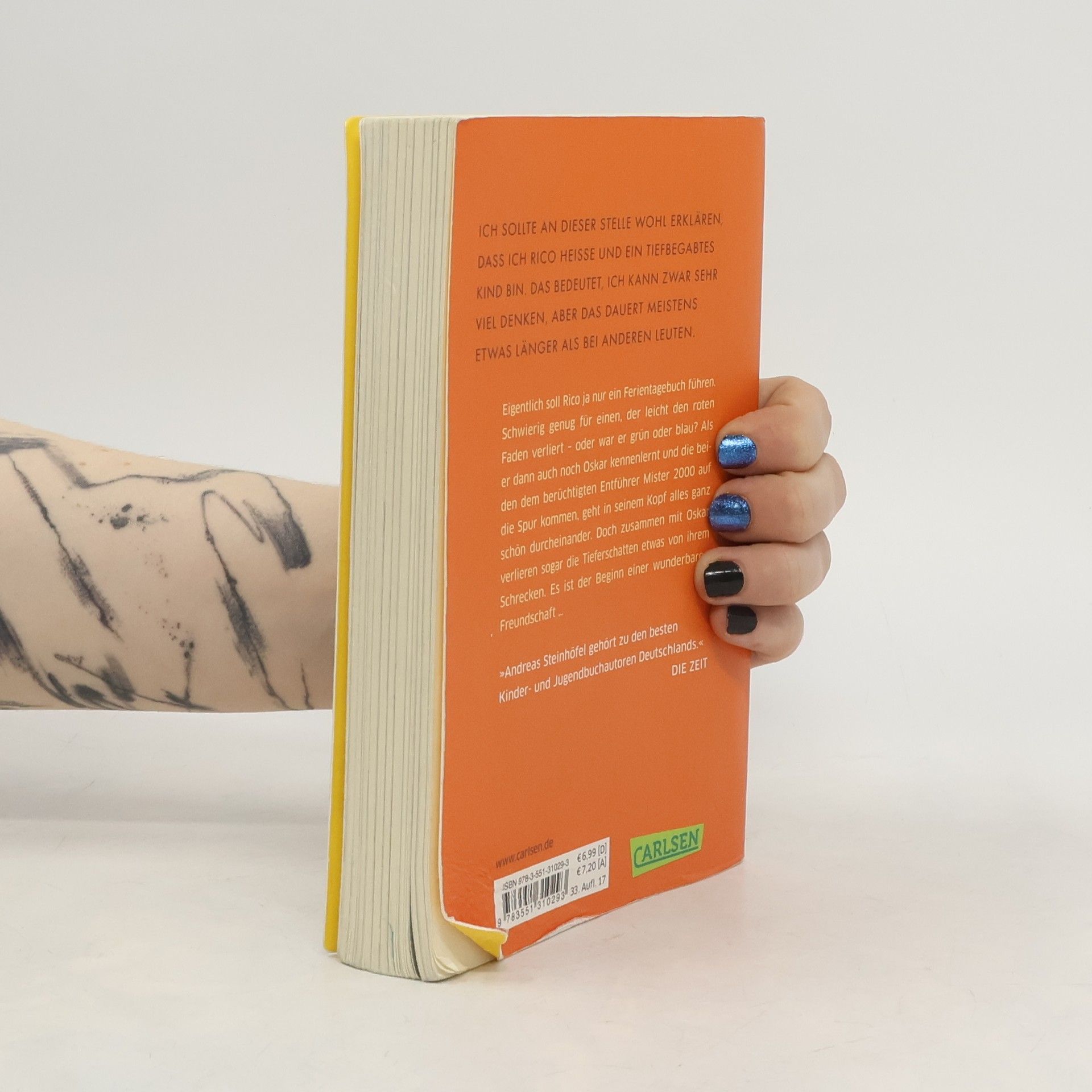 Band 1 der preisgekrönten und verfilmten Abenteuer mit Rico und Oskar Eigentlich soll Rico ja nur ein Ferientagebuch führen. Aber für einen, der ständig den Faden verliert, ist das gar nicht so leicht! Als er dann auch noch Oskar mit dem blauen Helm kennenlernt und die beiden dem berüchtigten ALDI-Kidnapper auf die Spur kommen, weiß Rico gar nicht mehr, wo vorne und hinten ist. Wenigstens verlieren mit Oskar die Tieferschatten etwas von ihrem Schrecken - und so entsteht aus dem ganzen Chaos eine wunderbare Freundschaft. »Fantasievoll, rührend, lustig. Einfach schön.« DER SPIEGEL Alle Bücher über Rico und Oskar: Rico, Oskar und die Tieferschatten (Band 1)Rico, Oskar und das Herzgebreche (Band 2)Rico, Oskar und der Diebstahlstein (Band 3)Rico, Oskar und das Vomhimmelhoch (Band 4) Kindercomics:Rico & Oskar – Fische aus Silber Rico & Oskar – Die RegenhütteRico & Oskar – Die perfekte ArschbombeRico & Oskar – Die Sache mit den Öhrchen