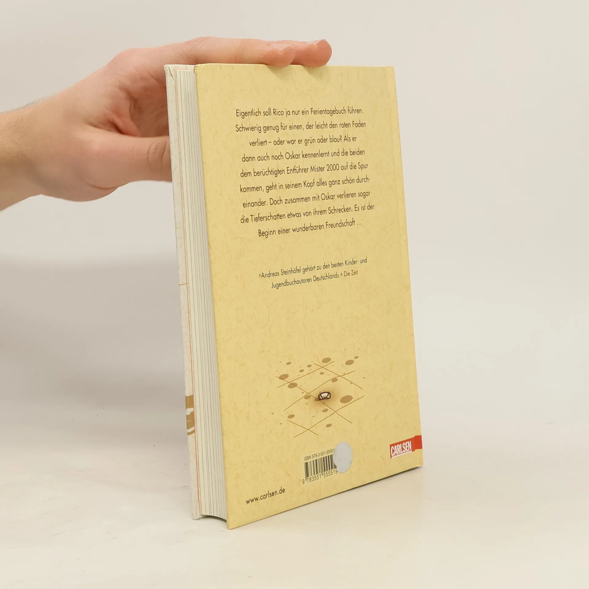 Eigentlich soll Rico ja nur ein Ferientagebuch führen. Schwierig genug für einen, der leicht den roten oder den grünen oder auch den blauen Faden verliert. Aber als er dann auch noch Oskar mit dem blauen Helm kennen lernt und die beiden dem berüchtigten ALDI-Kidnapper auf die Spur kommen, geht es in seinem Kopf ganz schön durcheinander. Doch zusammen mit Oskar verlieren sogar die Tieferschatten etwas von ihrem Schrecken. Es ist der Beginn einer wunderbaren Freundschaft ... Alle Bücher über Rico und Oskar:Rico, Oskar und der Diebstahlstein Rico, Oskar und das Herzgebreche Rico, Oskar und die TieferschattenRico, Oskar und das Vomhimmelhoch Kindercomics:Rico & Oskar – Fische aus Silber Rico & Oskar – Die Regenhütte