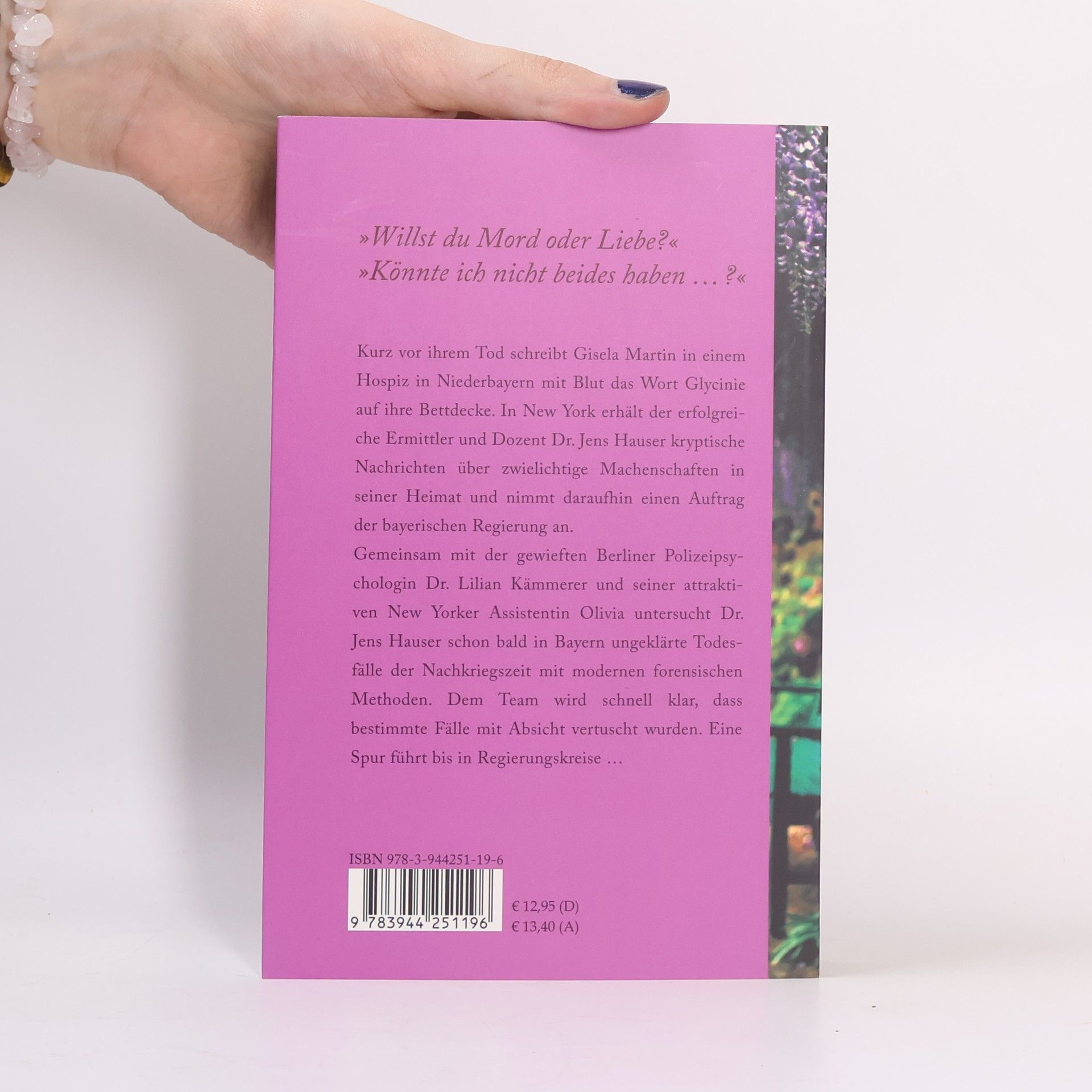 'Willst du Mord oder Liebe?' 'Könnte ich nicht beides haben.?' Kurz vor ihrem Tod schreibt Gisela in Niederbayern das Wort 'Glycinie' mit Blut auf ihre Bettdecke im Hospiz. In New York bekommt der erfolgreiche Ermittler und Dozent Dr. Jens Hauser eine kryptische Nachricht über illegale Machenschaften in seiner niederbayerischen Heimat. Nach Kelheim zurück zu kehren ist er nicht nur seiner Kindheitsfreundin Gisela schuldig, sondern vor allem sich selbst. Die Polizeipsychologin Lilian Blank verliebt sich bereits am Flughafen in den brillanten Kriminalisten. Dr. Jens Hauser genießt in Amerika einen untadeligen Ruf. In Bayern hat man Bedenken. Zunächst bekommt Jens für zwei Jahre einen Spezialauftrag vom Innenministerium. Mit Lilian und seiner New Yorker Assistentin Olivia arbeitet Jens an ungelösten Morden der bayerischen Nachkriegszeit. Was den Kriminalisten jedoch am meisten beschäftig ist seine eigene Vergangenheit. Zu viele Spuren, unter anderem der ungeklärte Tod seiner Freundin Gisela, führen zurück in das Jahr 1969. Schon bald ermitteln sie zu dritt in dem düsteren Glycinien-Mordfall, dessen zerstörerische Tentakeln bis in höchste Regierungskreise weisen. Nach dem erfolgreichen Weihnachtsroman 'Maria sucht Josef' schrieb die in Bayern geborene Autorin Nicole Joens einen raffinierten Kriminalroman - ein Lesevergnügen ersten Ranges.