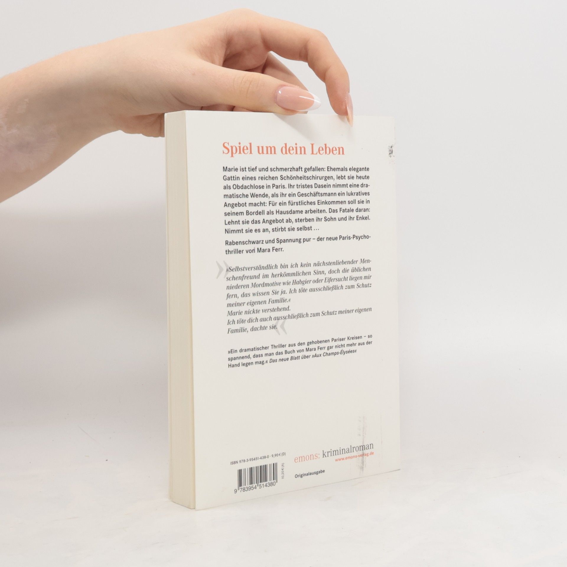 Marie ist schnell und schmerzhaft gefallen: Ehemals elegante Gattin eines reichen Schönheitschirurgen, lebt sie heute als Obdachlose in Paris. Ihr tristes Dasein nimmt eine dramatische Wende, als ihr ein Geschäftsmann ein lukratives Angebot macht: Für ein fürstliches Einkommen soll sie in seinem Etablissement als Hausdame fungieren. Das Fatale daran: Lehnt sie das Angebot ab, sterben ihr Sohn und Enkel. Nimmt sie es an, wird sie selbst sterben.