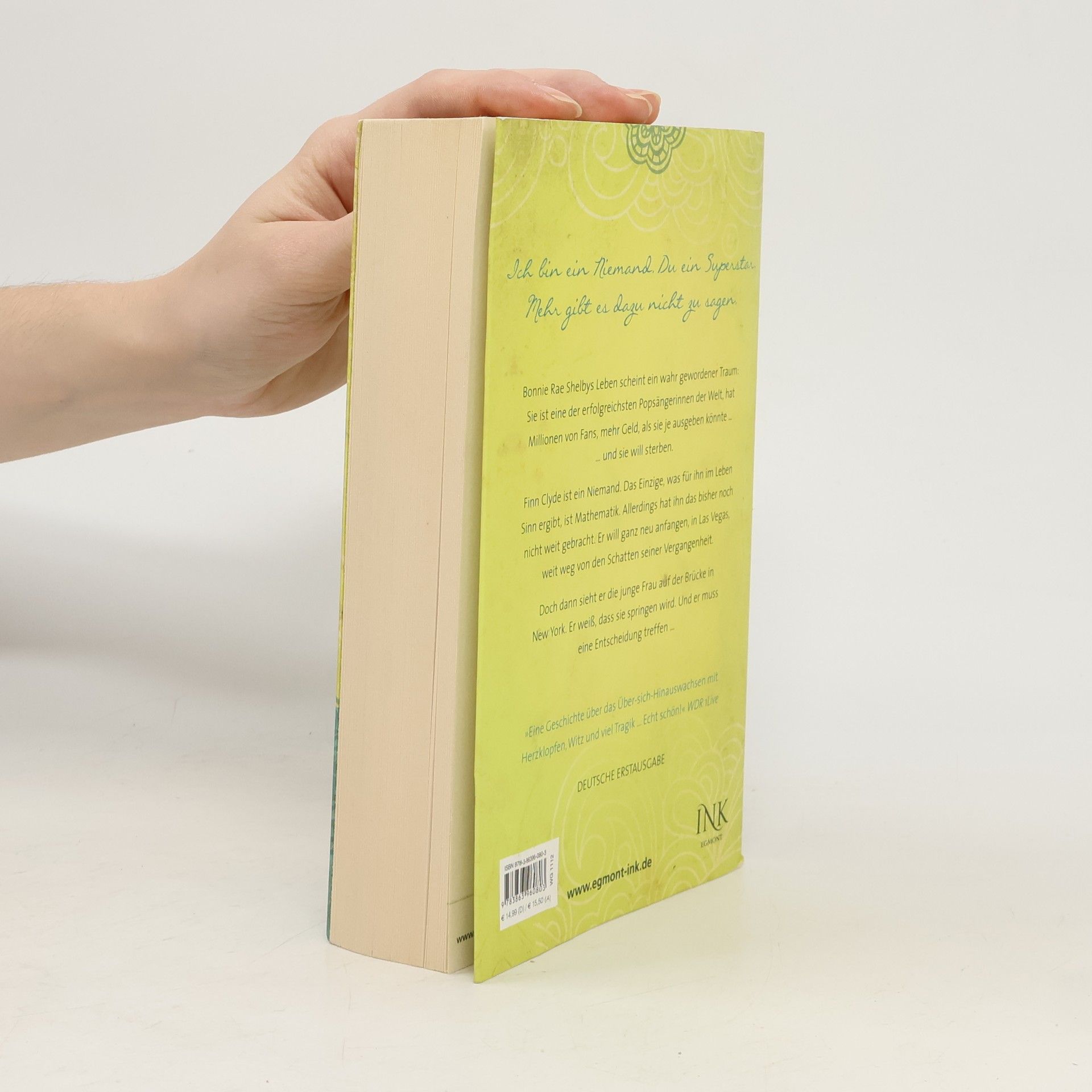 Bonnie Rae Shelbys Leben scheint ein wahr gewordener Traum: Sie ist eine der erfolgreichsten Popsängerinnen der Welt, hat Millionen von Fans, mehr Geld, als sie je ausgeben könnte ... und sie will sterben. Finn Clyde ist ein Niemand. Das Einzige, was für ihn im Leben Sinn ergibt, ist Mathematik. Allerdings hat ihn das bisher noch nicht weit gebracht. Er will ganz neu anfangen, in Las Vegas, weit weg von den Schatten seiner Vergangenheit. Doch dann sieht er die junge Frau auf der Brücke in New York. Er weiß, dass sie springen wird. Und er muss eine Entscheidung treffen ... „Eine Geschichte über das Über-sich-Hinauswachsen mit Herzklopfen, Witz und viel Tragik ... Echt schön!“ WDR 1Live