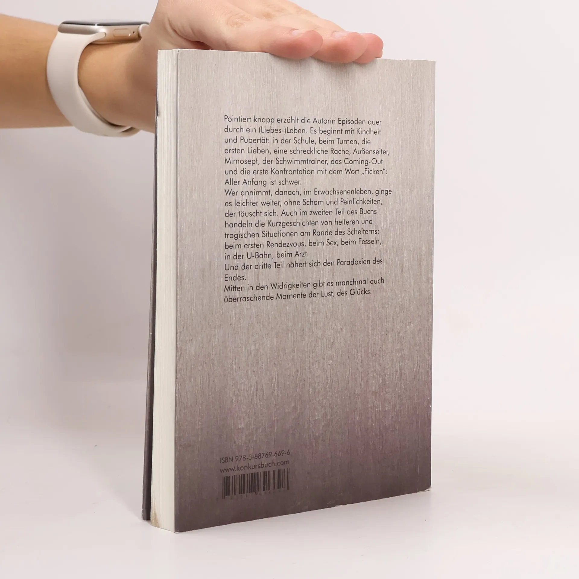Pointiert knapp erzählt die Autorin Episoden quer durch ein (Liebes-)Leben. Es beginnt mit Kindheit und Pubertät: in der Schule, beim Turnen, die ersten Lieben, eine schreckliche Rache, Außenseiter, Mimosept, der Schwimmtrainer, das Coming-Out und die erste Konfrontation mit dem Wort „Ficken“: Aller Anfang ist schwer. Wer annimmt, danach, im Erwachsenenleben, ginge es leichter weiter, ohne Scham und Peinlichkeiten, der täuscht sich. Auch im zweiten Teil des Buchs handeln die Kurzgeschichten von heiteren und tragischen Situationen am Rande des Scheiterns: beim ersten Rendezvous, beim Sex, beim Fesseln, in der U-Bahn, beim Arzt. Und der dritte Teil nähert sich den Paradoxien des Endes. Mitten in den Widrigkeiten gibt es manchmal auch überraschende Momente der Lust, des Glücks.