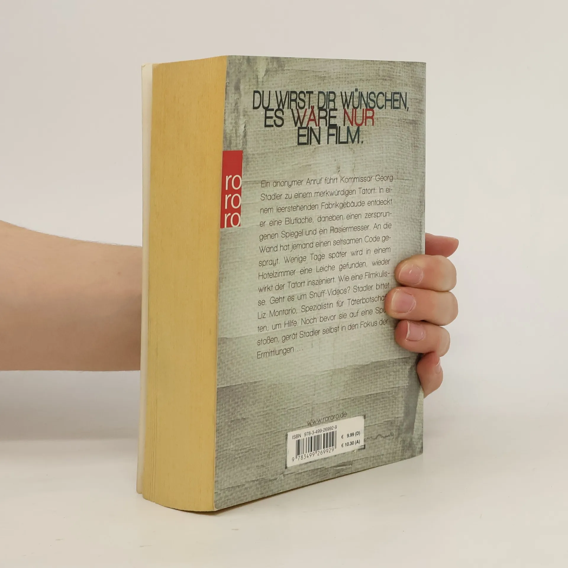 Du wirst Dir wünschen, es wäre nur ein Film. Ein anonymer Anruf führt Kommissar Georg Stadler zu einem merkwürdigen Tatort: In einem leerstehenden Fabrikgebäude entdeckt er eine Blutlache, daneben einen zersprungenen Spiegel und ein Rasiermesser. An die Wand hat jemand einen seltsamen Code gesprayt. Wenige Tage später wird in einem Hotelzimmer eine Leiche gefunden, wieder wirkt der Tatort inszeniert. Wie eine Filmkulisse. Geht es um Snuff-Videos? Stadler bittet Liz Montario, Spezialistin für Täterbotschaften, um Hilfe. Noch bevor sie auf eine Spur stoßen, gerät Stadler selbst in den Fokus der Ermittlungen …