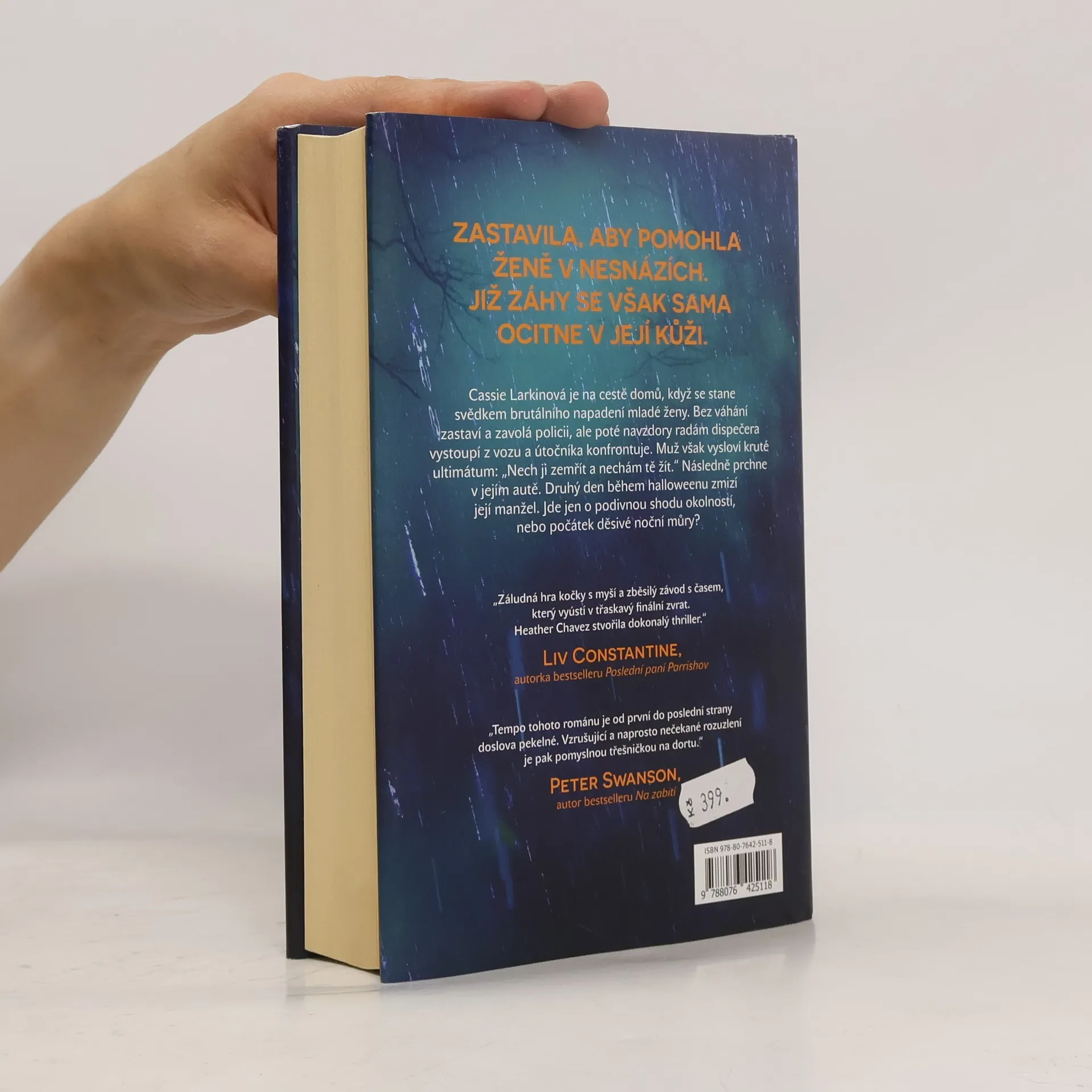 Jedné deštivé noci jede veterinářka Cassie Larkinová ve svém autě sama domů, když se stane svědkem brutálního napadení mladé ženy obrovským mužem. Bez váhání zastaví a zavolá policii, ale poté navzdory radám dispečera ze svého vozu vystoupí a útočníka konfrontuje. Muž však vysloví kruté ultimátum: „Když ji necháš zemřít, nechám tě naživu.“ Jakožto lékařka, třebaže veterinární, je však odhodlána ženě v bezvědomí pomoci, a zatímco ji prohlíží, útočník prchá v jejím autě. A co je horší, teď zná její jméno. Její adresu. A ví o jejích dětech. Policisté, kteří případ vyšetřují, se snaží Cassie ujistit, že se nemá čeho bát – pachatel už bude jistě kdesi daleko. Ale ona si tím není tak jistá… Příštího večera zmizí během halloweenského koledování s jejich šestiletou dcerou Cassiin manžel Sam. Jde jen o podivnou shodu okolností, nebo počátek děsivé noční můry? Ano, Sam byl v poslední době odtažitý – je možné, že si něco začal s jinou ženou? Nebo je manželovo zmizení nějak spojené s Cassiiným setkáním s neznámým útočníkem? Tyto a další otázky jí divoce víří hlavou a Cassie ví, že nemůže věřit nikomu, možná ani sobě. Zcela jistě však ví, že nemůže jen nečinně přihlížet, zatímco jsou její nejbližší vystaveni smrtelnému nebezpečí…