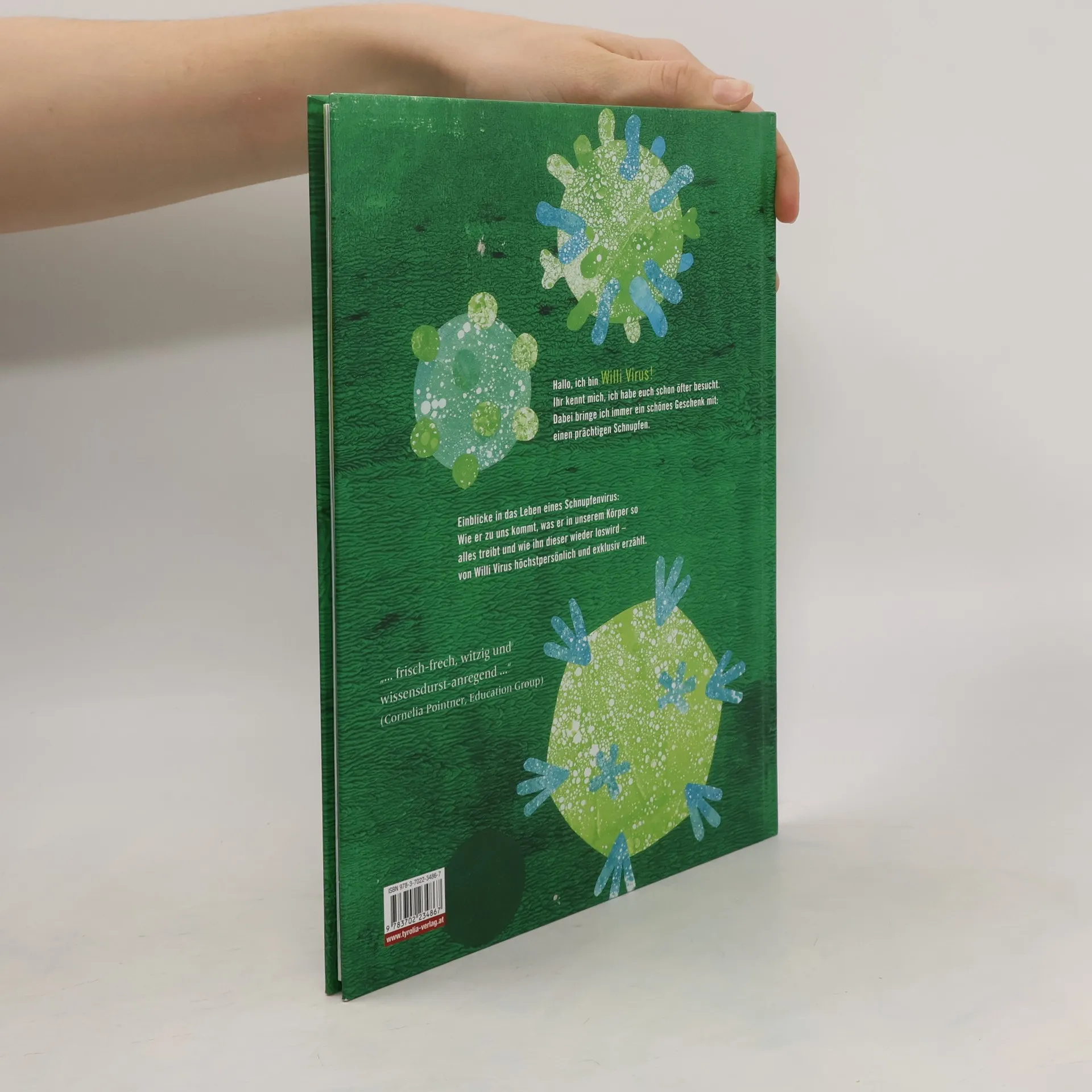 Alles über Viren, ihre Entstehung und Verbreitung Niemand mag ihn, niemand findet ihn sympathisch und alle wollen ihn möglichst schnell wieder loswerden. Aber er ist auch wahrlich kein netter Zeitgenosse, bringt er doch eine rinnende, tropfende oder gar verstopfte Nase, tränende Augen und im schlimmsten Fall auch noch Kopfschmerzen mit sich. Wir dürfen vorstellen: Willi Schnupfenvirus. Doch auch, wenn ihn fast alle kennen, so ist kaum bekannt, welche Art von Unwesen er in unserem Körper genau treibt und mit welch beeindruckenden Mitteln ihn dieser wieder loswird. Nach ihrem äußerst erfolgreichen Bilderbuchdebüt mit „Gerda Gelse“ (Tyrolia, 2013) legt Heidi Trpak hier ein geniales Sachbilderbuch vor, in dem sie ein Phänomen unter die Lupe nimmt, das alltäglicher fast nicht sein kann, zu dem aber dennoch genaueres Wissen kaum verbreitet ist – ein Wissen, das durch Willis Cousine Cordula Corona aus China, die in der neuen Auflage des Buches auch vorkommt, gerade extrem wichtig geworden ist: Was passiert da eigentlich im Körper? Was genau sind denn nun Fresszellen, Abwehrzellen und Gedächtniszellen und wie kann ich mich und andere vor einer Ansteckung schützen? – das sind die Fragen, die in diesem Sachbilderbuch ebenso informativ wie kurzweilig beantwortet werden. Die Illustrationen stammen von Leonora Leitl, die durch die Wahl innovativer Illustrationstechniken (u. a. mit gefrorener Gelatine) einen sachlich richtigen und gleichzeitig wunderbaren Einblick in diese faszinierende und beeindruckende Mikrowelt ermöglicht. 3. Auflage erweitert mit dem Corona-Virus Pressestimmen: „Verständlich und humorvoll erzählt und mit vielen witzigen Bildern garniert.“ Stiftung Lesen „Willi Virus eignet sich wunderbar, Kindern Virus-Erkrankungen und deren Verbreitung zu erklären.“ buchwegweiser. de Auszeichnungen: 2016: Österreichischer Kinder- und Jugendbuchpreis - Preisbuch 2016: Shortlist Junior - Bestes Wissenschaftsbuch des Jahres 2015: Die 100 Besten - Neue Kinder- und Jugendbücher