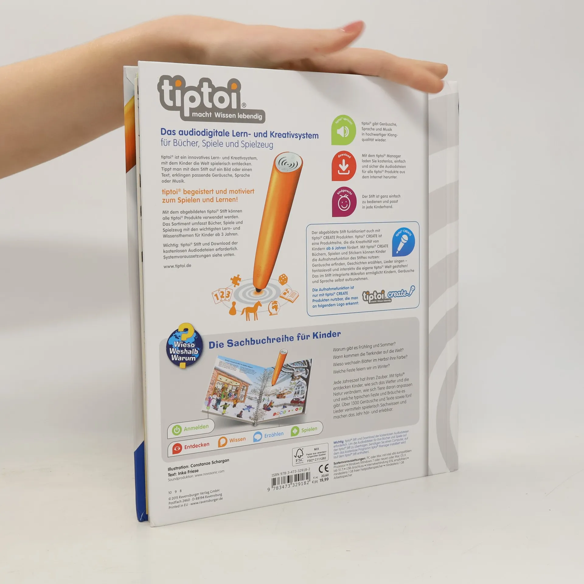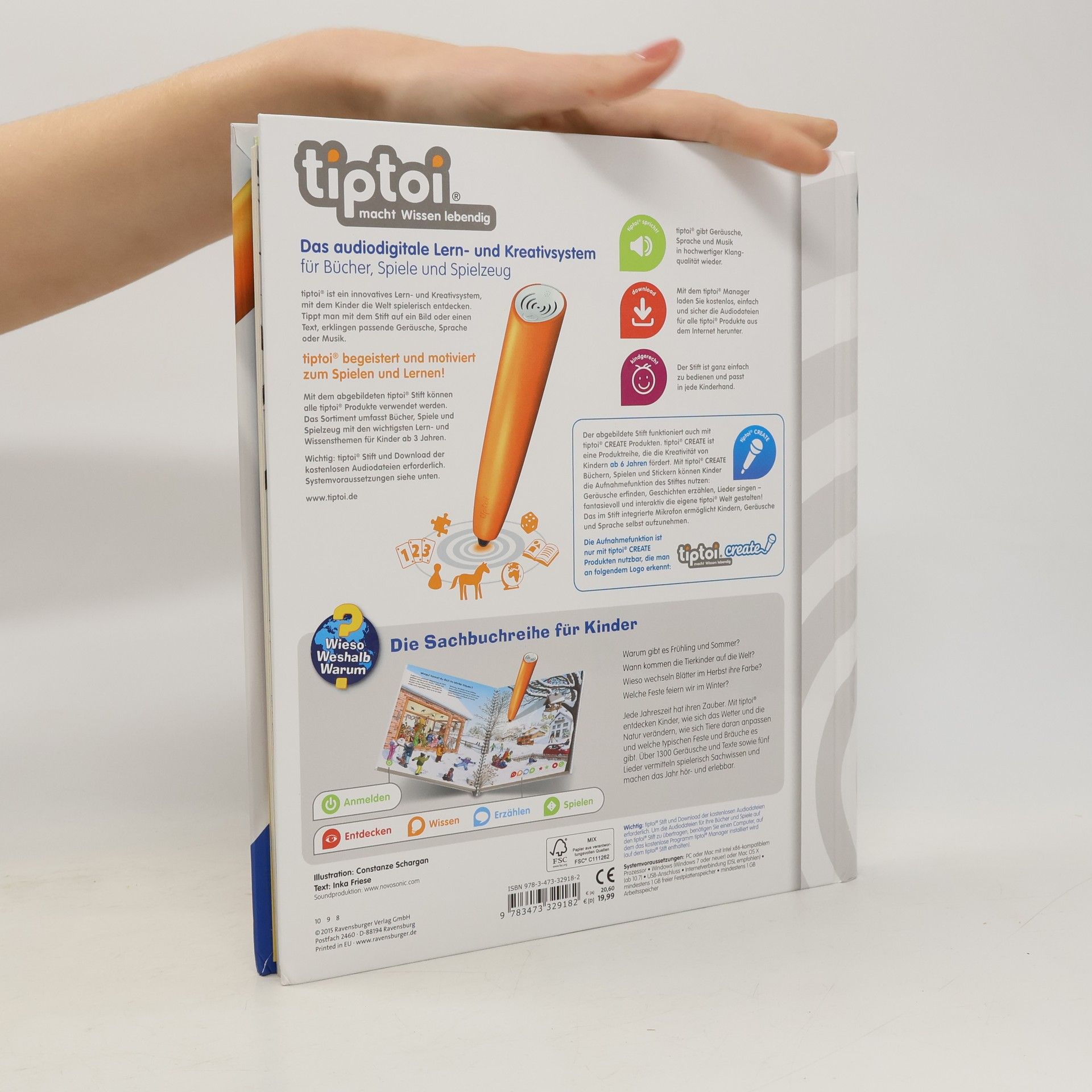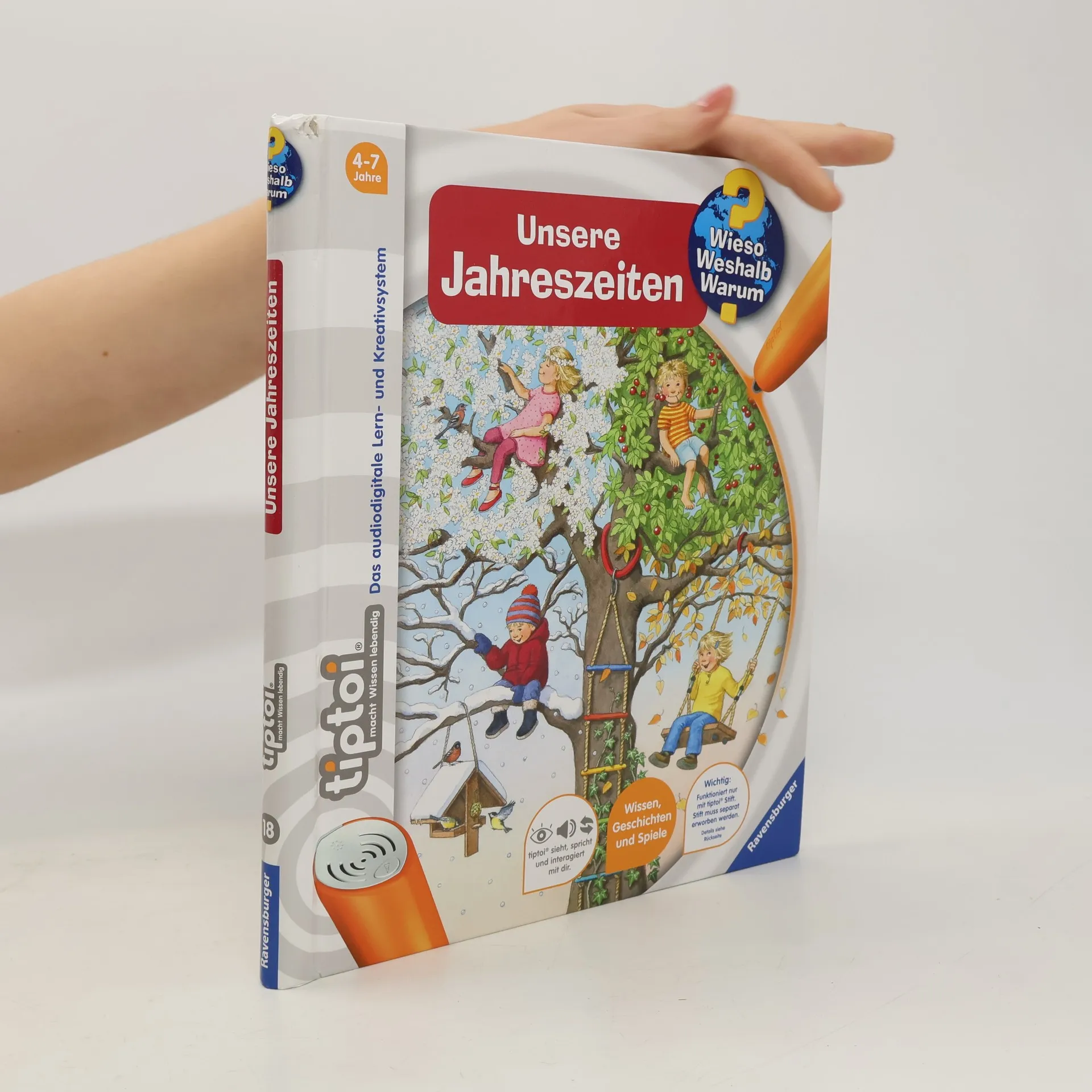 Frühling, Sommer, Herbst und Winter! Jede Jahreszeit hat ihren Zauber, ihre Geräusche und Lieder: Im Frühling sprießen die Bäume und die Vögel zwitschern um die Wette. Im Sommer zirpen die Grillen und summen die Bienen. Im Herbst erfüllen Kindergesänge und das Licht unzähliger Laternen die Straßen. Im Winter lockt knirschender Schnee Groß und Klein nach draußen. Authentische Geräusche, detailreiche Bilder und liebevolle Sachtexte und Dialoge lassen die Jahreszeiten auf neue Weise lebendig werden. Was macht der Traktor auf dem Feld? Wann kommt die Feuerwehr? Wie groß wird ein Pony? Die interaktive Sachbuchreihe tiptoi Wieso? Weshalb? Warum? beantwortet wichtige Kinderfragen auf Augenhöhe. Auf den liebevoll illustrierten Seiten tauchen die Kinder in eine Welt ein, die durch zahlreiche authentische Geräusche lebendig wird. Das Sachwissen wird altersgerecht erklärt und ist fachlich geprüft. Die Kinder können sich dank der einfachen und intuitiven Nutzung mit dem tiptoi-Stift das Wissen selbst erschließen. Sie lernen, Zusammenhänge zu begreifen und erfahren spannende Informationen über ihren Alltag und ihre Umwelt. Tolle Geschichten, Lieder und unterhaltsame Spiele laden dabei immer wieder zum selbstständigen Entdecken und Erforschen ein. tiptoi-Stift nicht enthalten. Muss separat erworben werden.