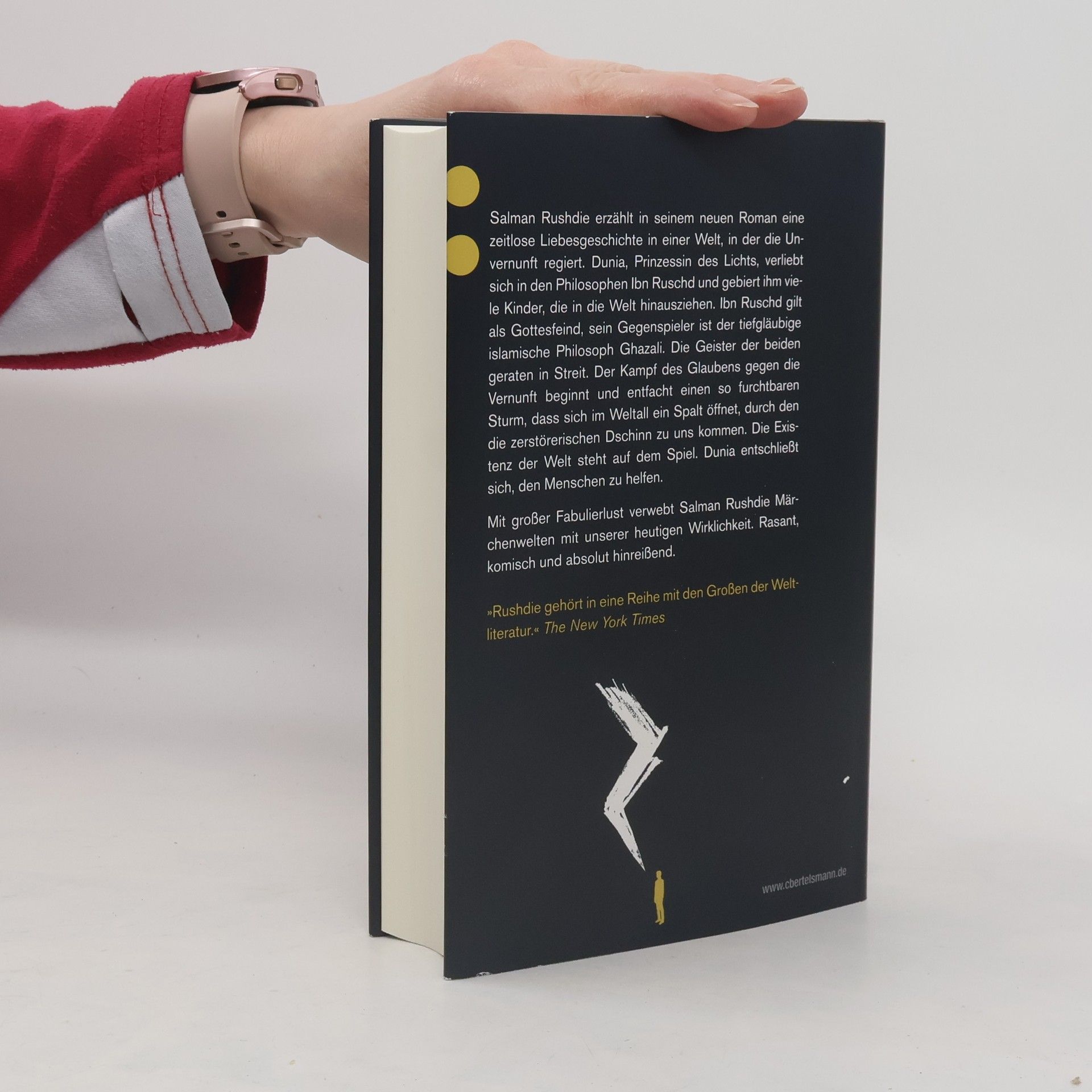 Salman Rushdie erzählt in seinem neuen Roman eine zeitlose Liebesgeschichte in einer Welt, in der die Unvernunft regiert. Dunia, die Fürstin des Lichts, verliebt sich in den Philosophen Ibn Rush und zeugt mit ihm viele Kinder, die in die Welt hinaus ziehen. Ibn Rush gilt als Gottesfeind, sein Gegenspieler ist der tiefgläubige islamische Philosoph Ghazali. Die Geister der beiden geraten in Streit. Der Kampf des Glaubens gegen die Vernunft beginnt und entfacht einen so furchtbaren Sturm, dass sich im Weltall ein Spalt öffnet, durch den die zerstörerischen Dschinn zu uns kommen. Die Existenz der Welt steht auf dem Spiel. Dunia entschließt sich, den Menschen zu helfen. Mit großer Fabulierlust verwebt Salman Rushdie Märchenwelten mit unserer heutigen Wirklichkeit. Rasant, komisch und absolut hinreißend, denn Zwei Jahre, acht Monate und achtundzwanzig Nächte ergeben genau tausendundeine Nacht.