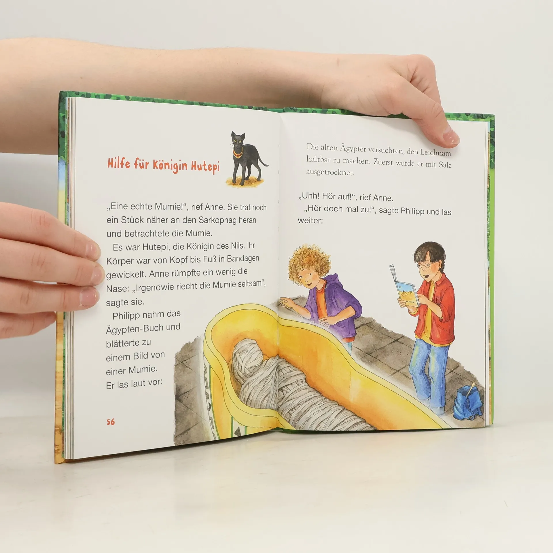 Das Buch ist bei deiner Buchhandlung vor Ort und bei vielen Online-Buchshops erhältlich! + Bücher, die Kinder gerne lesen wollen + Beliebte Themen: Abenteuer, Tiere, fremde Länder und das alte Ägypten + Hochwertiges Hardcover + Mit vielen Illustrationen + Bereits über 10 Millionen verkaufte Bücher der Baumhaus-Reihe + Ausgewogenes Text-Bild-Verhältnis + Große Schrift + Kurze Kapitel + Anne und Philipp sind ins alte Ägypten gereist, zu den Pyramiden! Im Inneren verbergen sich bestimmt unzählige Schätze – vielleicht sogar eine Mumie? Die Kinder gehen auf Entdeckungstour und sind bald einem rätselhaften Geheimnis auf der Spur: Eine Geisterkönigin wandelt seit Jahrhunderten einsam durch die Gänge und nur das Buch der Toten kann sie erlösen. Werden die Geschwister es finden? Basierend auf der Originalausgabe Das magische Baumhaus – „Das Geheimnis der Mumie“. Gekürzt und zum Vorlesen bearbeitet, mit vielen farbigen Illustrationen. Die beliebte Kinderbuch-Reihe von Bestsellerautorin Mary Pope Osborne zum Vorlesen und Selberlesen. Die Geschwister Anne und Philipp reisen mit dem magischen Baumhaus durch die Zeit, entdecken ferne Länder und erleben spannende Abenteuer. Mit vielen bunten Bildern, besonders für Kinder ab 5 Jahren geeignet. Mehr Infos zur Reihe und tolle Extras unter: www.MagischesBaumhaus.de