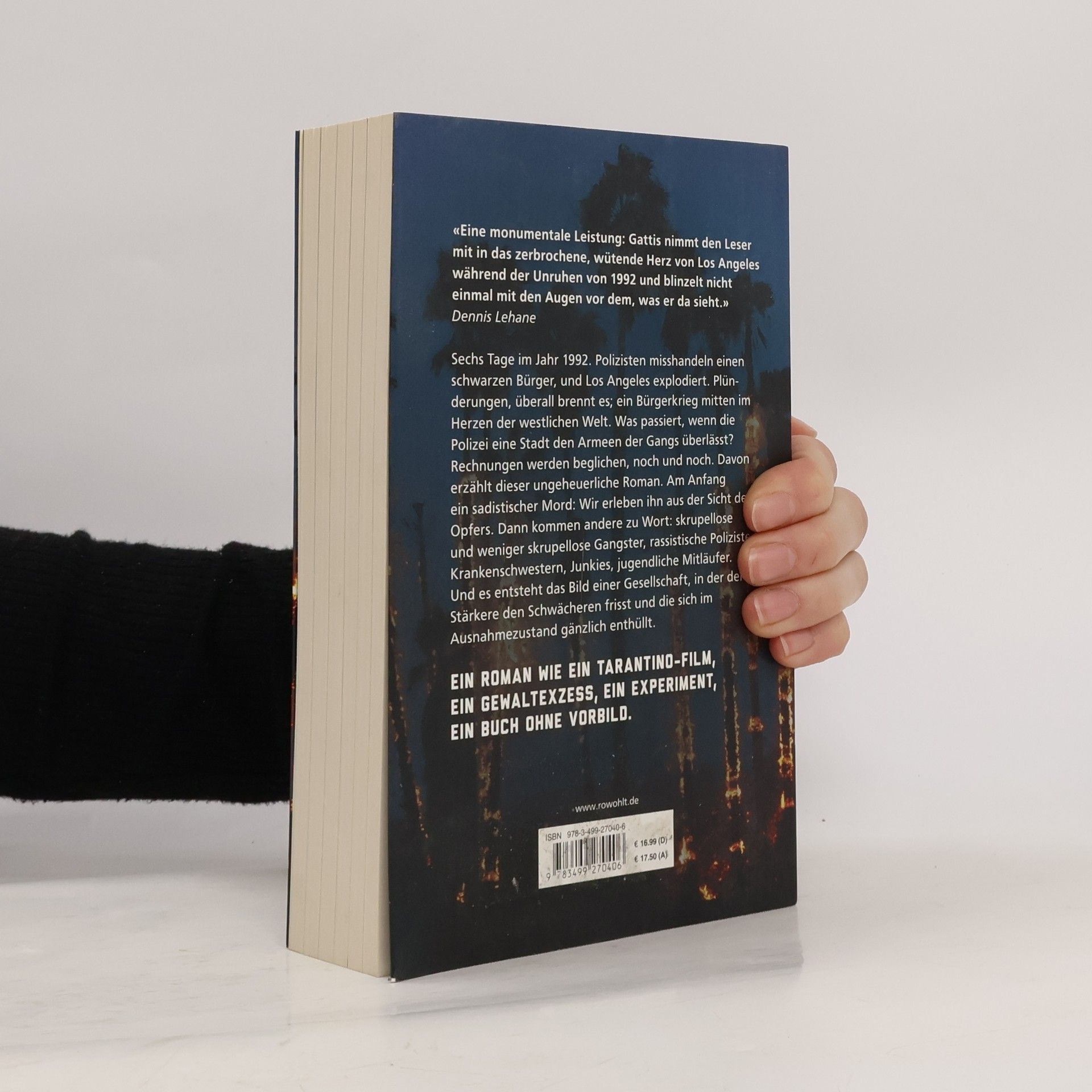 Sechs Tage im Jahr 1992. Polizisten misshandeln einen schwarzen Bürger und Los Angeles explodiert. Plünderungen, überall brennt es; ein Bürgerkrieg mitten im Herzen der westlichen Welt. Was passiert, wenn die Polizei eine Stadt den Armeen der Gangs überlässt? Rechnungen werden beglichen, noch und noch. Davon erzählt dieser ungeheuerliche Roman. Am Anfang ein unmenschlicher Mord: Wir erleben ihn aus der Sicht des Opfers. Dann kommen andere zu Wort: skrupellose und weniger skrupellose Gangster, rassistische Polizisten, Krankenschwestern, Junkies, jugendliche Mitläufer. Und es entsteht das Bild einer Gesellschaft, in der der Stärkere den Schwächeren frisst und die sich im Ausnahmezustand gänzlich enthüllt. Ein Roman wie ein Tarantino-Film, ein Gewaltexzess, ein Experiment, ein Buch ohne Vorbild.