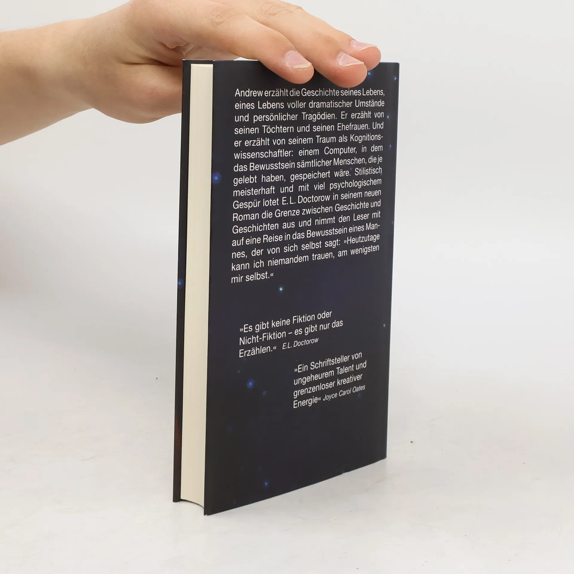 »Es gibt keine Fiktion oder Nicht-Fiktion – es gibt nur das Erzählen.« E. L. Doctorow nimmt uns in seinem neuen Roman mit auf eine Reise in das Bewusstsein eines Mannes, dessen Leben von dramatischen Umständen und Tragödien geprägt ist. Andrew erzählt von seinen Töchtern; die erste starb durch seine Schuld, die zweite musste er weggeben. Er reflektiert über seine Ehefrauen: von der ersten ist er getrennt, die zweite starb am 11. September 2001. Auch sein Traum als Kognitionswissenschaftler, einen Computer zu schaffen, der das Bewusstsein aller Menschen speichert, wird thematisiert. Während Andrew seine Geschichte entfaltet, stellen sich die Leser Fragen zu Wahrheit und Erinnerung, Gehirn und Verstand, sowie zu Schicksal und Eigenverantwortung. Andrew ist sich sicher: »Heutzutage kann ich niemandem trauen, am wenigsten mir selbst.« Mit meisterhaftem Stil, sprachlicher Finesse, Humor und psychologischem Gespür erkundet Doctorow die Grenze zwischen Geschichte und Geschichten, spiegelt sie an historischen Ereignissen und offenbart die tiefgehende Wahrheit, die im Erzählen verborgen liegt.