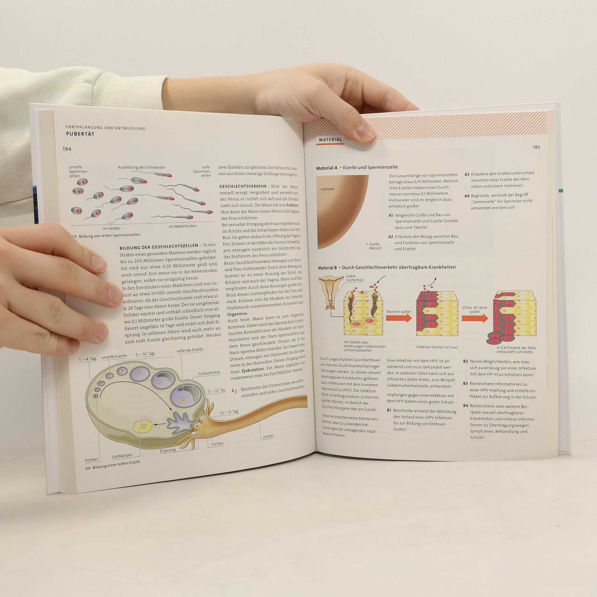Zum AufbauDas Lehrwerk ist fachsystematisch strukturiert. Jedes Hauptkapitel startet mit einer Doppelseite, die kurz den Inhalt vorstellt und mit einem großen motivierenden Foto zum Kapitelthema hinführt. Die Informations-Seite am Kapitelanfang beginnt jeweils mit einem themenbezogenen Einstiegsfoto. Der daran anschließende Einstiegstext orientiert sich an der Abbildung und endet mit einer zum Kapitelinhalt einführenden Frage. Auf der Material-Seite gibt es Aufgaben aller Anforderungsniveaus. Diese berücksichtigen darüber hinaus die in den KMK-Empfehlungen zum Mittleren Bildungsabschluss aufgeführten Kompetenzbereiche. Im-Blickpunkt-Seiten zeigen zusätzliche Kontextbezüge auch im Sinne eines fächerübergreifenden Arbeitens auf. Die Methoden-Seiten stellen wichtige Arbeitsmethoden der Biologie dar - die Schüler/-innen können die erlernten Methoden direkt auf der Material-Seite anwenden. Basiskonzepte werden gemäß den Bildungsstandards an konkreten Beispielen eingeführt, auf den Material-Seiten wieder aufgegriffen und im Grundwissen verknüpft. Grundwissen-Seiten fassen zentrale Inhalte am Ende der Hauptkapitel zusammen.