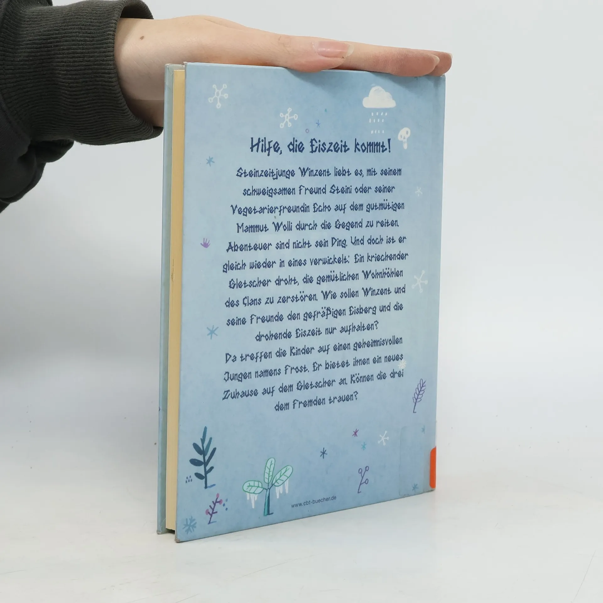 Hilfe die Eiszeit kommt! Steinzeitjunge Winzent liebt es, mit seinem schweigsamen Freund Steini oder seiner Vegetarierfreundin Echo auf dem gutmütigen Mammut Wolli durch die Gegend zu reiten. Abenteuer sind nicht sein Ding. Und doch ist er gleich wieder in eines verwickelt: Ein kriechender Gletscher droht, die gemütlichen Wohnhöhlen des Clans zu zerstören. Wie sollen Winzent und seine Freunde den gefräßigen Eisberg und die drohende Eiszeit nur aufhalten? Da treffen die Kinder auf den geheimnisvollen Jungen namens Frost. Er bietet ihnen ein neues Zuhause auf dem Gletscher an. Können die drei dem Fremden trauen?