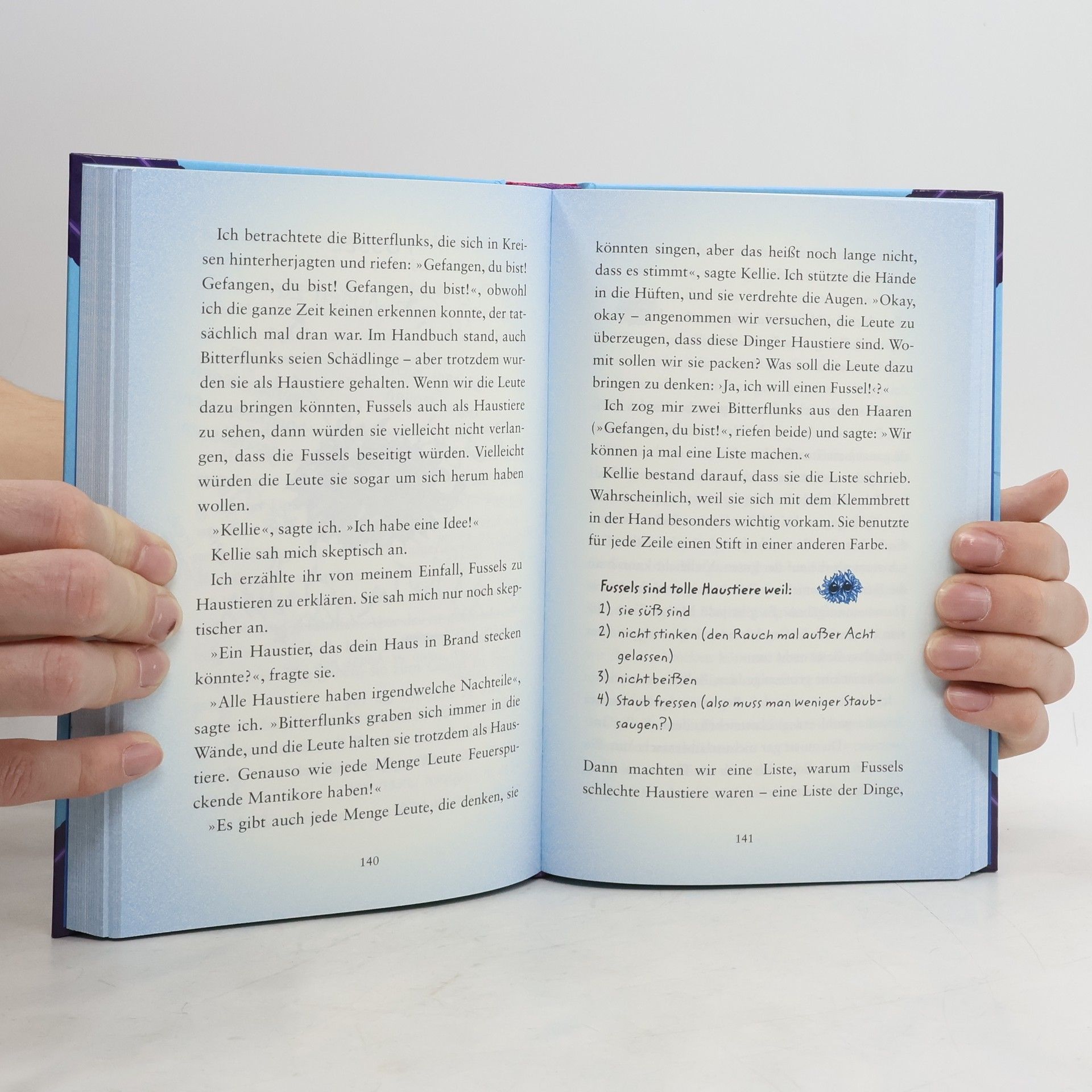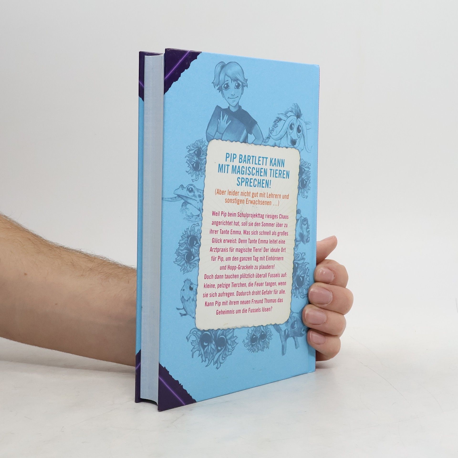 Die neunjährige Pip Bartlett hat eine besondere Gabe: Sie kann mit magischen Tieren sprechen – mit Einhörnern, Seidengreifen und Hopp-Grackeln. Mit Eltern und Lehrern klappt die Verständigung allerdings manchmal nicht so gut. Weshalb Pip in den Sommerferien wegen des Einhorn-Vorfalls (wer denkt denn auch, dass die so doof sind!) zu ihrer Tante Emma verbannt wird. Emma leitet eine Praxis für magische Tiere, und begeistert plaudert Pip den ganzen Tag mit den verrücktesten Geschöpfen, die man je gesehen hat. Doch dann taucht ein abenteuerliches Problem auf, nämlich Unmengen von Fussels. Das Schlimme an diesen kleinen pelzigen Wesen: Wenn sie sich aufregen, gehen sie in Flammen auf … Hier können nur Pip und ihr neuer Freund Thomas helfen.