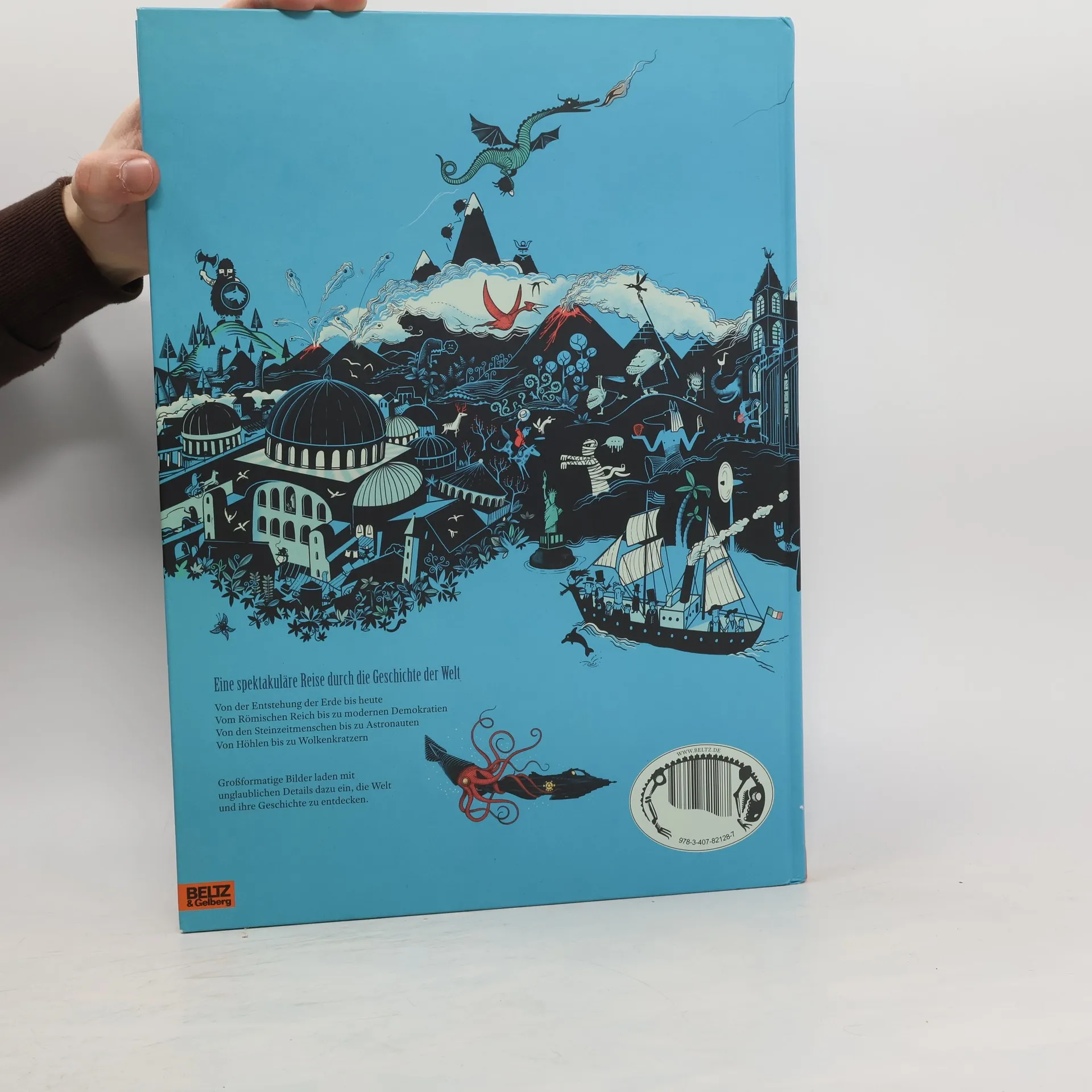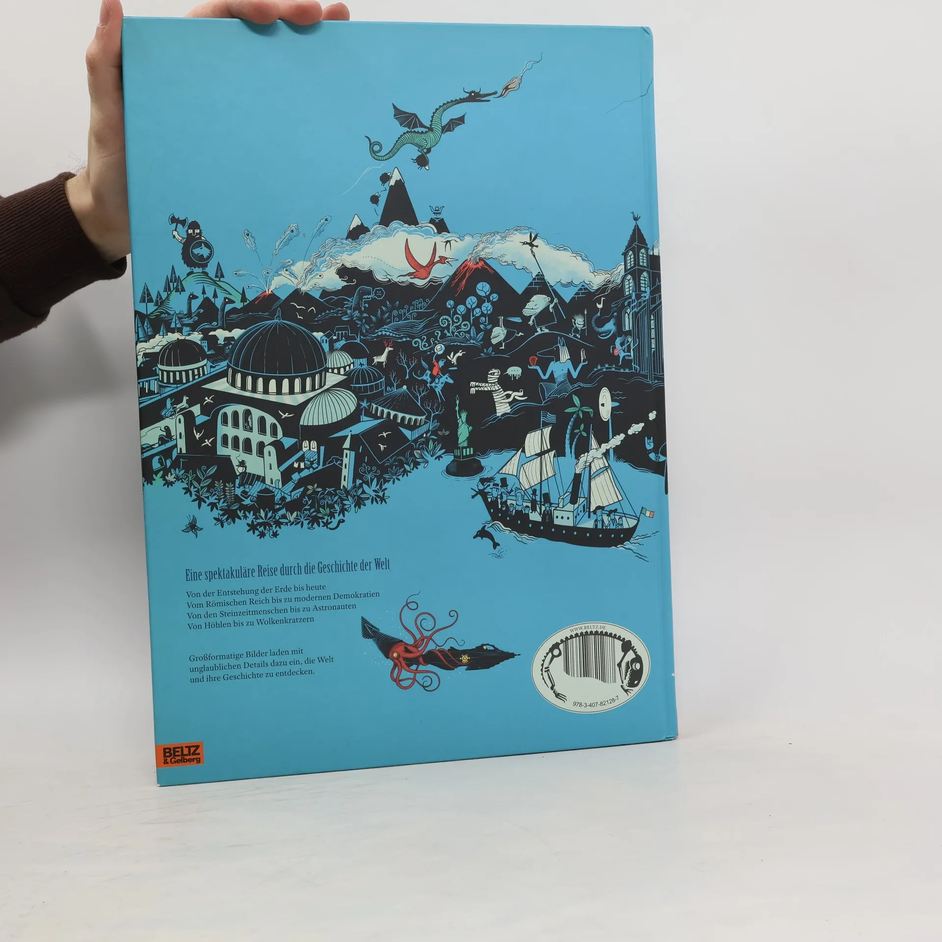 Großformatige, detailreiche Bilder laden ein zu einer Reise durch die Weltgeschichte vom Urknall bis zur Raumfahrt. Bildgewaltig und ausdrucksstark – mehr als ein Sachbilderbuch für Kinder und Erwachsene. Auf einem Zeitstrahl reist der Betrachter durch die Geschichte der Welt: Von den Anfängen bis zum heutigen Tag, über die Zeit der Dinosaurier, die großen menschlichen Zivilisationen, Könige und Ritter, Entdeckungen und Erfindungen ... In beeindruckenden, kunstvoll gezeichneten Bildern werden auf jeder Doppelseite eine Epoche oder ein Zeitalter dargestellt. Die Bilder sind durch kurze Texte ergänzt, die sachliche Informationen bieten. Ein grandioses, ungewöhnliches Werk!