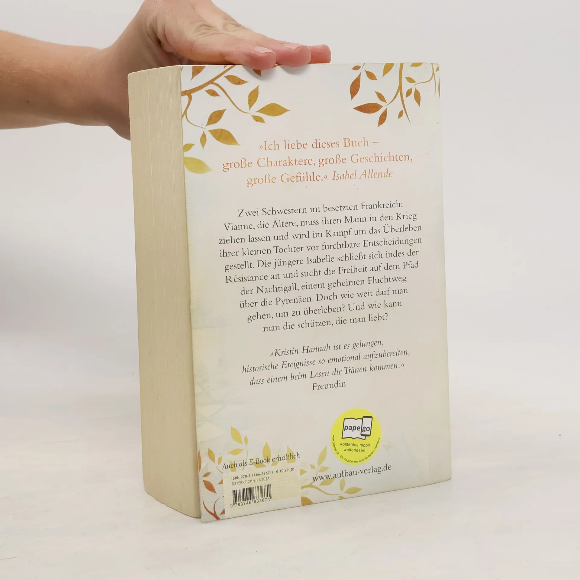 „Ich liebe dieses Buch – große Charaktere, große Geschichten, große Gefühle.“ Isabel Allende Zwei Schwestern im besetzten Frankreich: Vianne, die Ältere, muss ihren Mann in den Krieg ziehen lassen und wird im Kampf um das Überleben ihrer kleinen Tochter vor furchtbare Entscheidungen gestellt. Die jüngere Isabelle schließt sich indes der Résistance an und sucht die Freiheit auf dem Pfad der Nachtigall, einem geheimen Fluchtweg über die Pyrenäen. Doch wie weit darf man gehen, um zu überleben? Und wie kann man die schützen, die man liebt? »Kristin Hannah ist es gelungen, historische Ereignisse so emotional aufzubereiten, dass einem beim Lesen die Tränen kommen.« Freundin