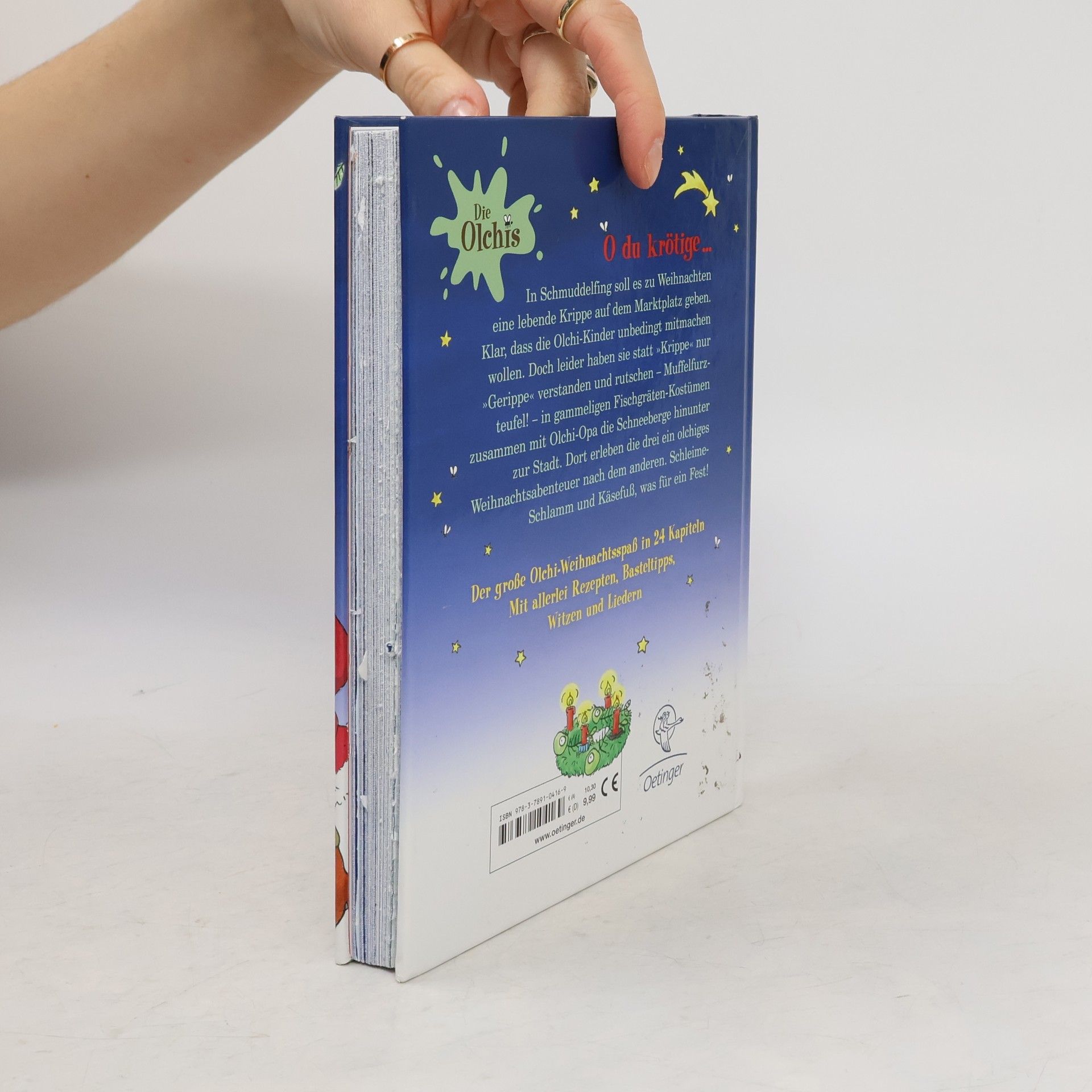 O du Krötige: Es weihnachtet in Schmuddelfing. Die Stadt sucht Darsteller für eine „lebendige Krippe“. Doof nur, dass die Olchis nur „Gerippe“ verstehen und unbedingt dabei sein wollen. Das weihnachtliche Chaos ist vorprogrammiert! Doch am Ende wird es doch noch ein besinnliches Fest – natürlich auf Olchi-Art. Die 24 Häppchen der Geschichte des Adventskalenderbuchs von Erhard Dietl sind in perforierten Seiten versteckt So können die Kinder täglich ein Olchi-„Türchen“ öffnen und sich dazwischen über Rätsel, Witze und Lieder freuen.