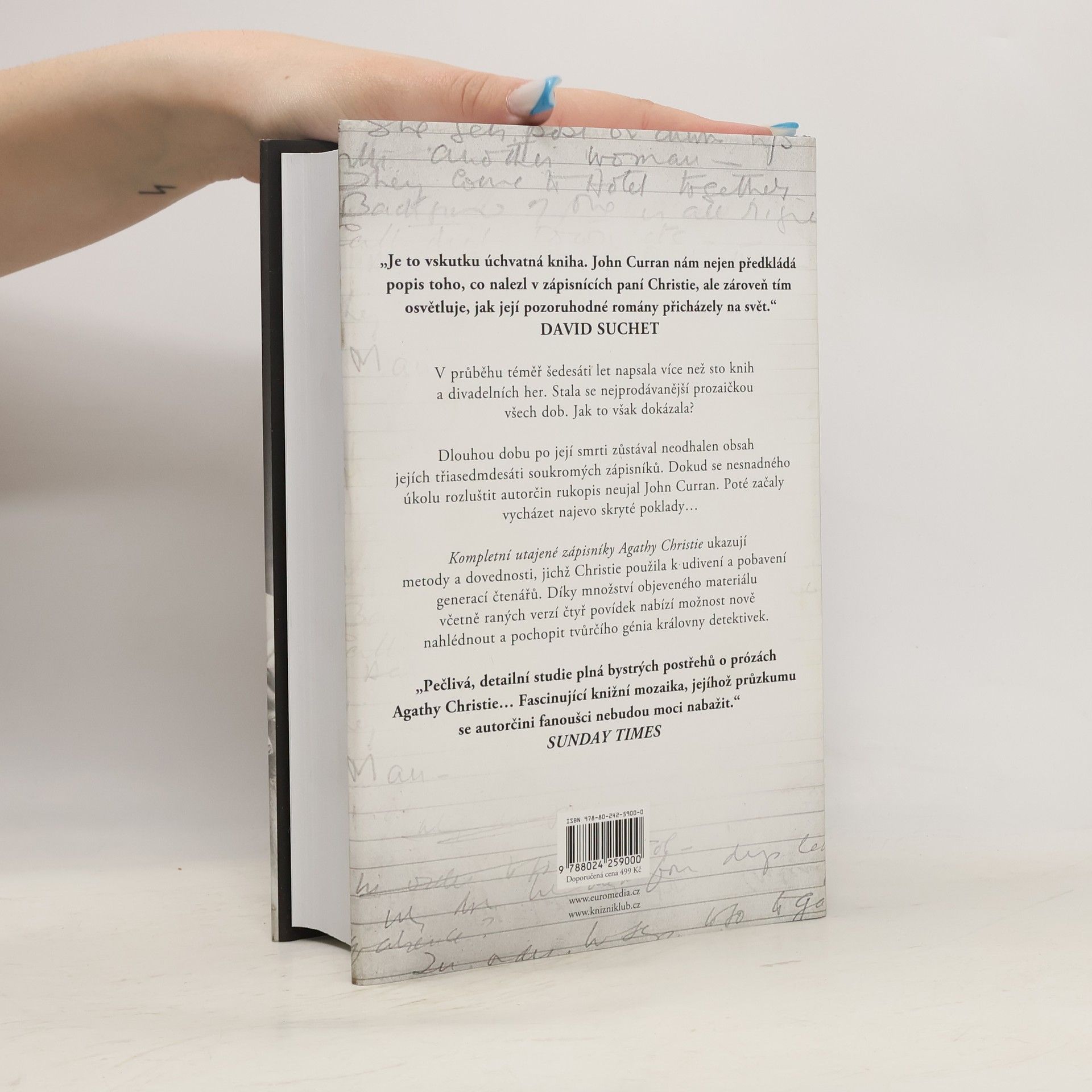 „Mnohá odhalení v této knize se stanou klíčovými k tomu, jak budou příští generace číst Christie.“ –Independent on Sunday Kompletní utajené zápisníky Agathy Christie vznikly spojením a doplněním toho nejpodstatnějšího z publikací Johna Currana, jenž měl možnost prostudovat 73 autorčiných poznámkových bloků, do nichž si Christie zapisovala zápletky svých detektivek (viz Utajené zápisníky Agathy Christie a Promyšlené vraždy Agathy Christie). V chronologickém sledu šesti desetiletí – od roku 1916, kdy Christie stvořila Poirota, do smrti této nejpopulárnější spisovatelky všech dob – Curran detailně odkrývá způsob, jak Christie dosáhla svého pozoruhodného úspěchu, překonává řadu zažitých pohledů na její tvorbu a přináší množství detailů a nejnovějších zjištění o spisovatelčiných uskutečněných i neuskutečněných, zdařilých, ale i méně povedených nápadech, o alternativních vyústěních jejích detektivek i o nově nalezených autorčiných povídkách (kniha zahrnuje jejich texty). Analýzu doplňují reprodukce vybraných stránek spisovatelčiných zápisníků, celek pak tvoří neocenitelného průvodce dílem Agathy Christie pro všechny milovníky jejích próz i detektivního žánru.