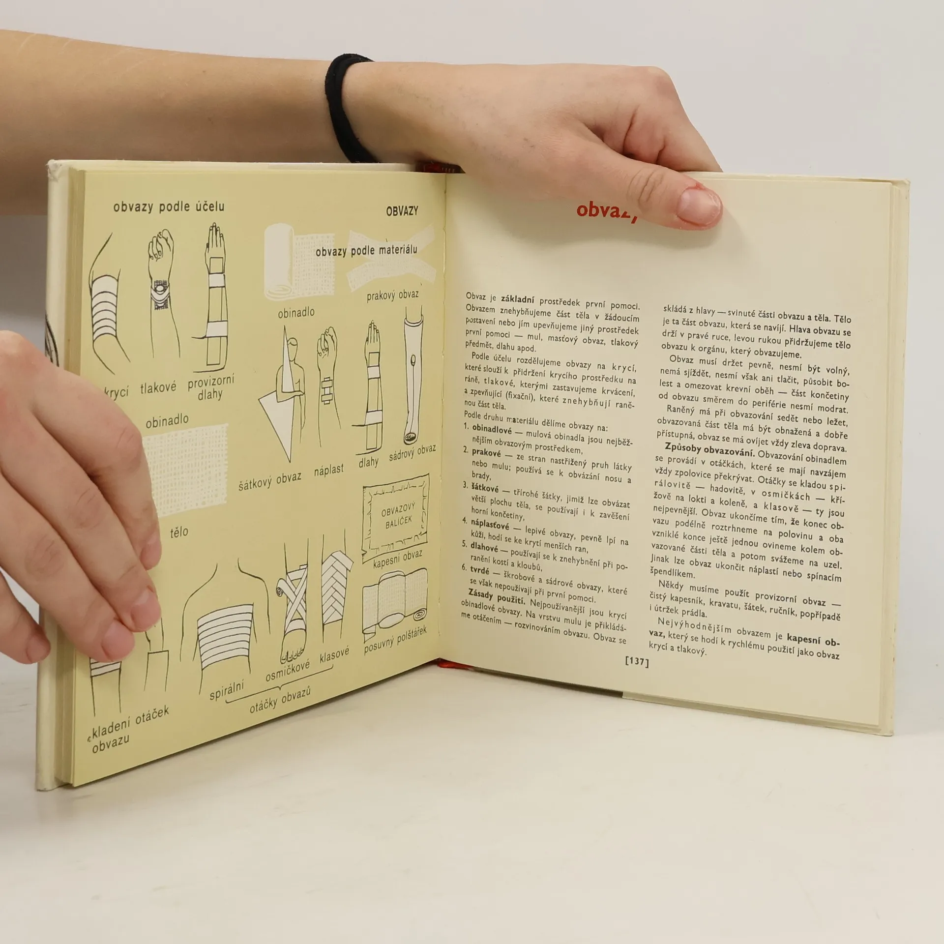 Veškeré druhy poranění a postupy při první pomoci, doplněno ilustracemi. Obsah: O první pomoci, Tělo, První pomoc, Poranění a úrazy, Podvrtnutí a vykloubení, Zlomeniny, Popáleniny, Omrznutí a vychladnutí, Zvlášní druhy poranění, Chemické poranění, Utopení, Otřes mozku, Poranění hrudníku, Poranění břicha, Poranění způsobené živočichy, Cizí tělesa, Dušení, Otravy, Šok, Mdloba, Bezvědomí, Kříšení, Náhlá onemocnění břicha, Jiné choroby vyžadující první pomoc, Hromadná válečná poranění, Hromadný úraz, Doprava raněných, Obvazy, Domácí lékárnička, Co s raněným ?, První pomoc při podnikových úrazech, v zemědělství, v domácnosti, v dopravě, při sportu, v školských zařízeních.