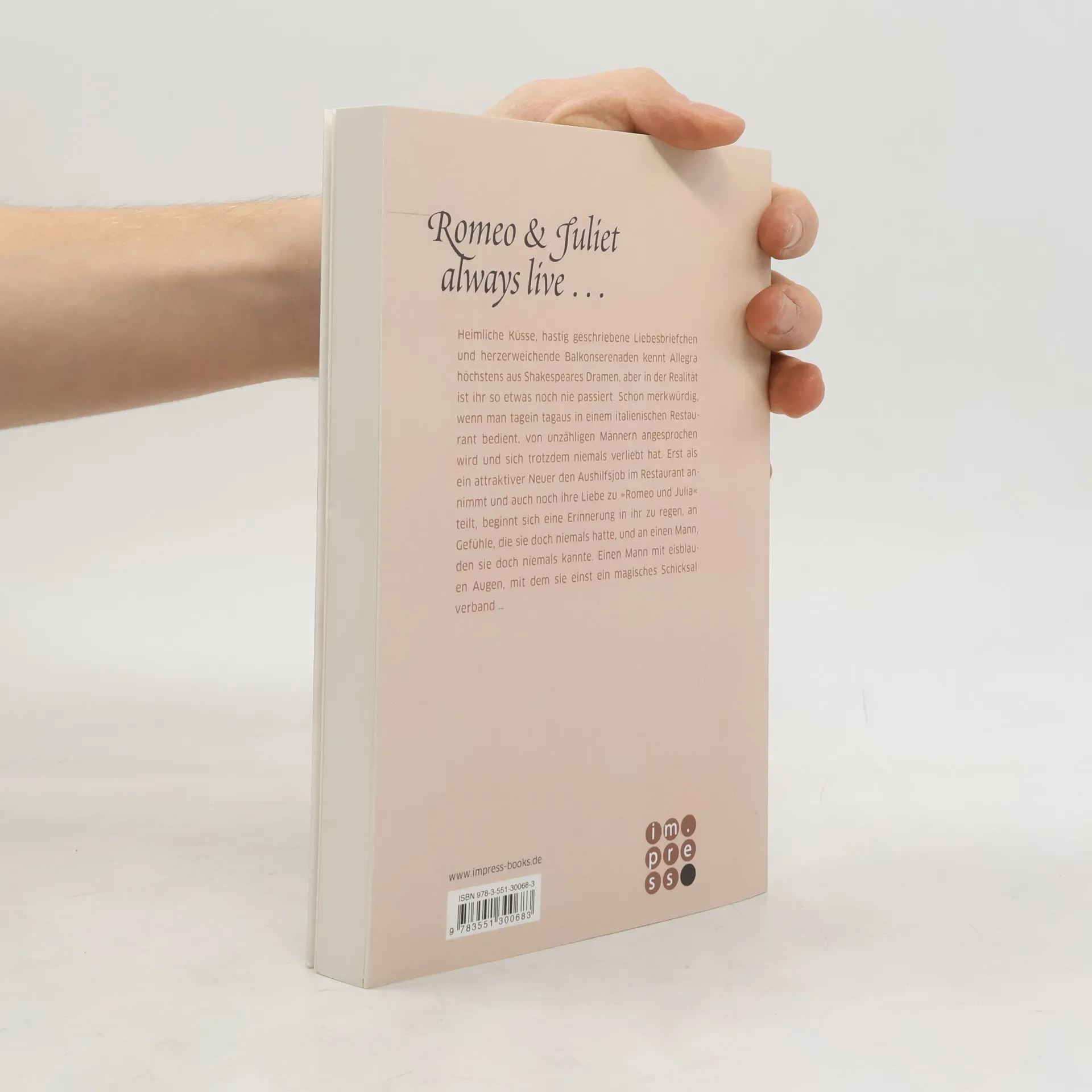 Allegra kennt heimliche Küsse, hastig geschriebene Liebesbriefchen und herzerweichende Balkonserenaden nur aus Shakespeares Dramen. In der Realität, wo sie in einem italienischen Restaurant arbeitet und von vielen Männern angesprochen wird, hat sie jedoch nie die Liebe gefunden. Das ändert sich, als ein attraktiver neuer Aushilfsmitarbeiter ins Restaurant kommt, der ihre Leidenschaft für "Romeo und Julia" teilt. Plötzlich erwachen in Allegra Erinnerungen an Gefühle, die sie nie erlebt hat, und an einen geheimnisvollen Mann mit eisblauen Augen, mit dem sie einst ein magisches Schicksal verband. Als Allegra eines Tages die Restauranttür öffnet, trifft sie auf diesen jungen Mann. Seine Augen, ein strahlendes Blau, das fast violett wirkt, ziehen sie in ihren Bann und wecken ein Gefühl von Déjà-vu in ihr, das sie nicht ganz fassen kann. Die Begegnung lässt sie an eine tiefere Verbindung denken, die sie in ihrem bisherigen Leben vermisst hat. Die "Luca & Allegra"-Reihe, die die Nachfahren von Romeo und Julia verfolgt, ist abgeschlossen und umfasst mehrere Bände, die die Geschichte von Luca und Allegra erzählen.